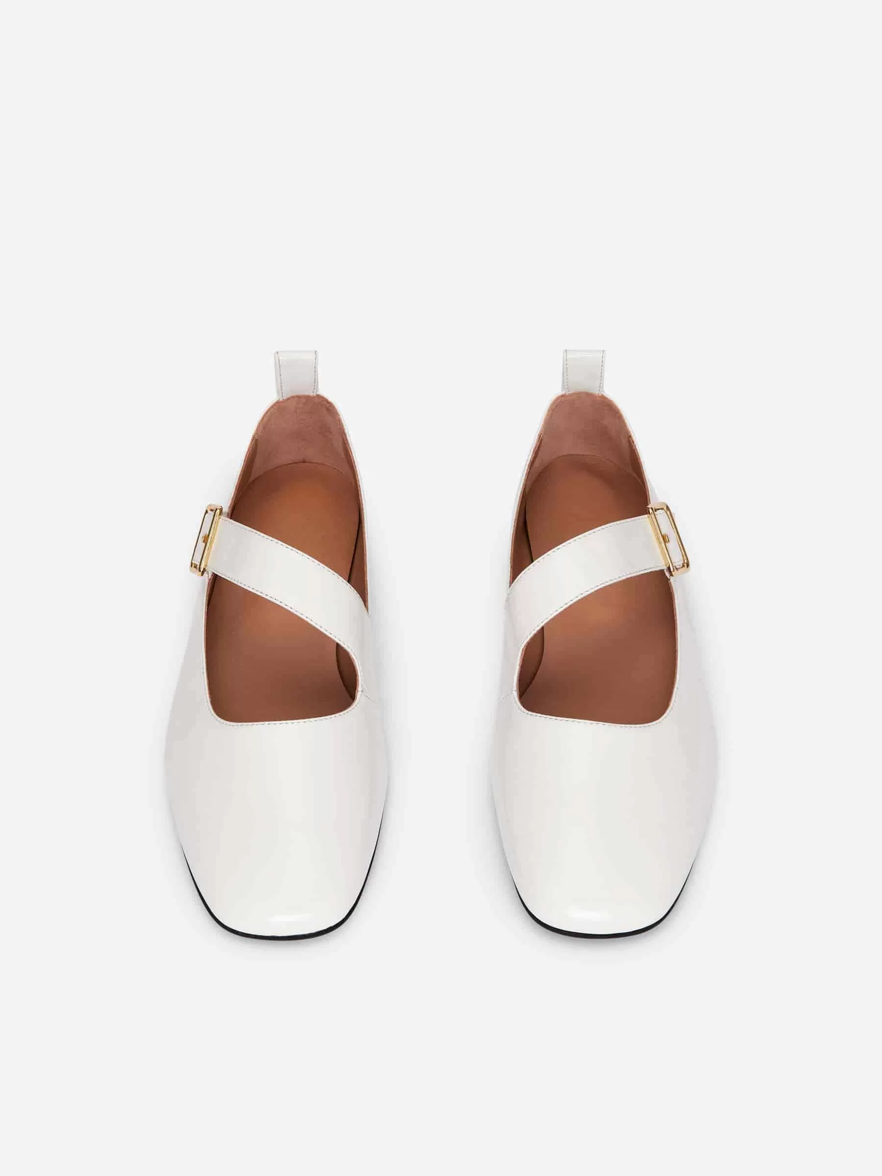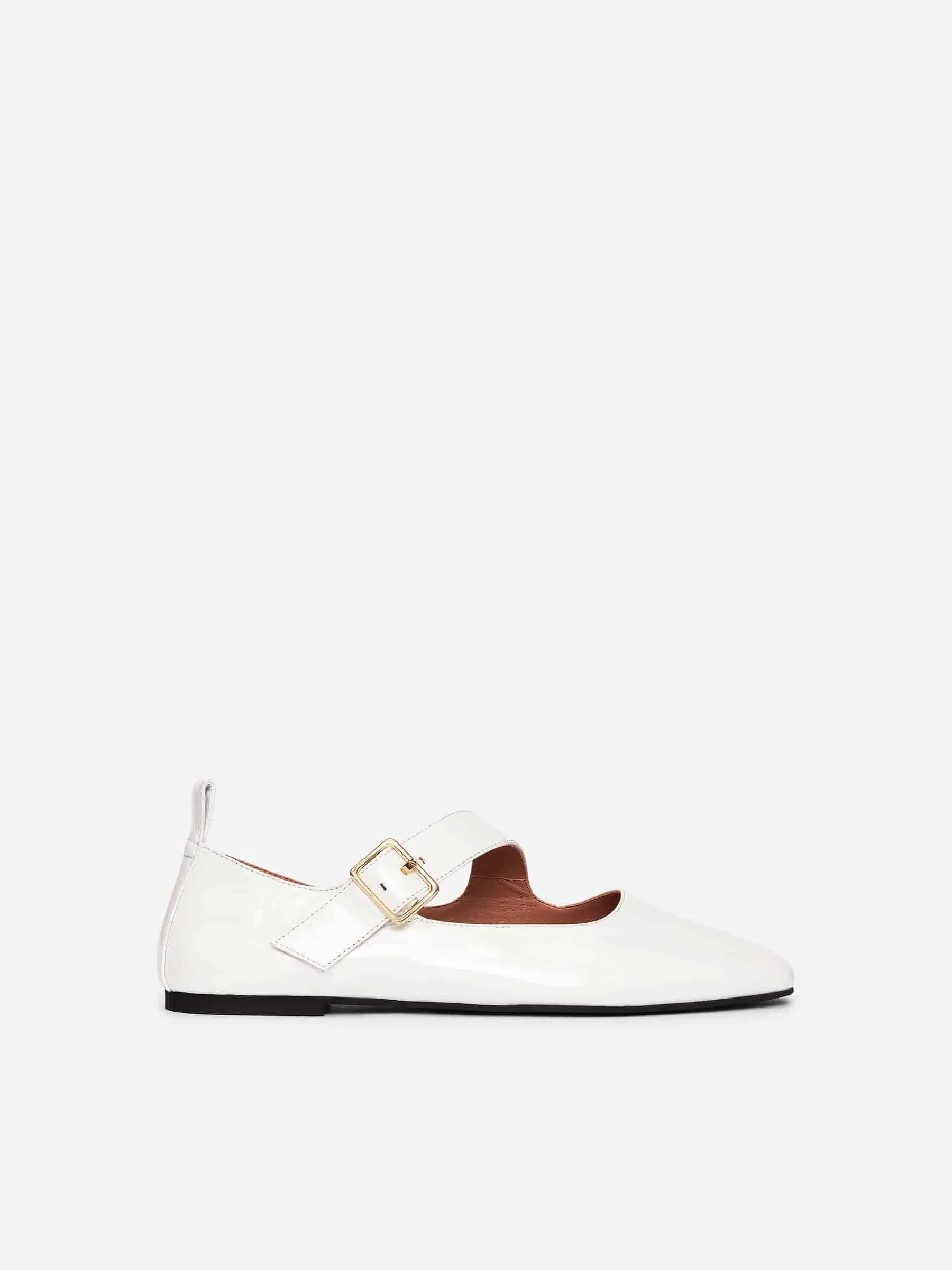 Ballerinas im Mary-Jane-Stil aus glänzendem Leder. Breite, verstellbare Träger mit goldfarbener Schnalle.