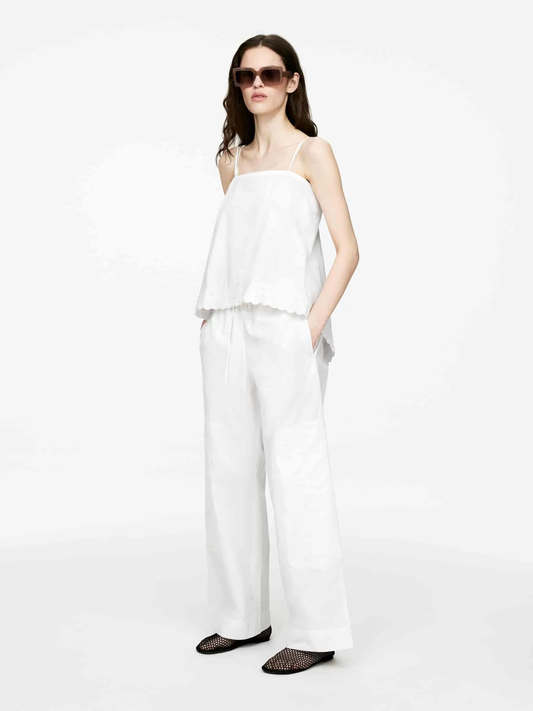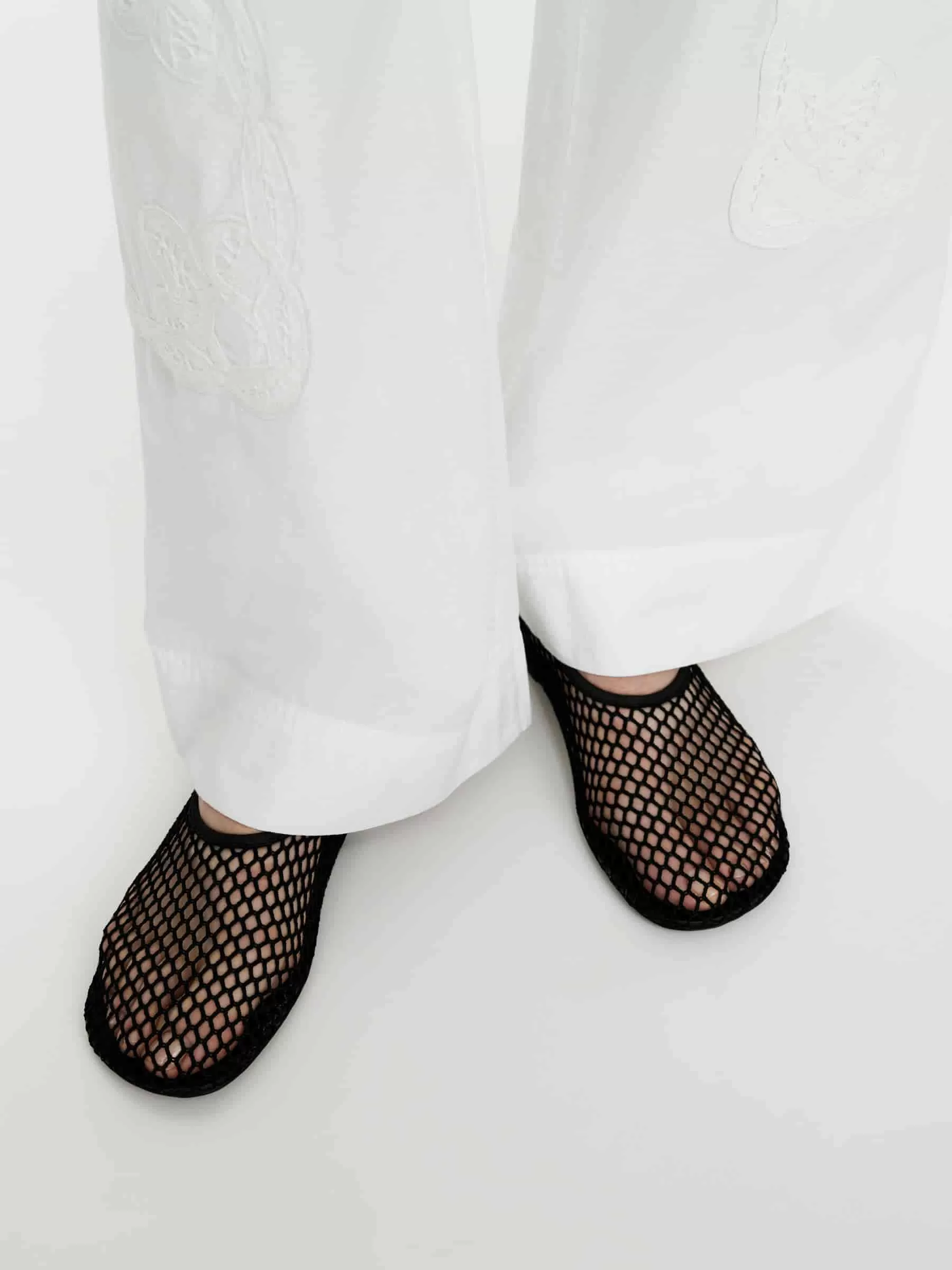 Flacher Netzstoff mit elastischer Einfassung an der Oberkante und rückseitigem Riemenzieher zum einfachen Anziehen. Gummisohle.