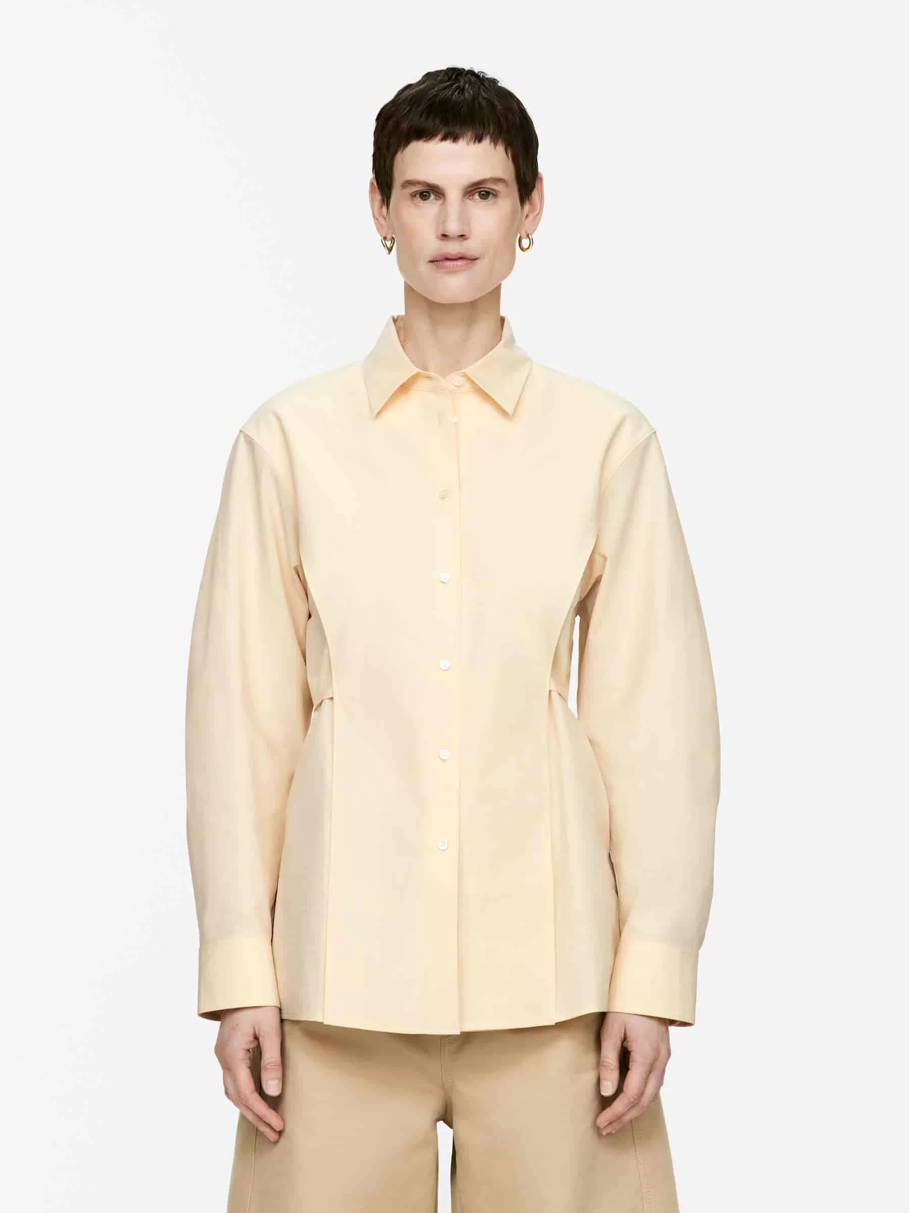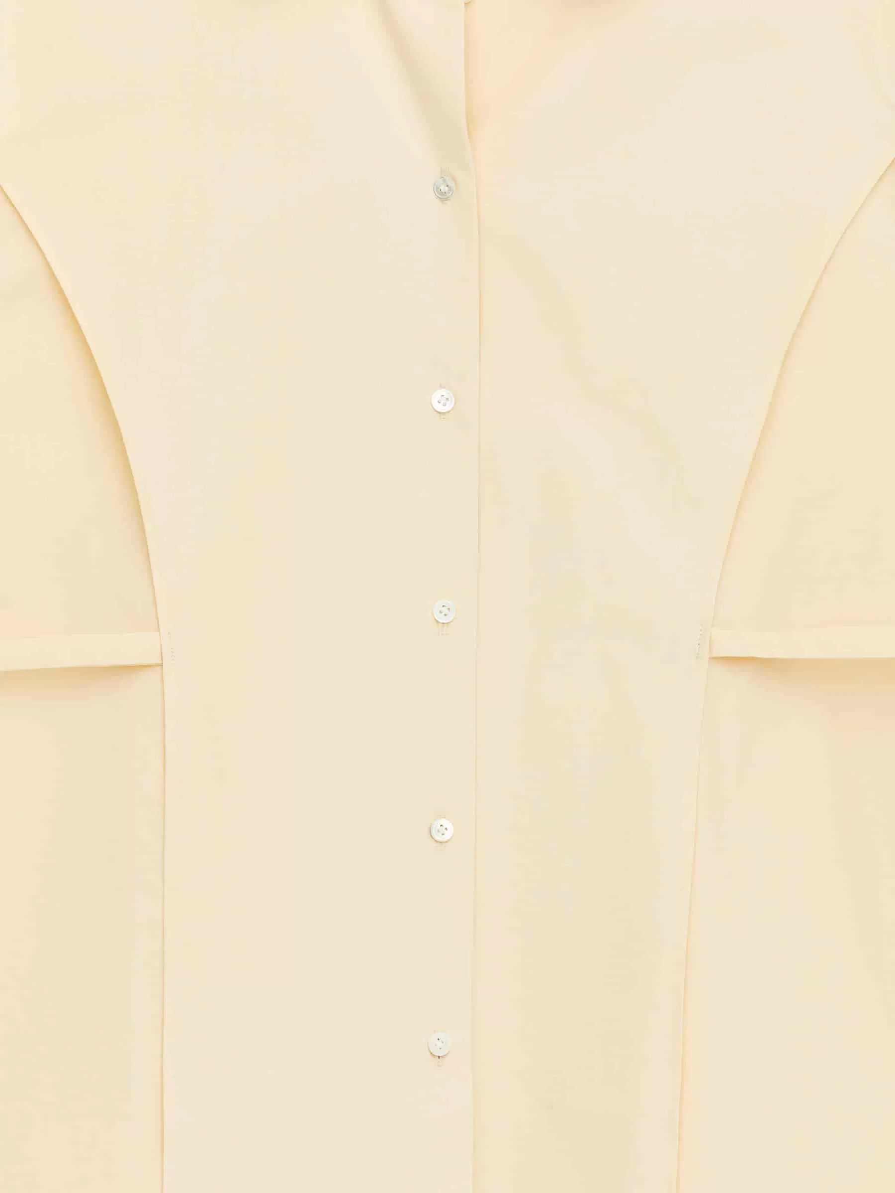 Baumwollbluse mit überschnittenen Schultern und voluminösen langen Ärmeln. Schmaler Gürtel zum Binden in der Taille. Für eine normale Passform geschnitten und detailliert mit spitzem Kragen, Knopfleiste vorne und geknöpften Manschetten.