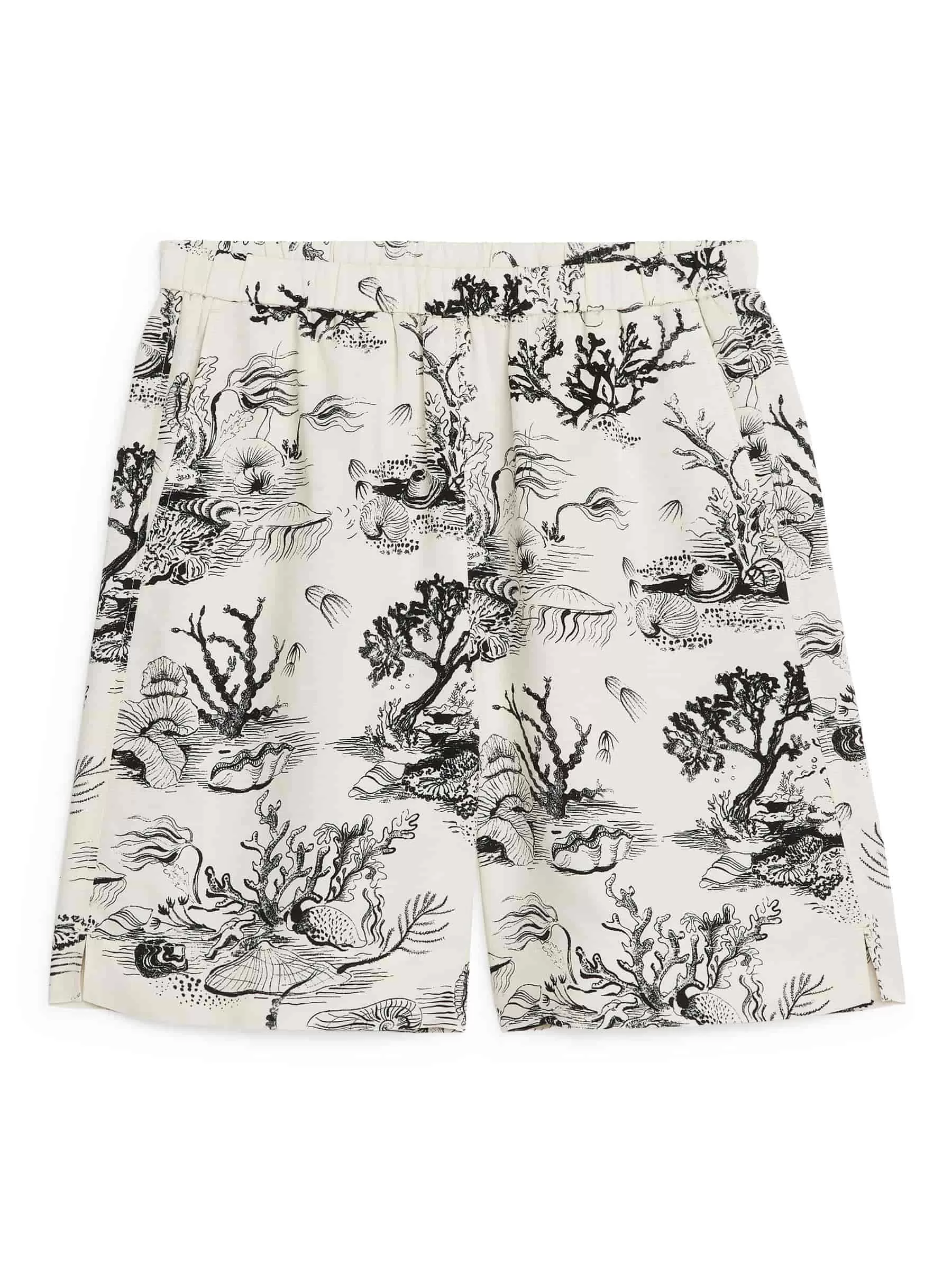 Anziehshorts mit Allover-Print. Ein Modell mit mittlerer Taille, elastischem Bund und Seitentaschen. Der Schnitt reicht bis zur Mitte des Oberschenkels.