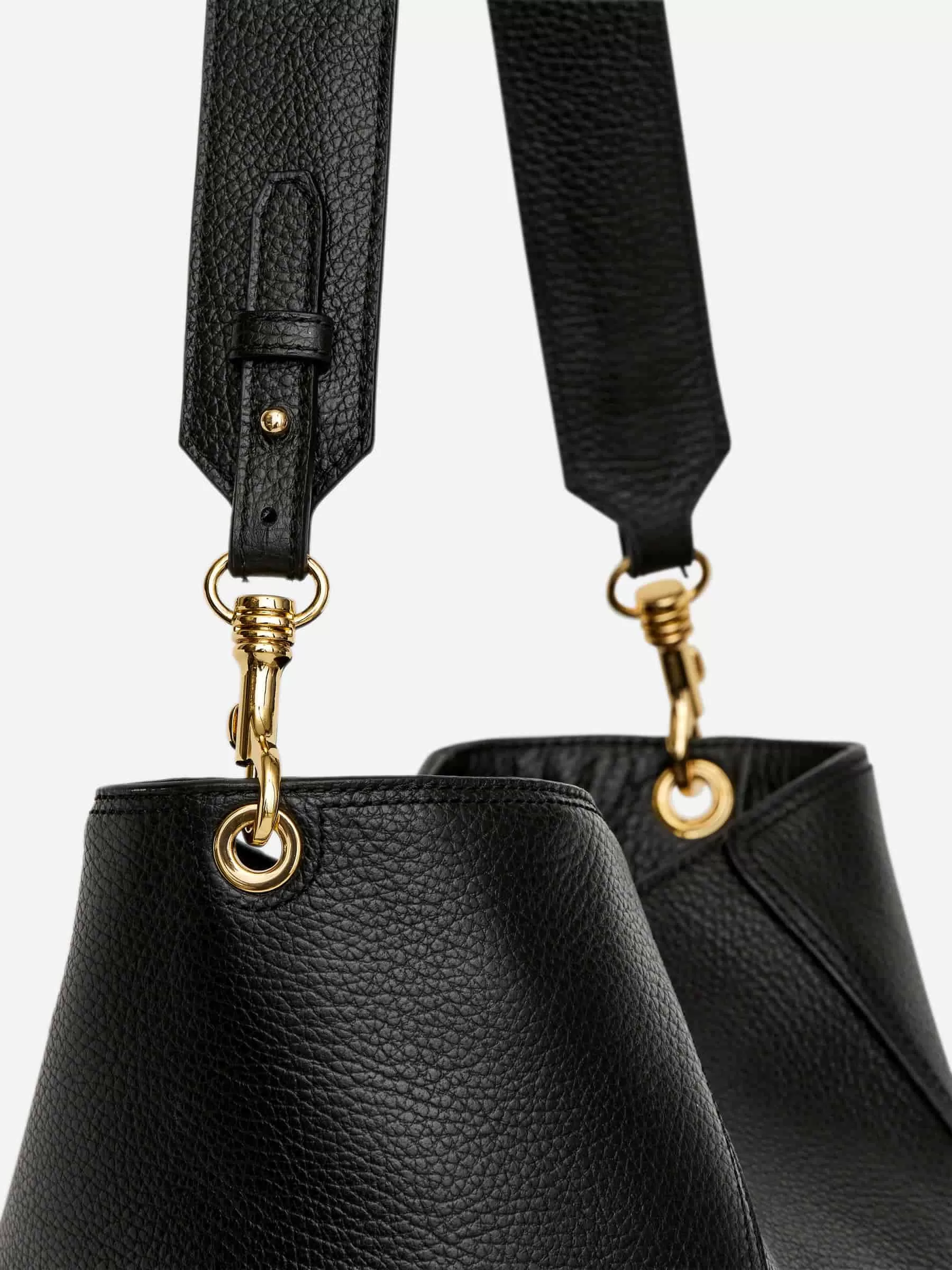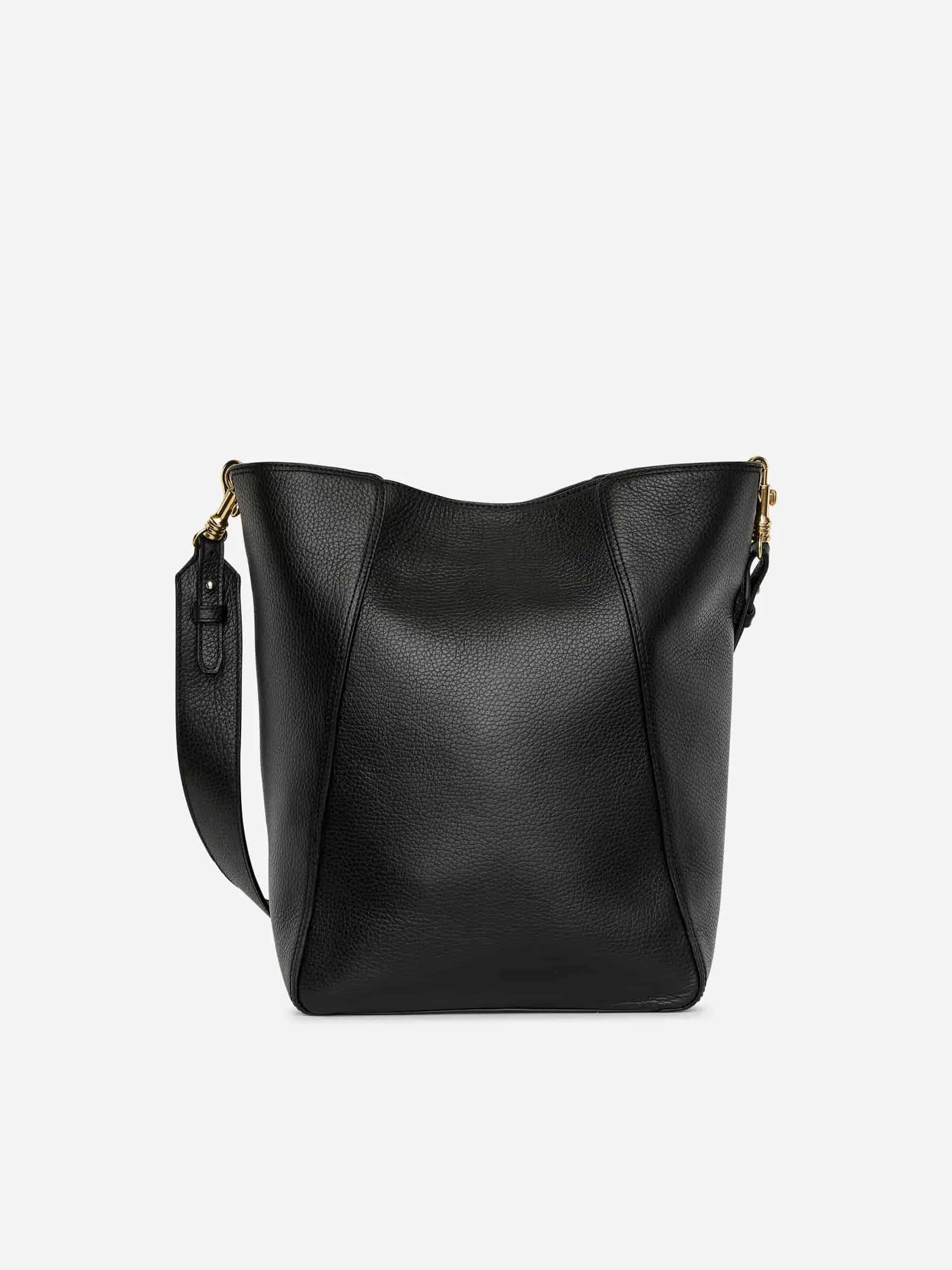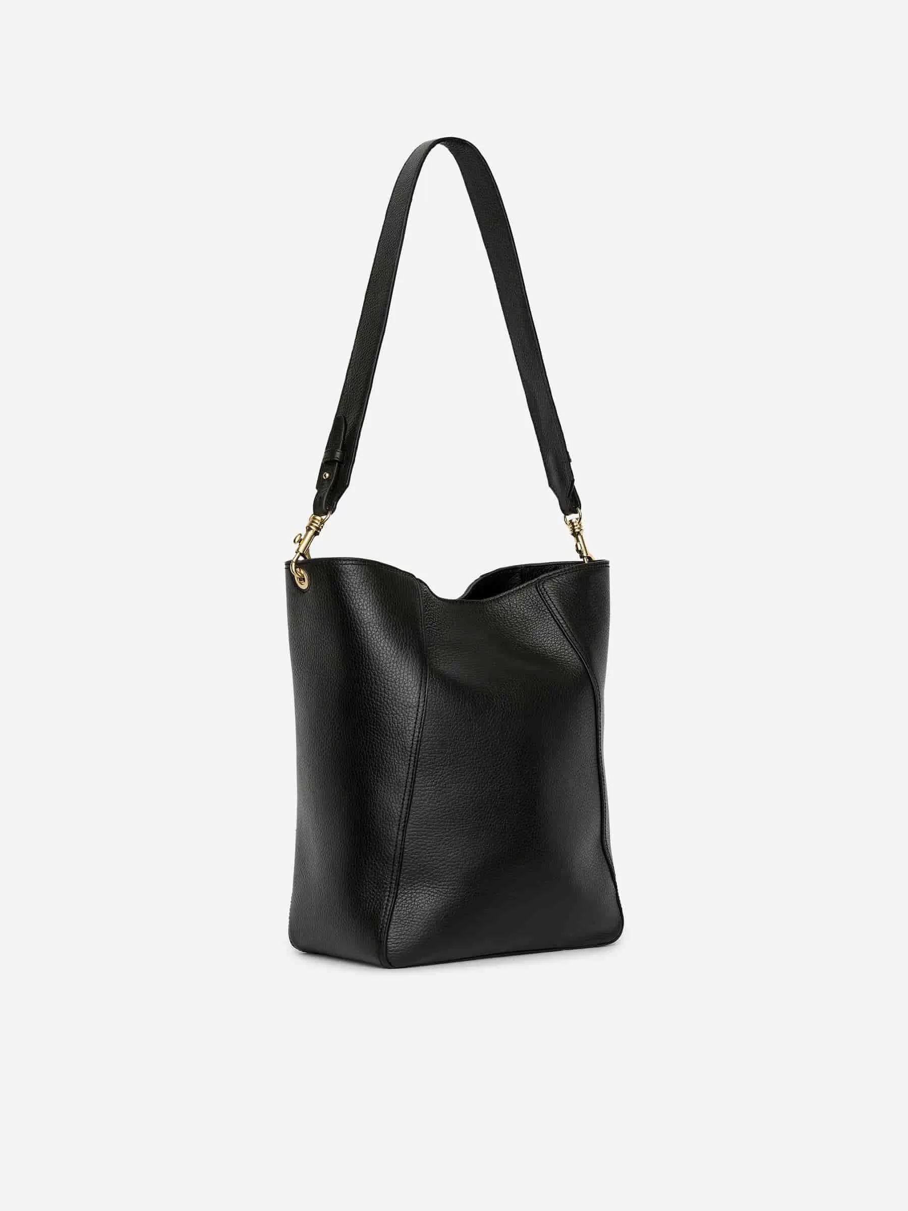 Beuteltasche aus chromfreiem Leder. Verstellbarer Schultergurt mit vergoldeten Haken. Magnetverschluss und Innentasche mit Reißverschluss. Breite 23 cm, Höhe 33 cm, Tiefe 14 cm. Schultergurtlänge 35 cm.