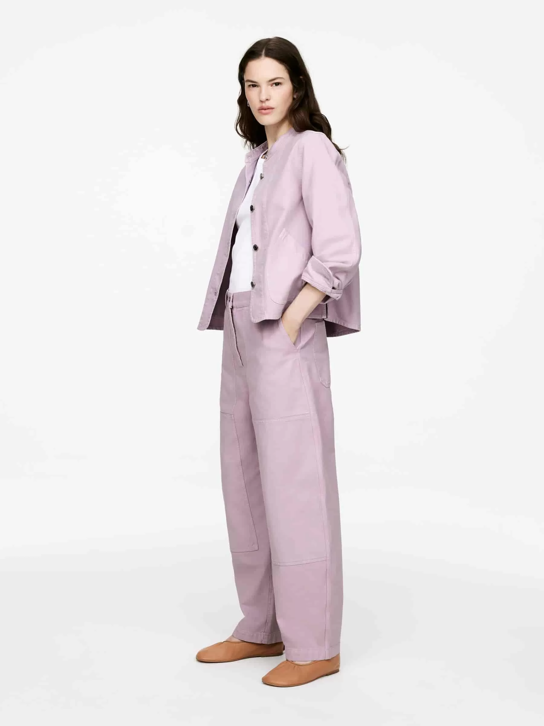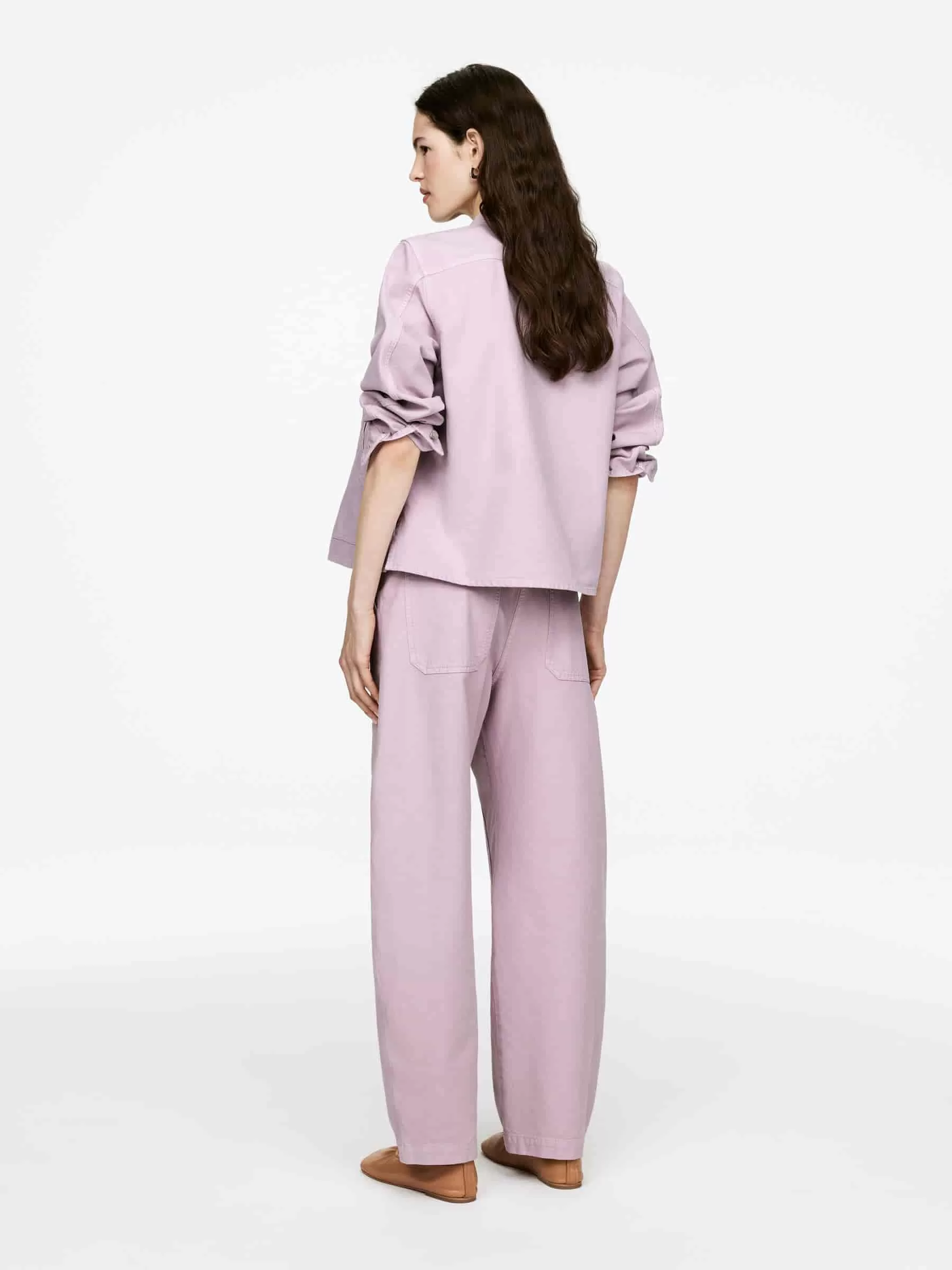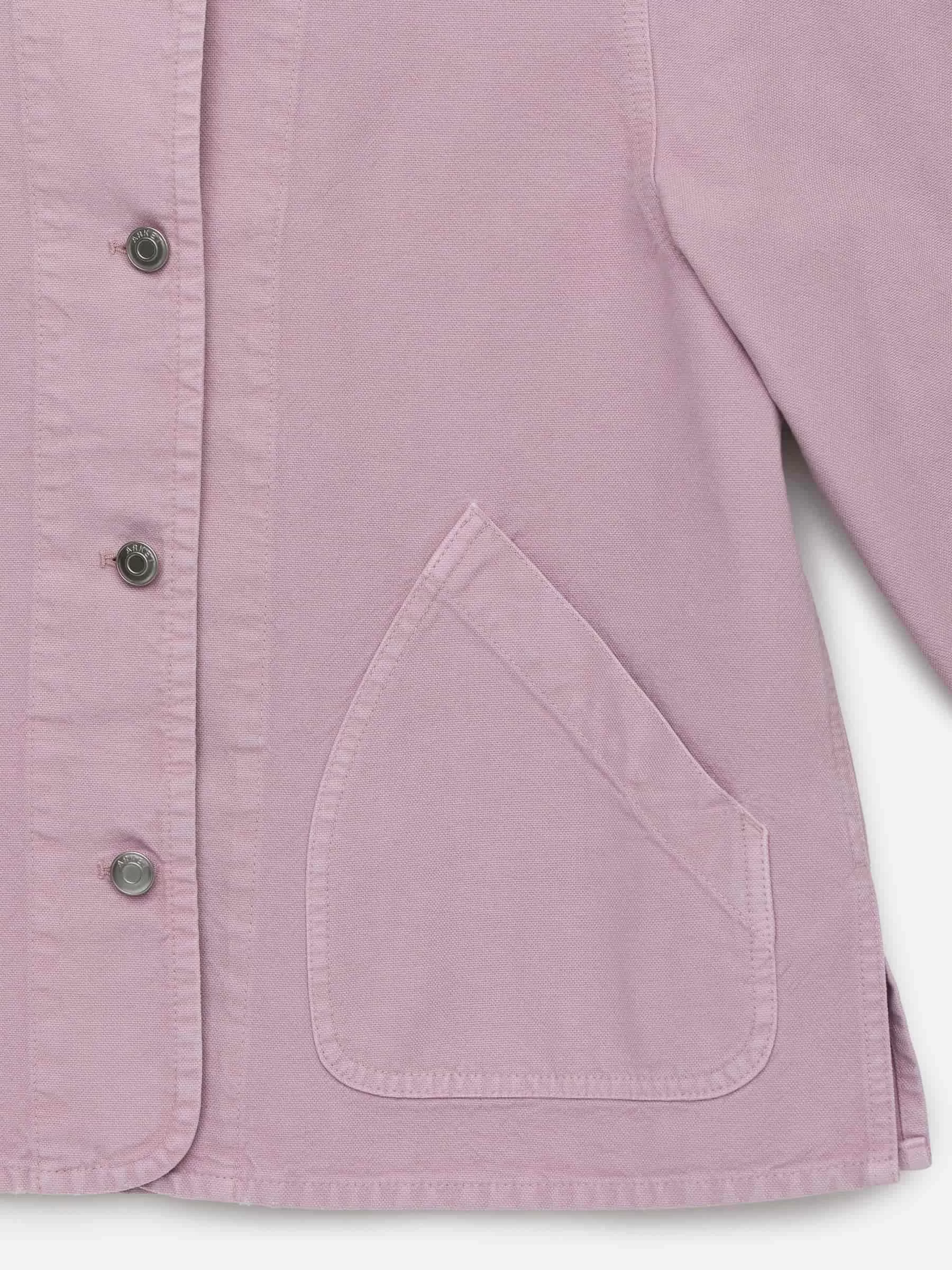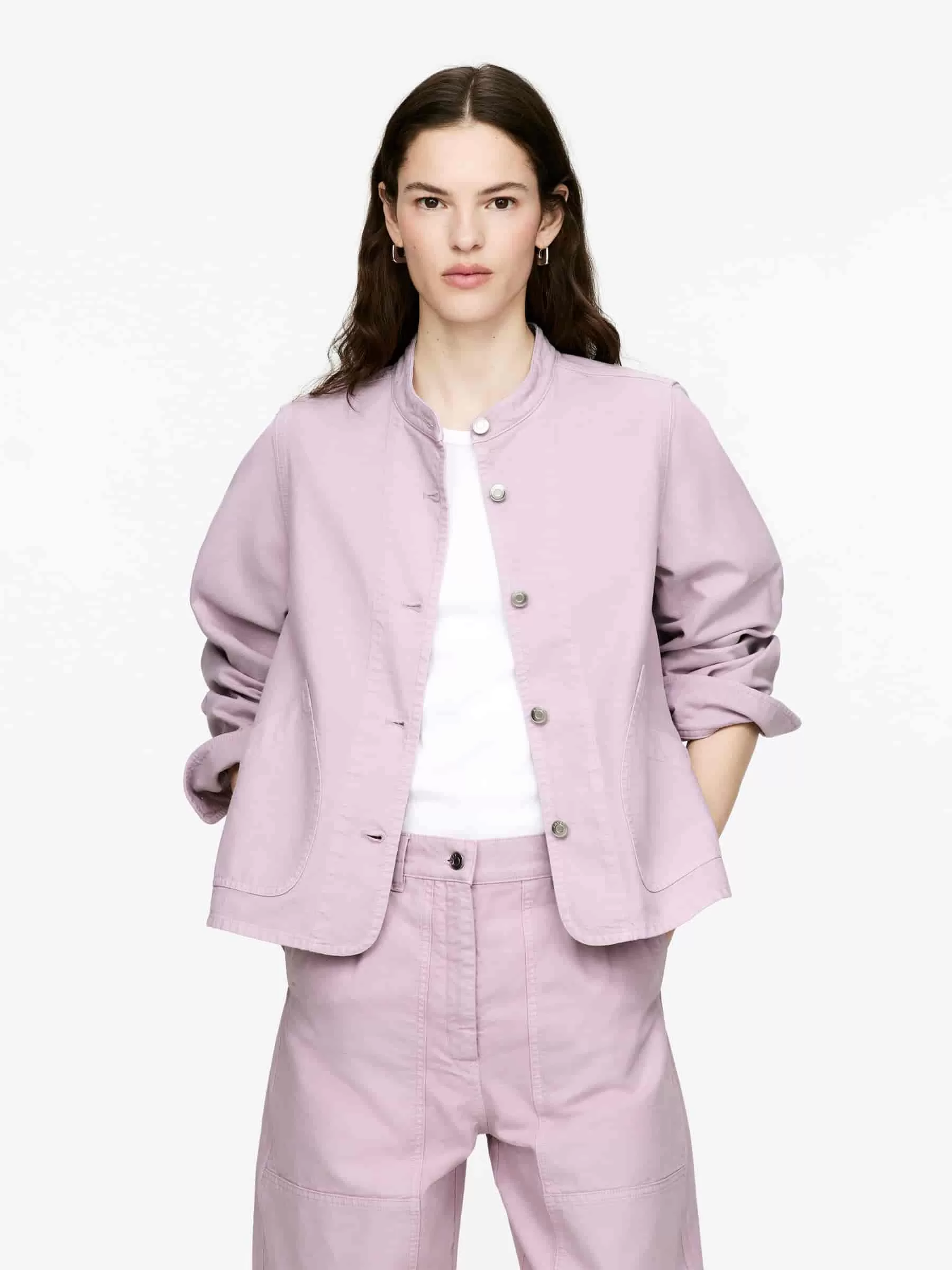 Stückgefärbtes Canvas-Overshirt mit Stehkragen, Ösenknöpfen und Vordertaschen. Normale Passform.