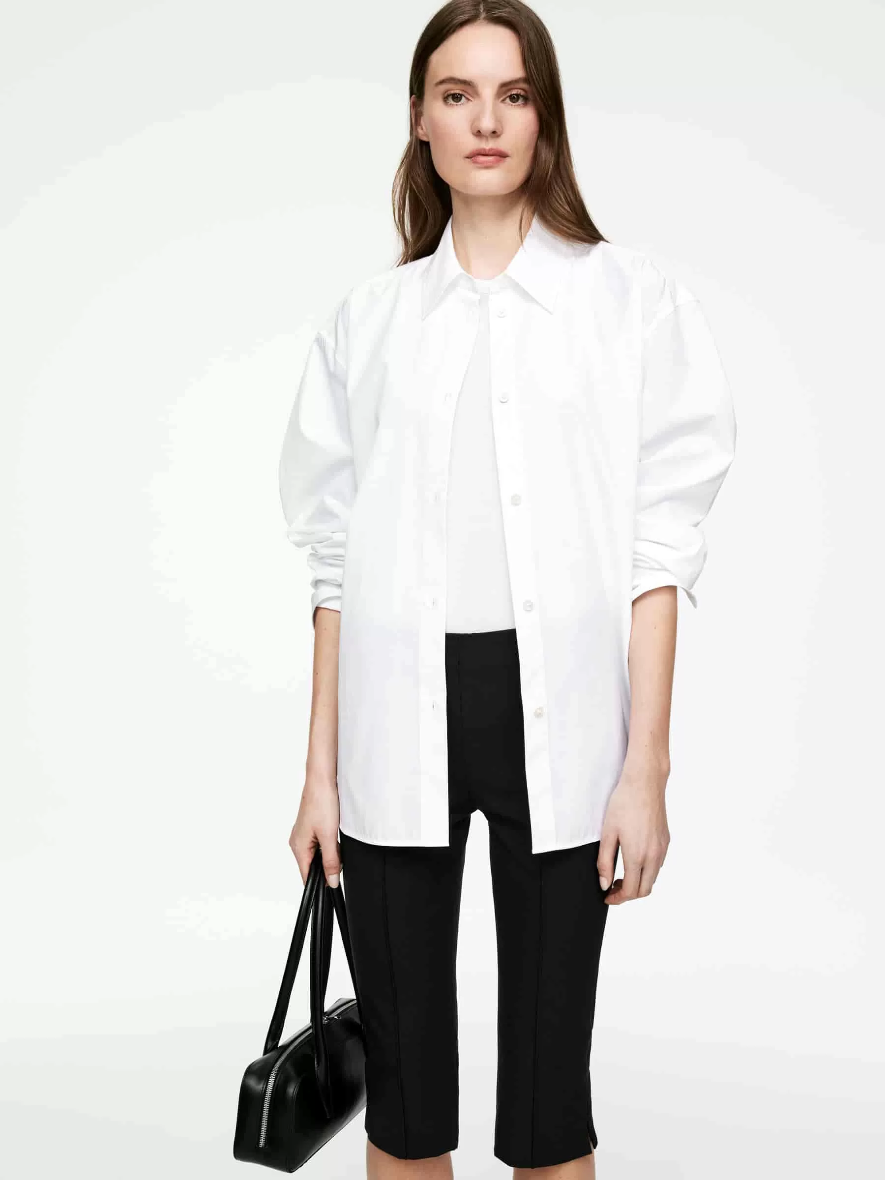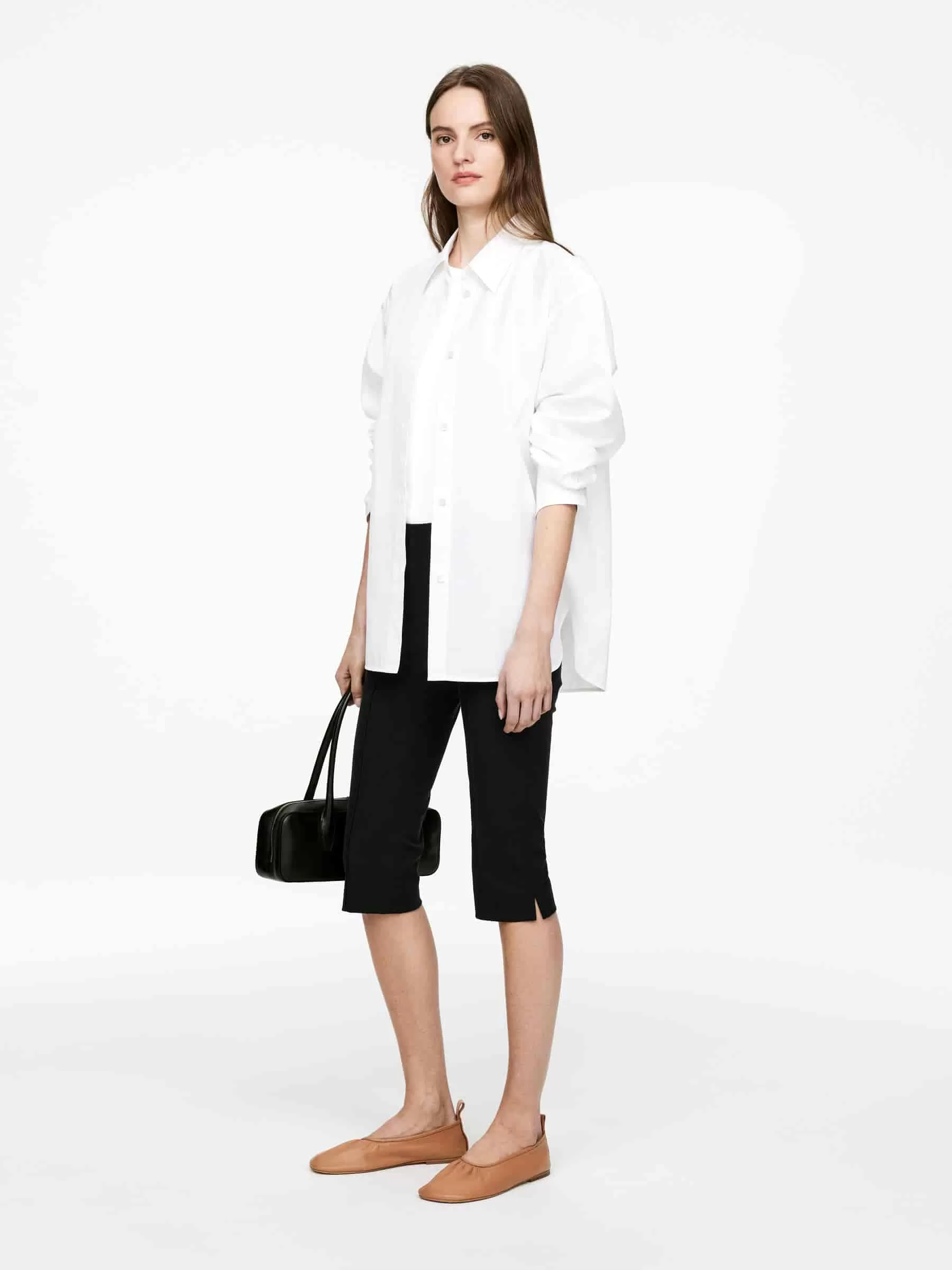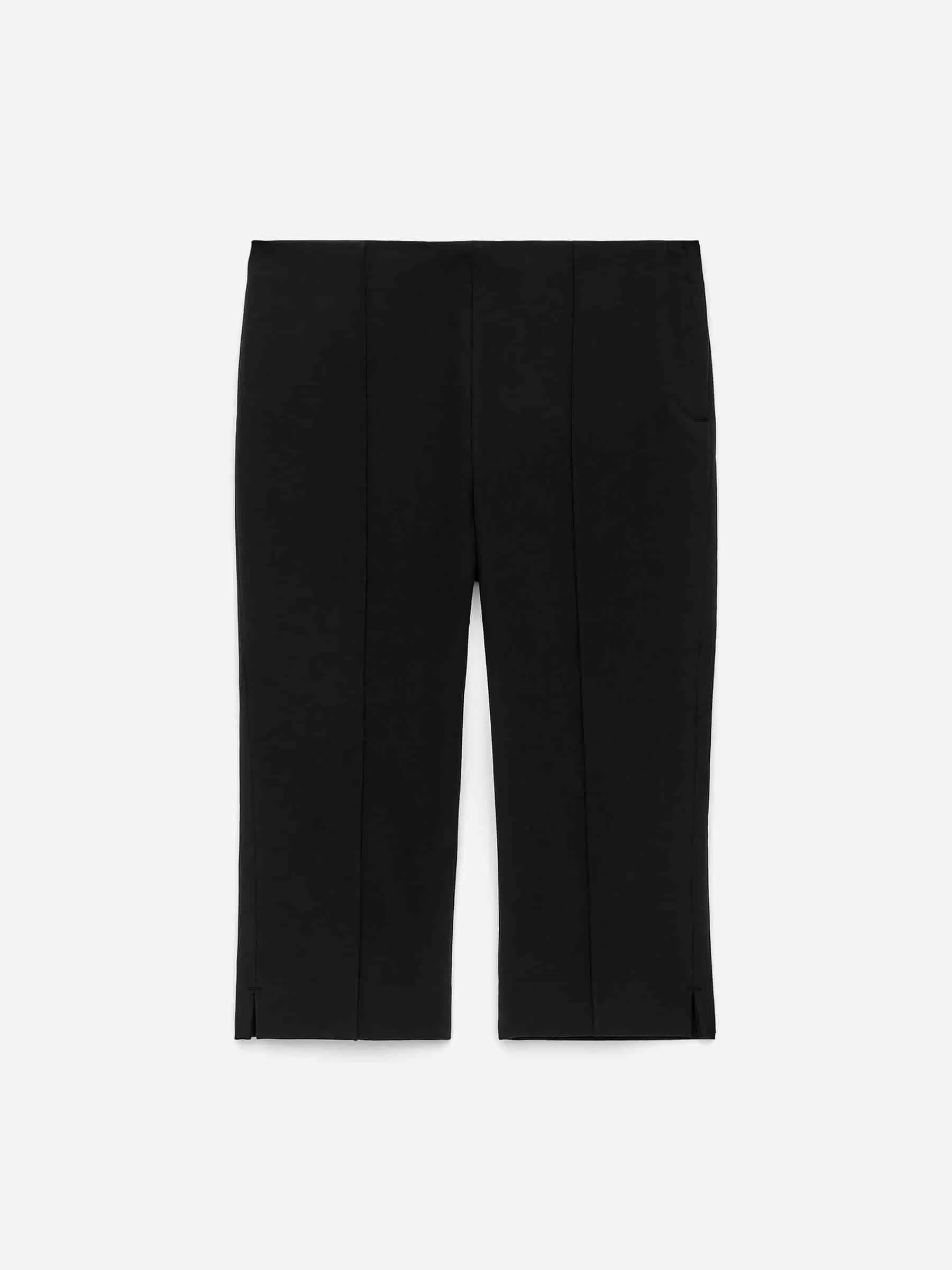 3/4-lange Hose aus gewebtem Stretchstoff aus Baumwolle. Gummizug in der Taille und versteckter Reißverschluss an einer Seite. Zwei einzelne Leistentaschen hinten und kleiner Schlitz am Saum.