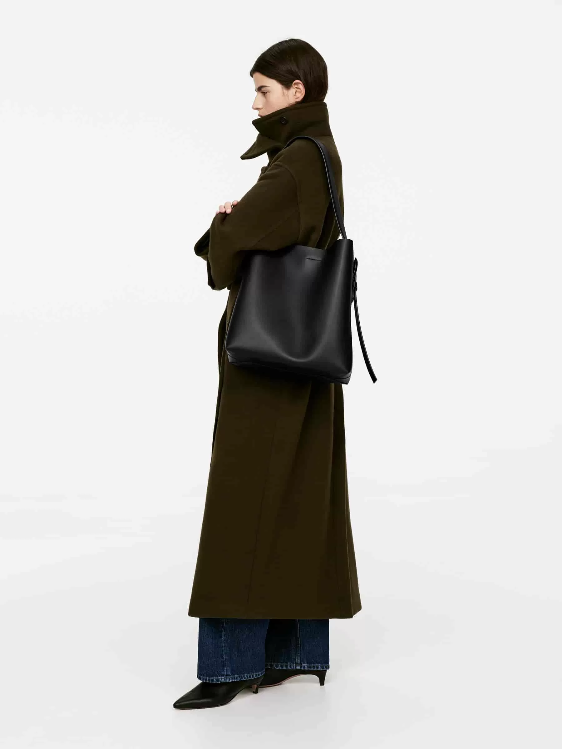 Tragetasche mit halbfester Haptik und geräumig genug für einen Laptop. Ausgestattet mit einem verstellbaren, fünf Zentimeter breiten Schultergurt und Magnetverschluss. Innenfach mit Reißverschluss. Abmessungen 35 cm x 32 cm x 13 cm.