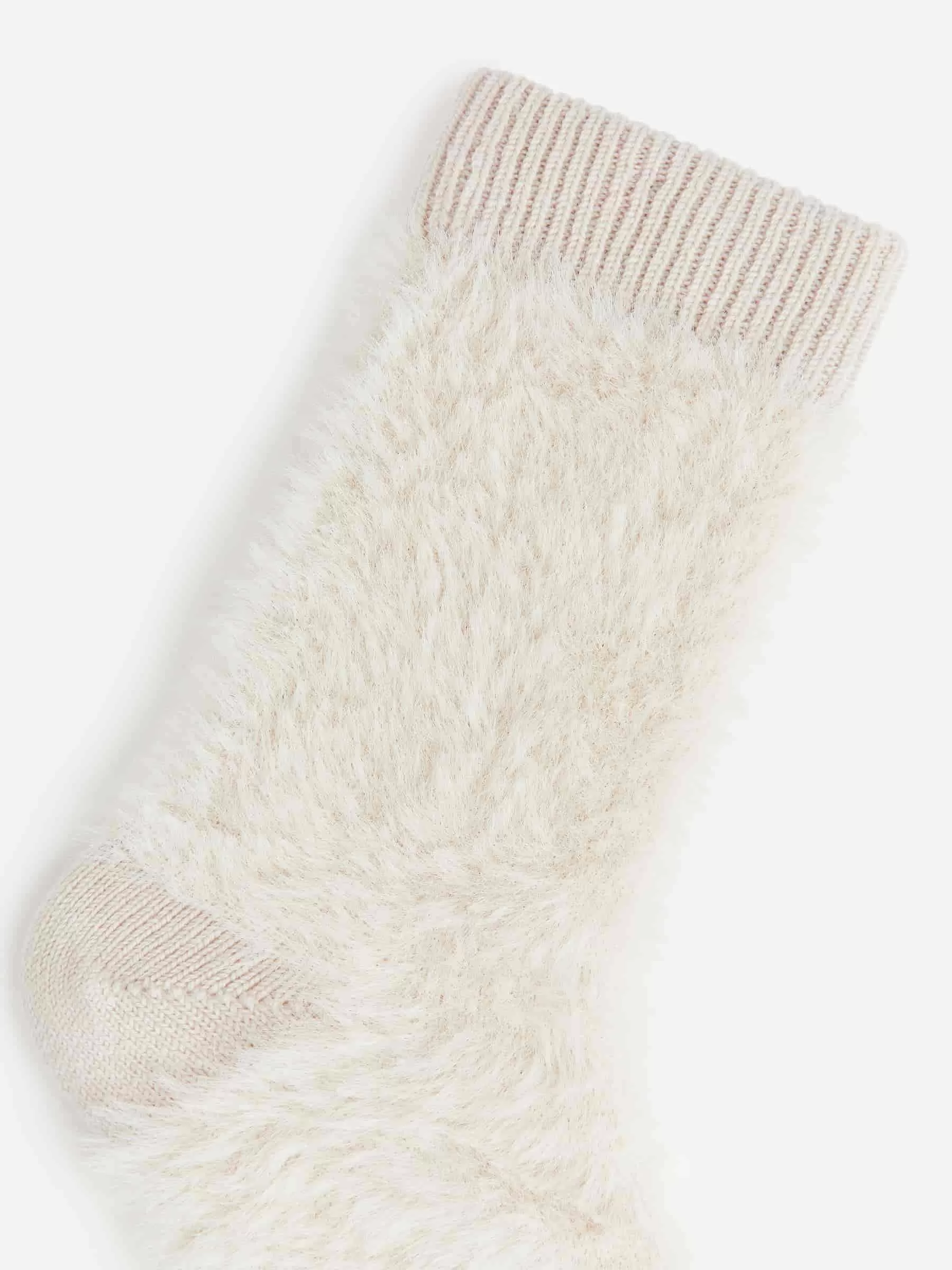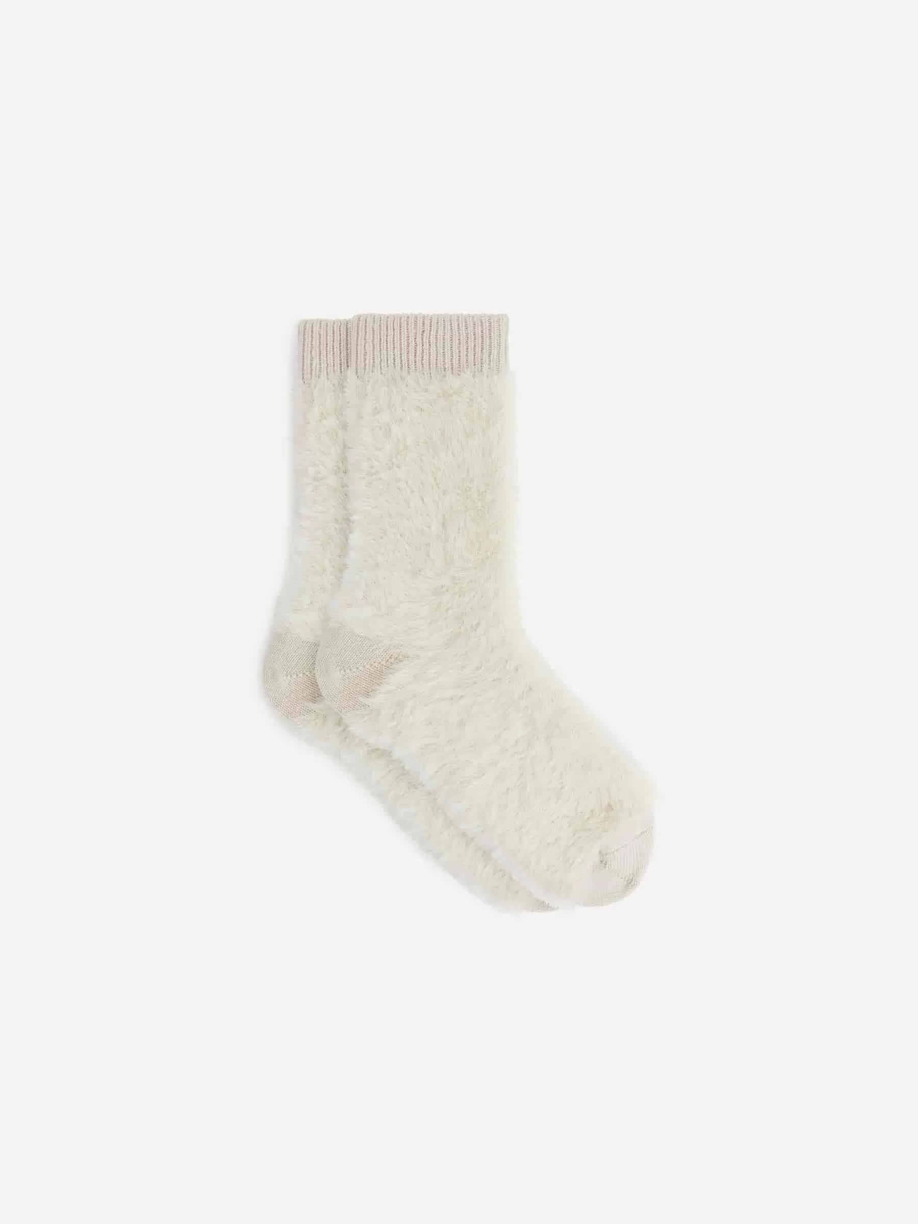 Socken mit flauschiger Struktur aus einer dehnbaren Mischung aus Polyamid und Wolle. Kombiniert mit gerippten Oberteilen. Diese Socken enthalten 16 % RWS-Wolle, zertifiziert durch die Kontrollunion 811083. Produkte, die nach dem Responsible Wool Standard (RWS) zertifiziert sind, enthalten Wollfasern von Farmen, die unabhängig nach Tierschutz- und Landbewirtschaftungsanforderungen zertifiziert sind.