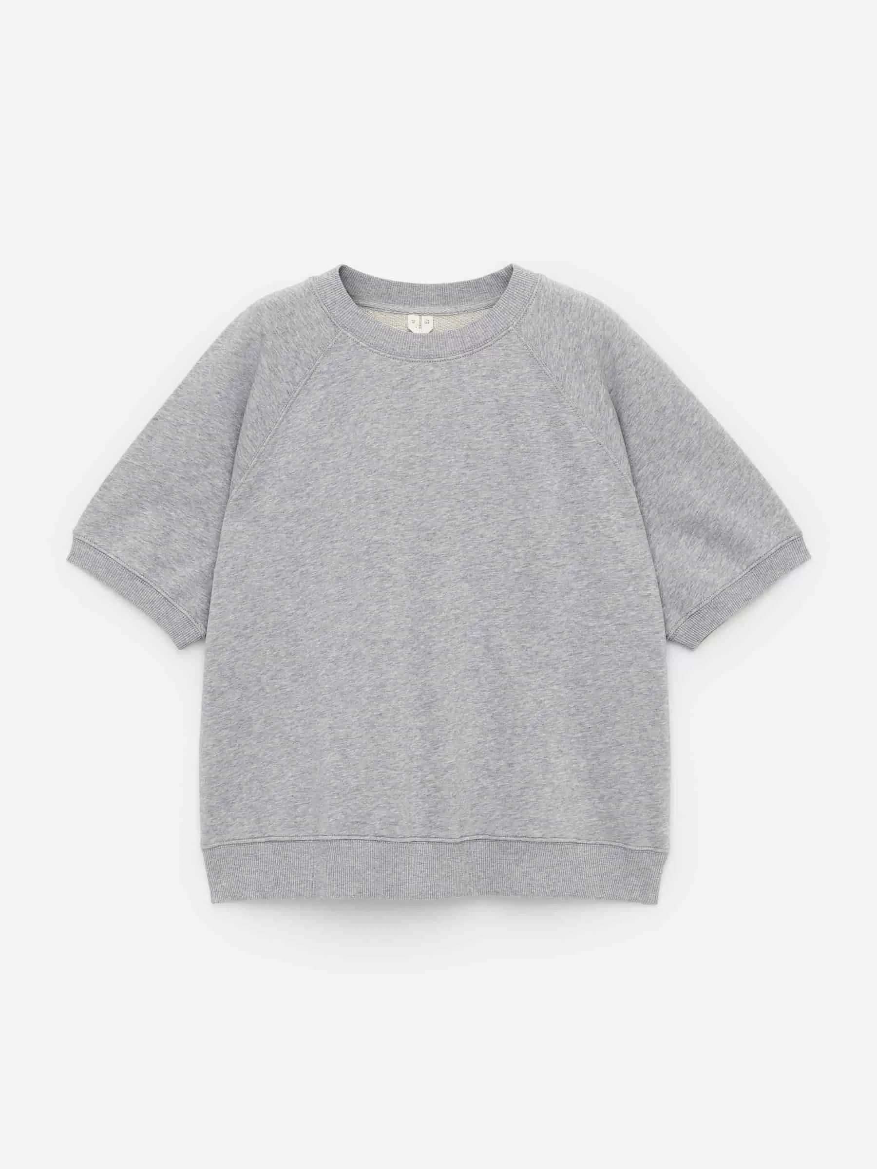 Kurzärmeliges Sweatshirt aus Baumwolle mit einer French-Terry-Unterseite für feuchtigkeitsableitende Eigenschaften. Ein Rundhalsausschnitt mit Raglanärmeln und Rippstrickbesätzen. Normale Passform.