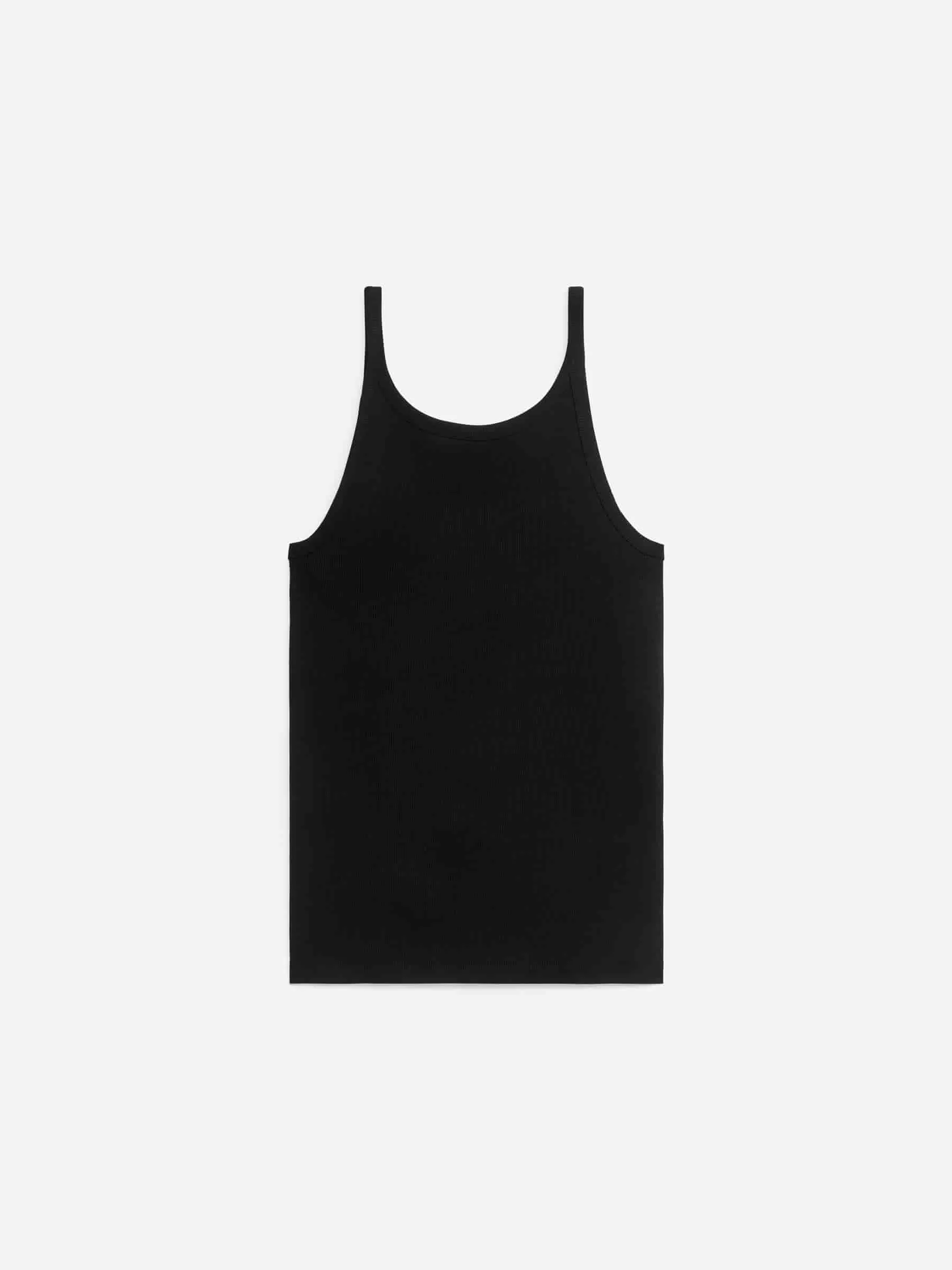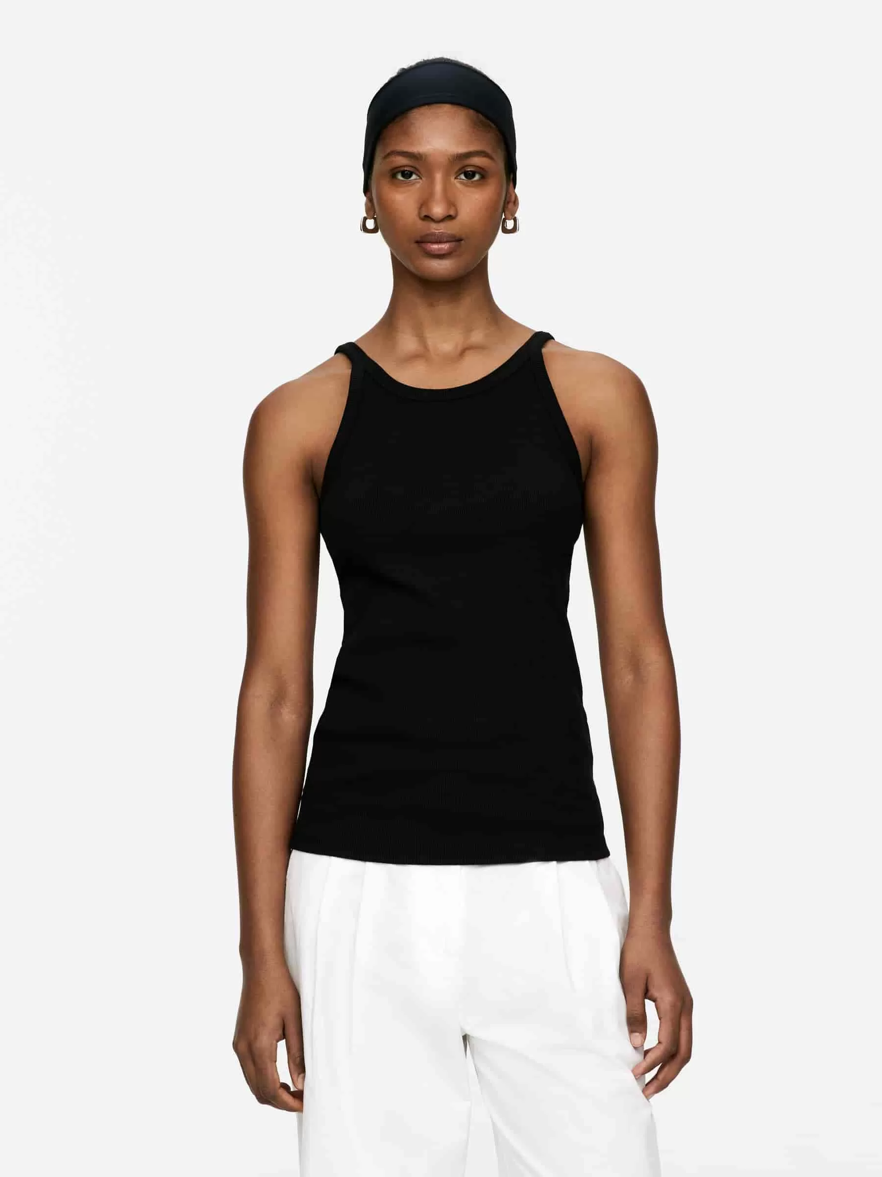 Geripptes Tanktop aus Baumwolle. Ein schmal geschnittenes Modell mit schmalen Trägern und rundem Ausschnitt.