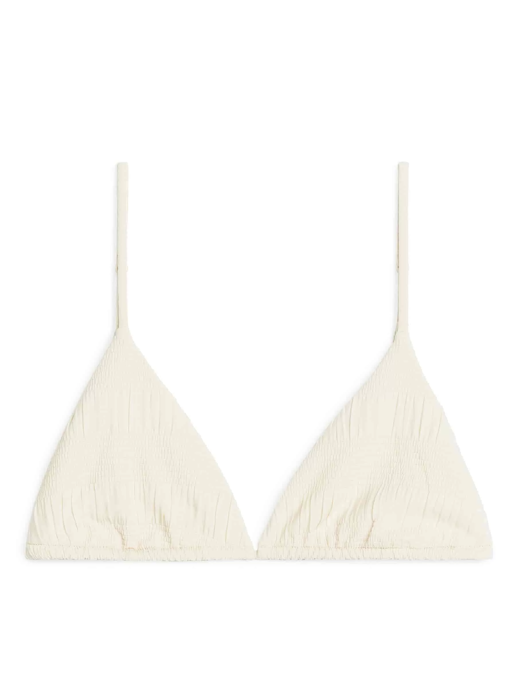 Triangel-Bikinioberteil aus dehnbarem Stoff mit gesmokten Details. Ein vollständig gefütterter Stil mit schmalen, verstellbaren Trägern. Geringe Unterstützung.