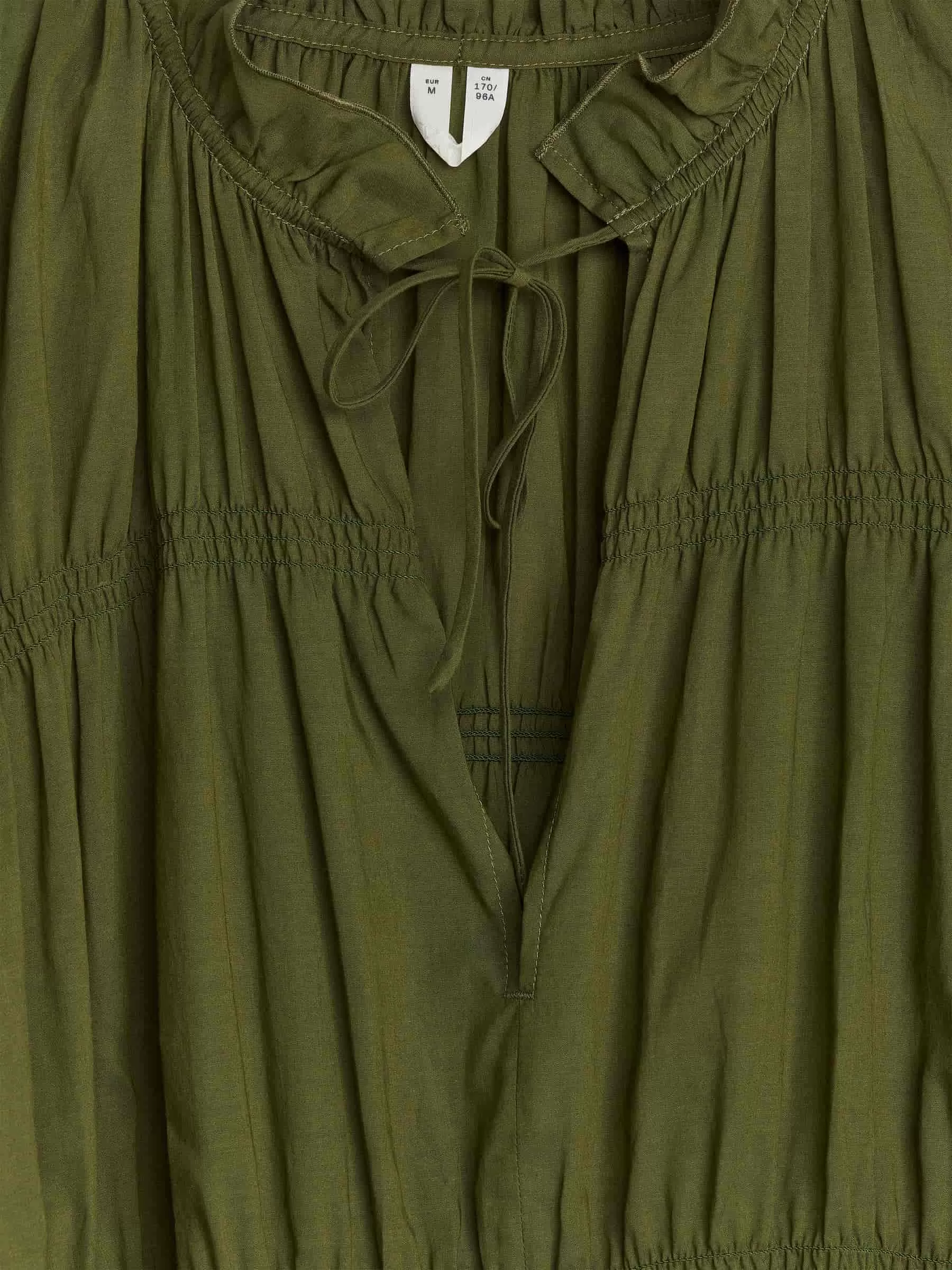 Maxikleid mit langen Ärmeln und lockerer Passform. Ausgestattet mit einem Kordelzug am Hals und elastischen Smok-Details.