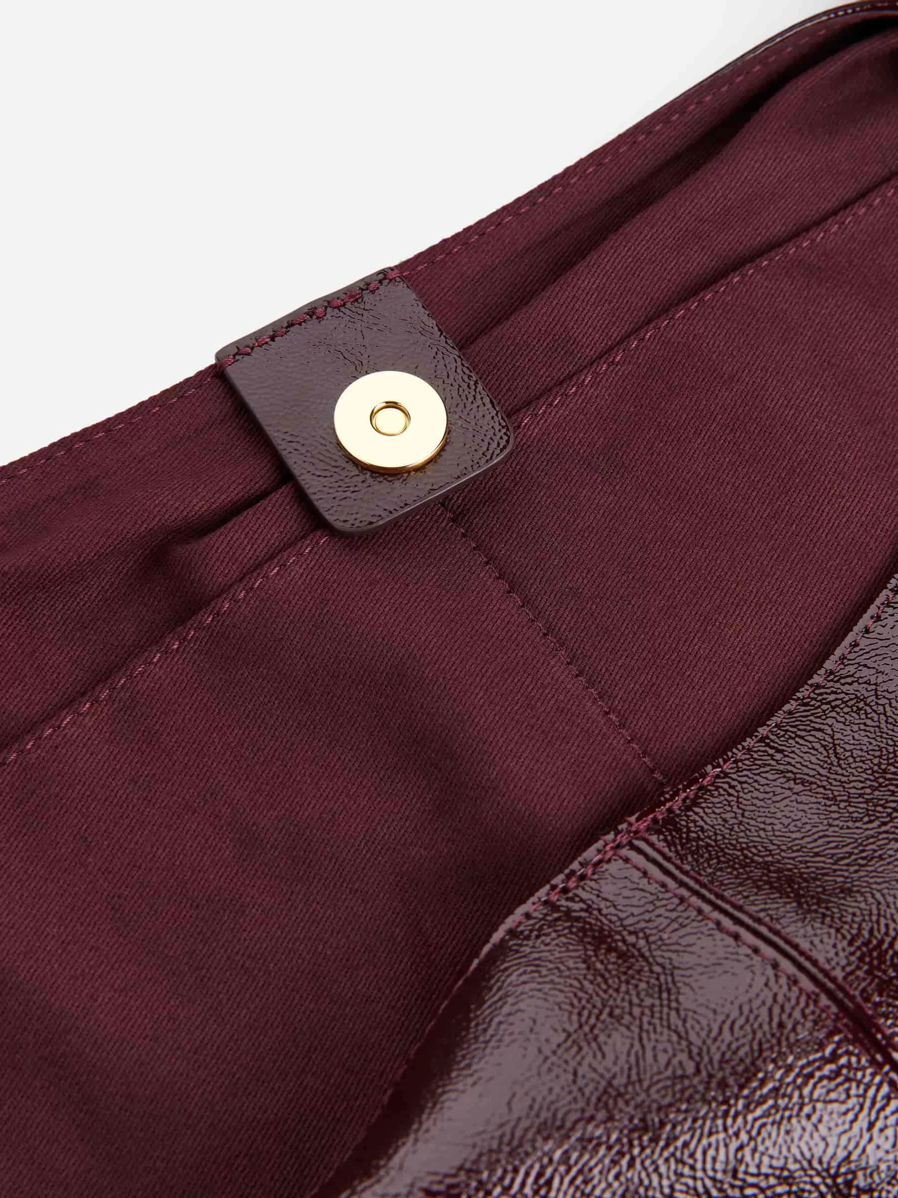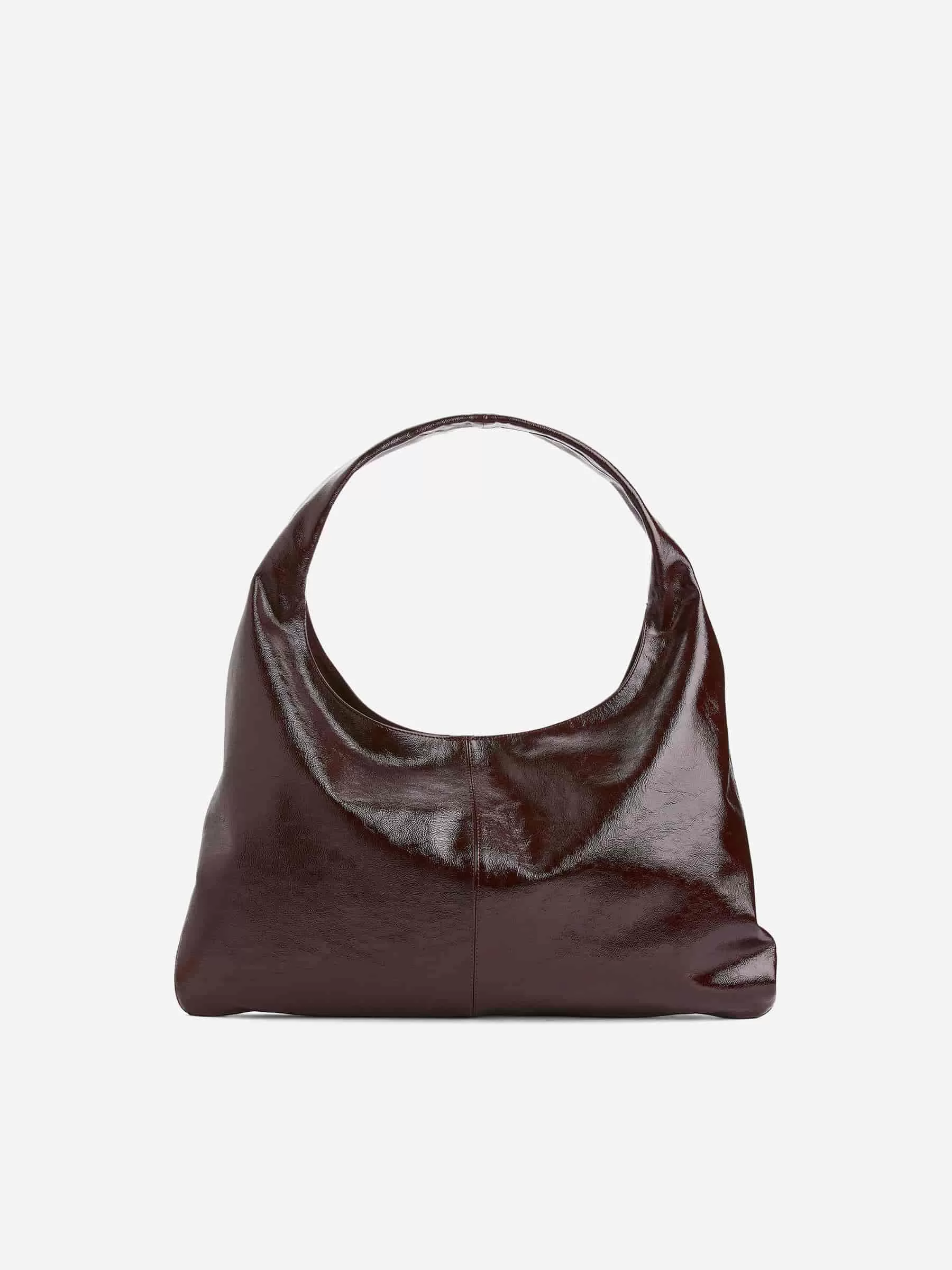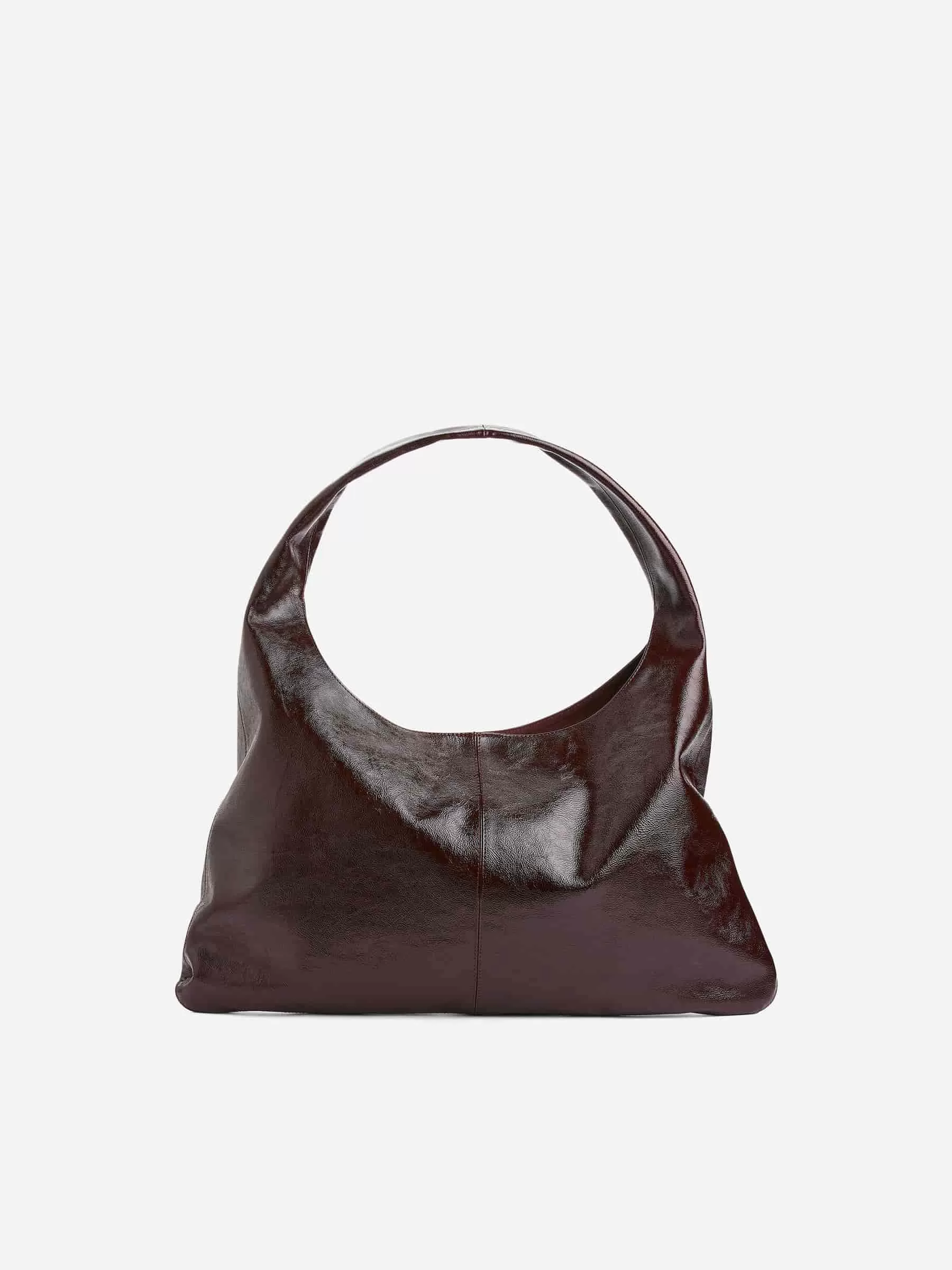 Ledertasche mit glänzendem Finish. Ein flacher Stil mit einem lässigen Look, wenn er über der Schulter getragen wird. Ziernaht in der Mitte. Magnetverschluss und Innentasche ohne Reißverschluss. Breite 54 cm, Höhe 31 cm, Tiefe 17 cm.