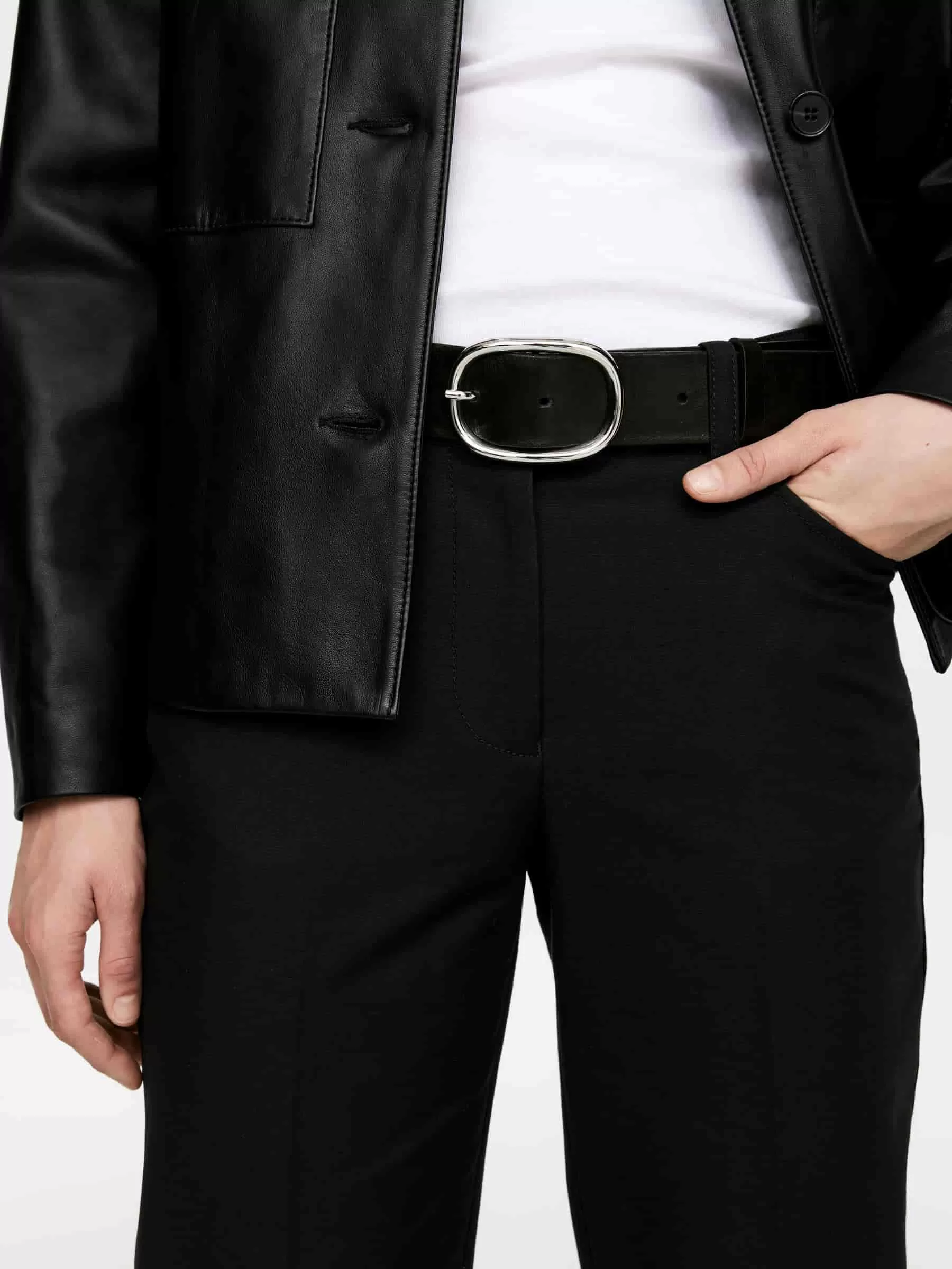 Schmal geschnittene Hose mit Bügelfalten vorne. Entworfen mit einer mittelhohen Taille und geraden Beinen. Reißverschluss und Knopfverschluss. Vordertaschen und Leistentaschen mit Knopfverschluss hinten.