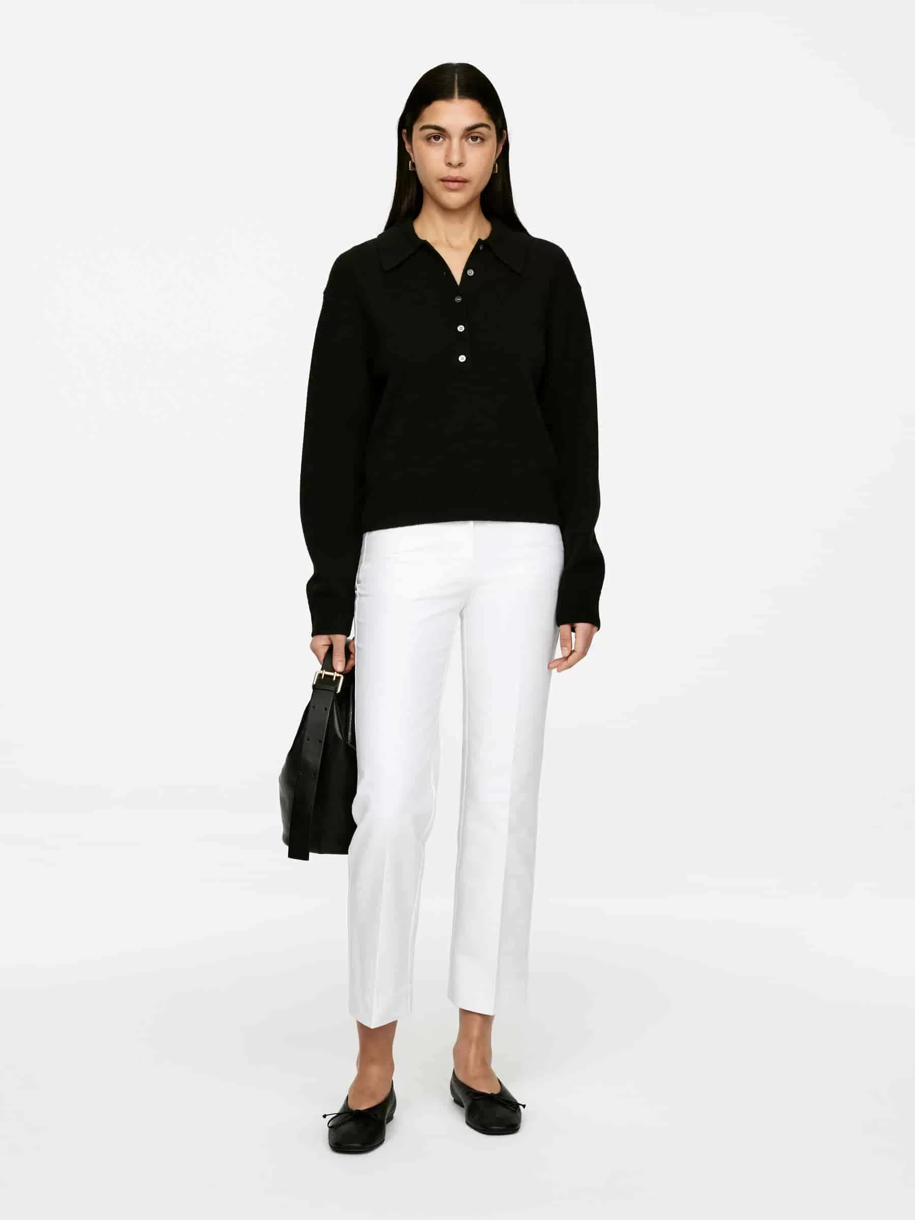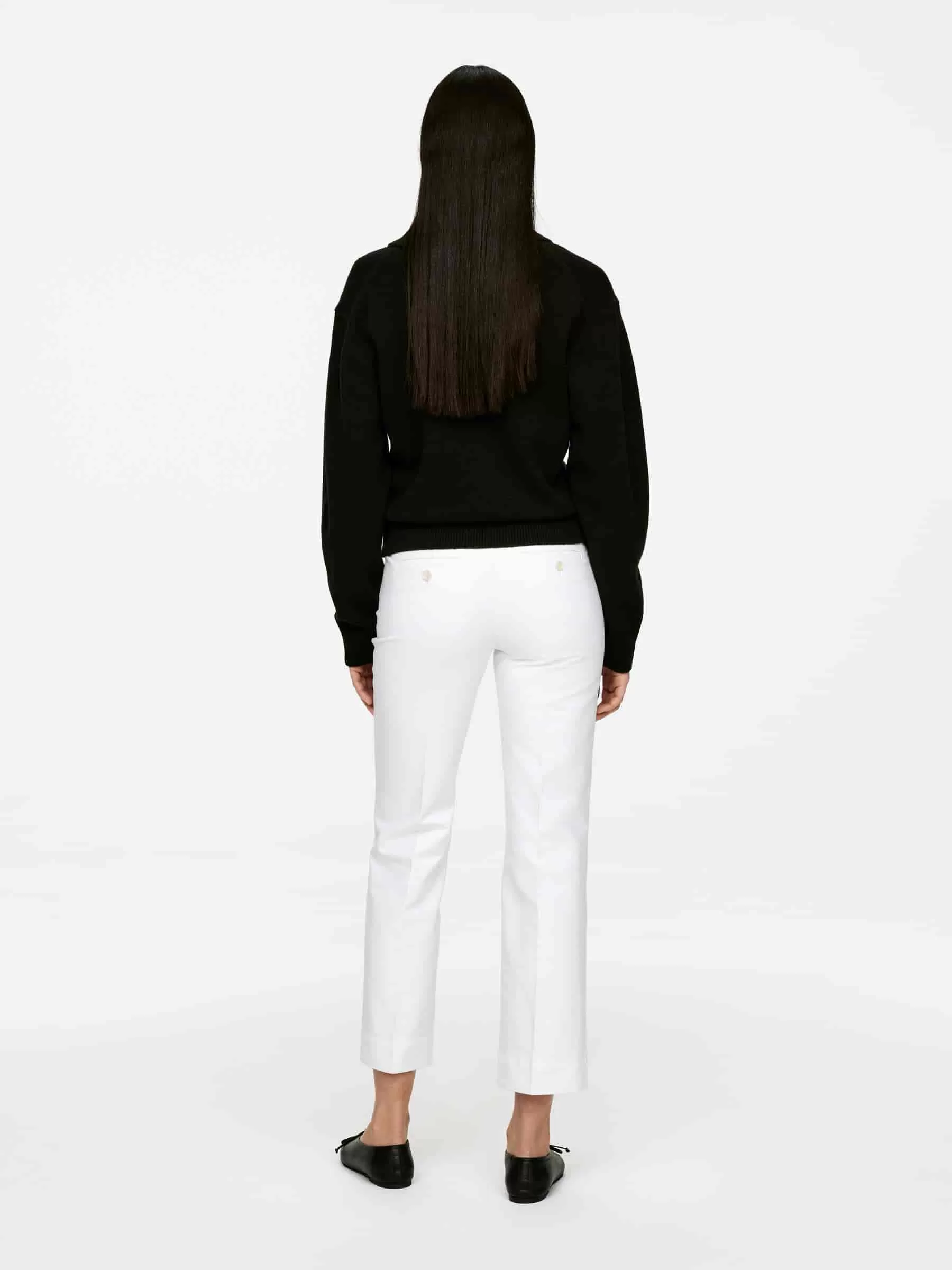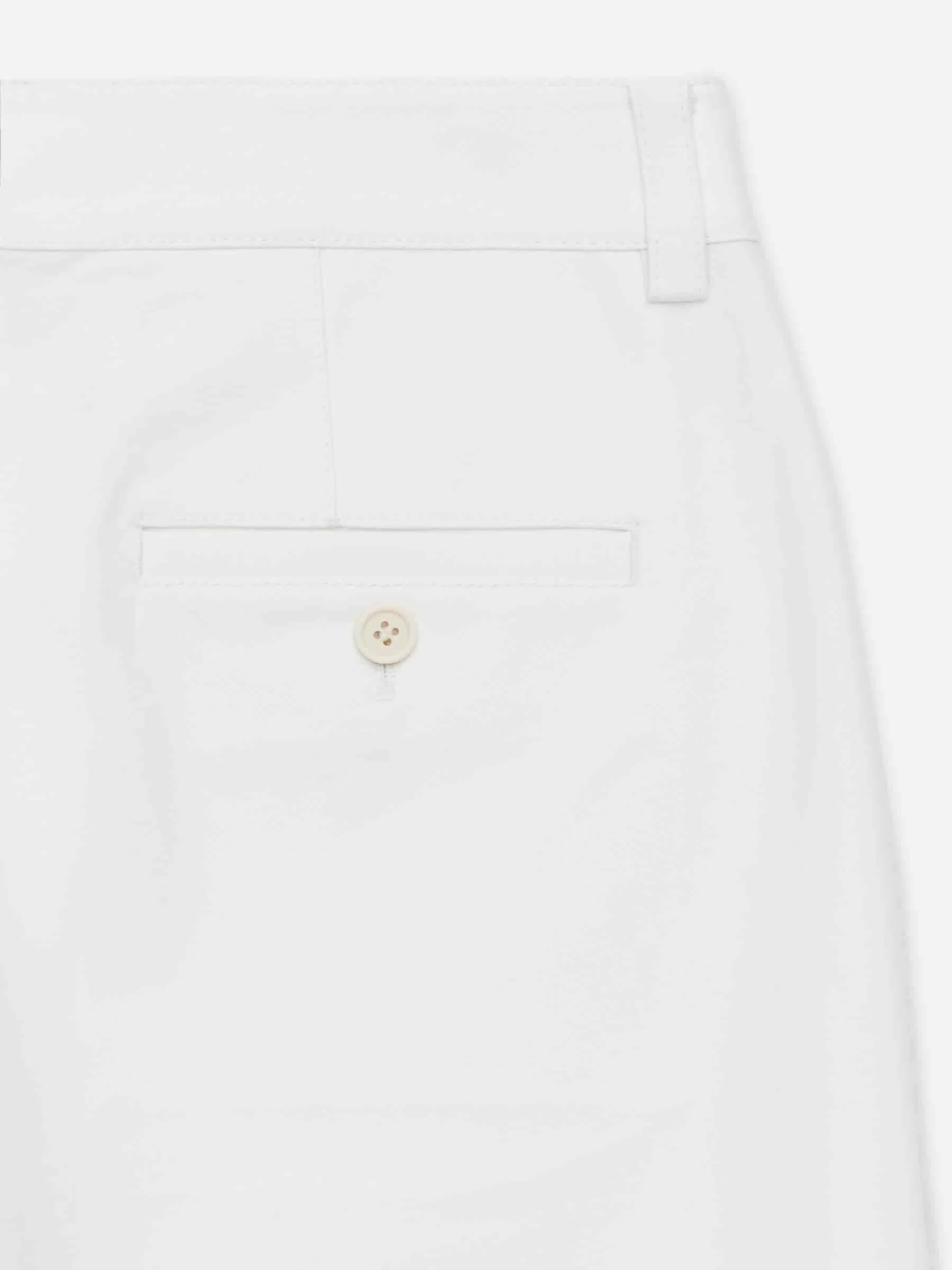 Schmal geschnittene Hose mit Bügelfalten vorne. Entworfen mit einer mittelhohen Taille und geraden Beinen. Reißverschluss und Knopfverschluss. Vordertaschen und Leistentaschen mit Knopfverschluss hinten.