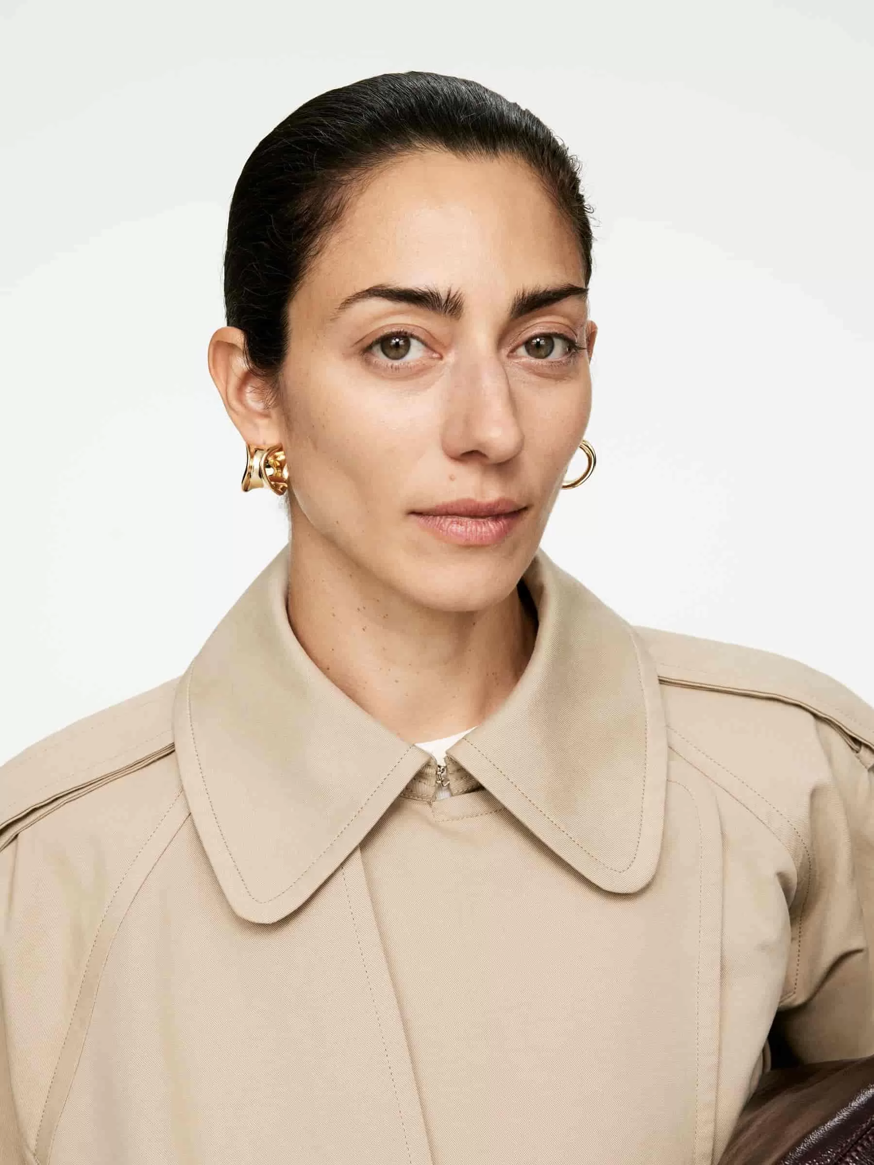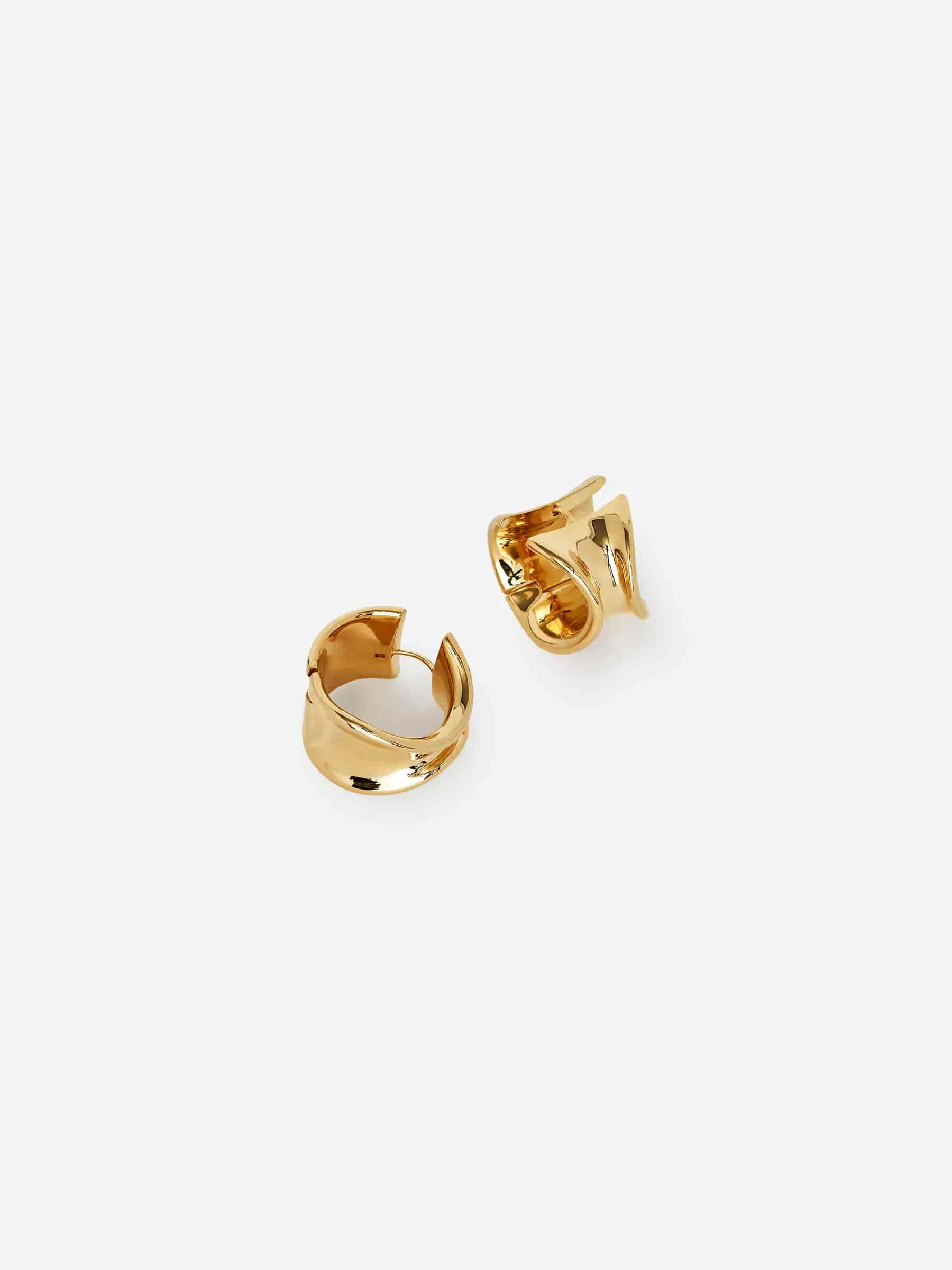 Skulpturale Creolen aus vergoldetem Messing. Klappverschluss für sicheren Tragekomfort. Durchmesser 2,2 cm.