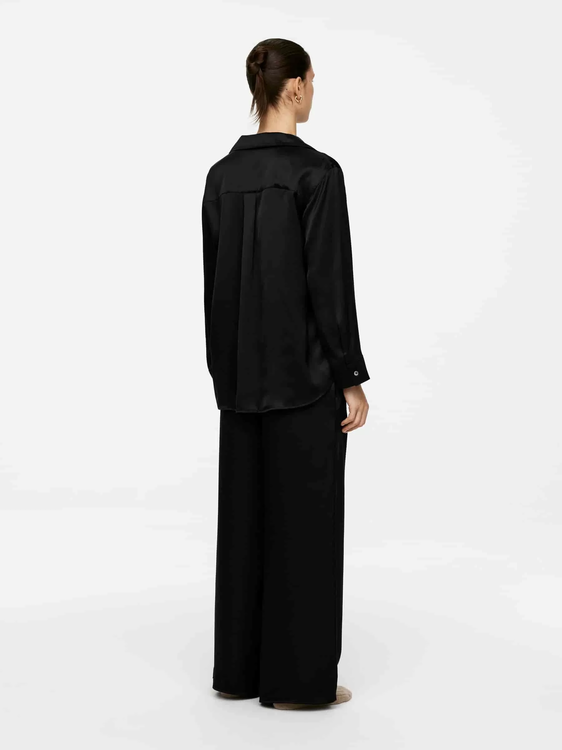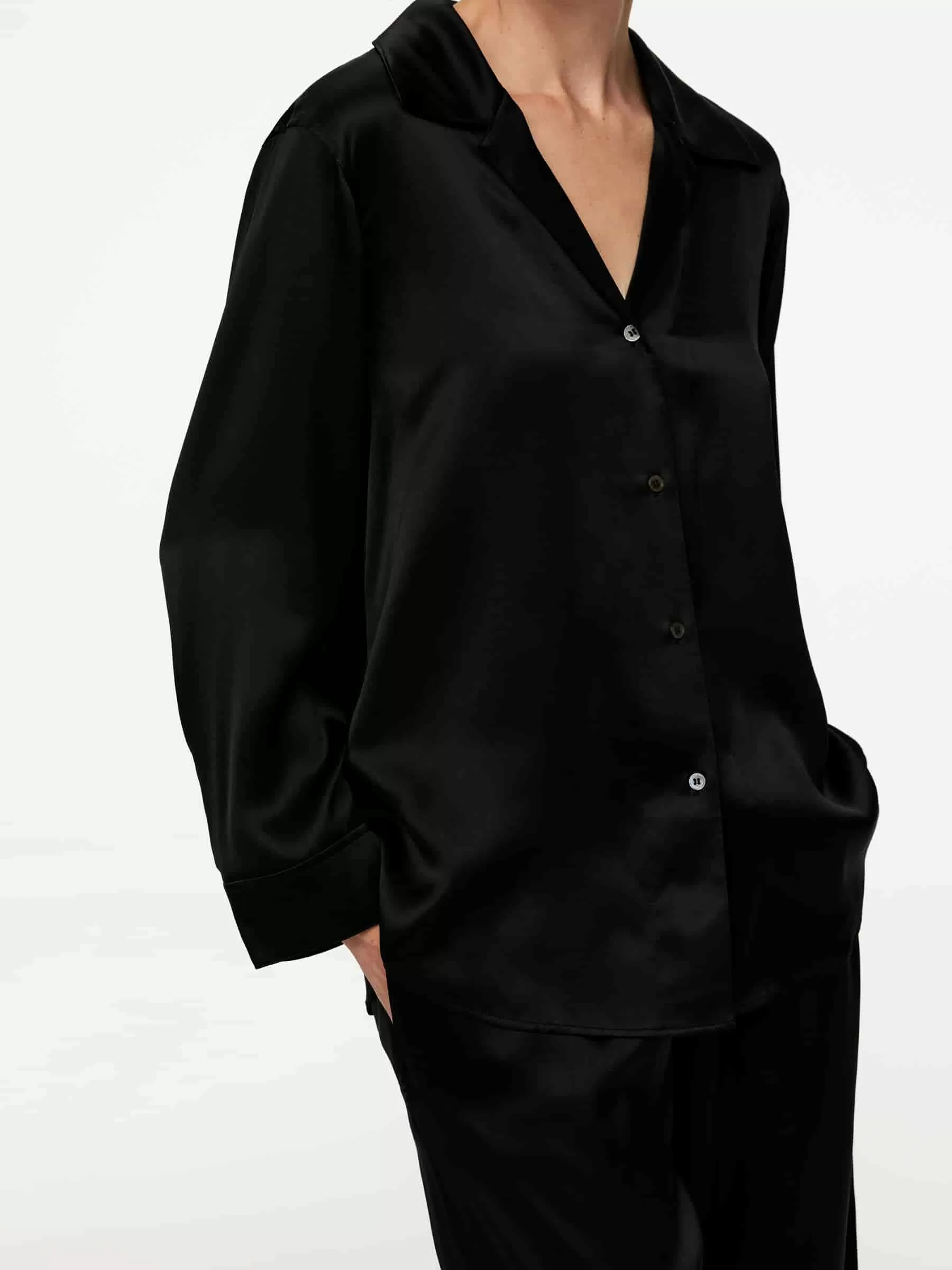 Hemd aus glattem Satingewebe aus Maulbeerseide. Entworfen mit entspannter Passform. Lange Ärmel mit breiten Manschetten und Schlüssellochöffnungen.