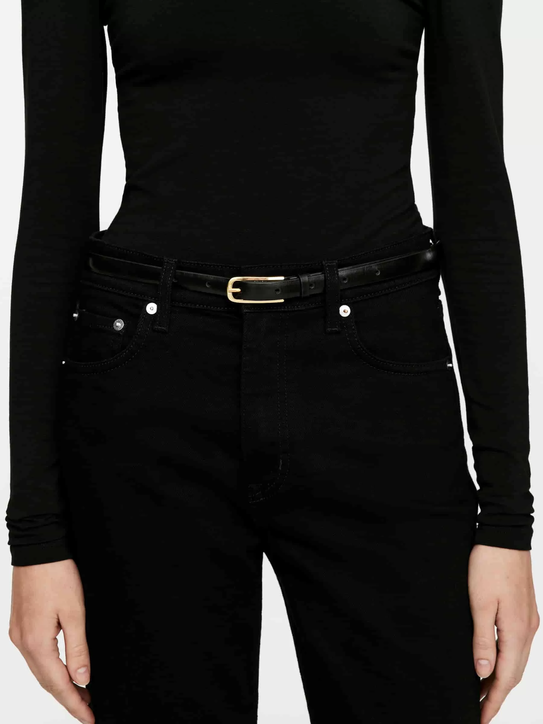 Schmaler Gürtel aus chromfreiem Leder. Vergoldete Schnalle mit halbrunden Ecken. Breite 1,5 cm.
