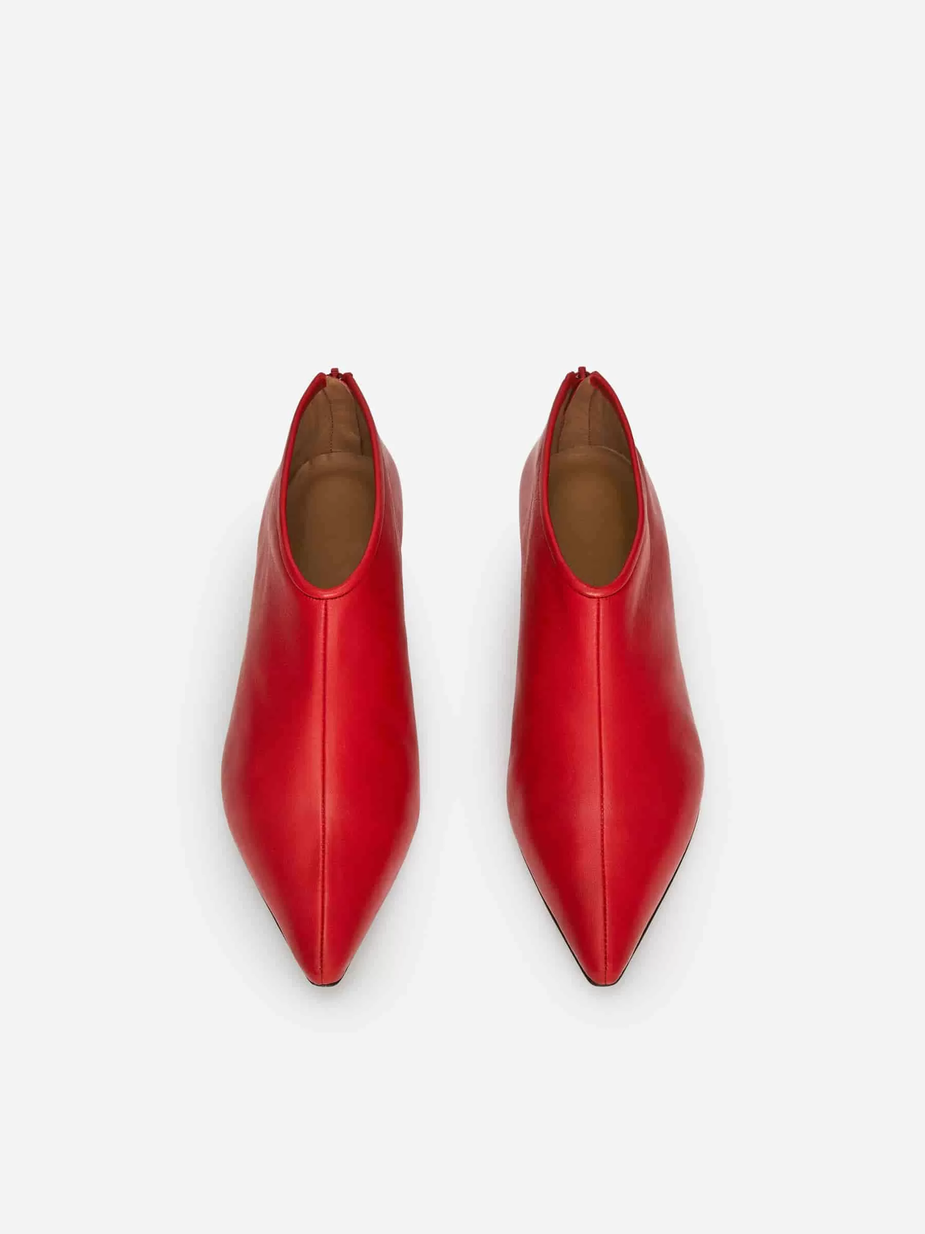 Unterhalb der Stiefeletten aus Glattleder. Mit niedrigem Kitten-Heel, Reißverschluss hinten und spitzer Zehenpartie. Absatzhöhe 4 cm.