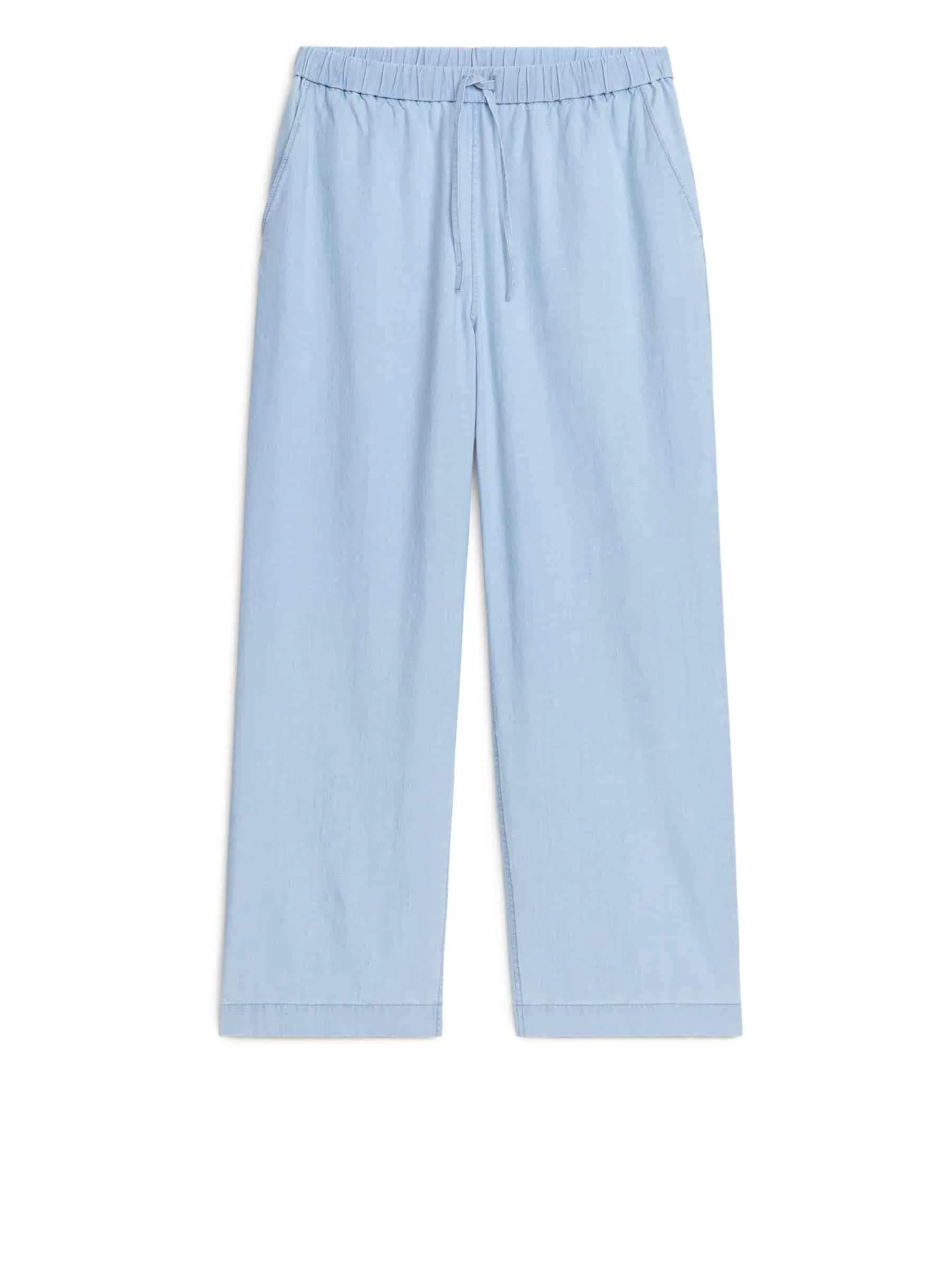 Hose aus gewaschenem, leichtem Denim-Stoff mit weichem Griff. Detailliert mit einem elastischen Bund mit Kordelzug. Schräge Seitentaschen.