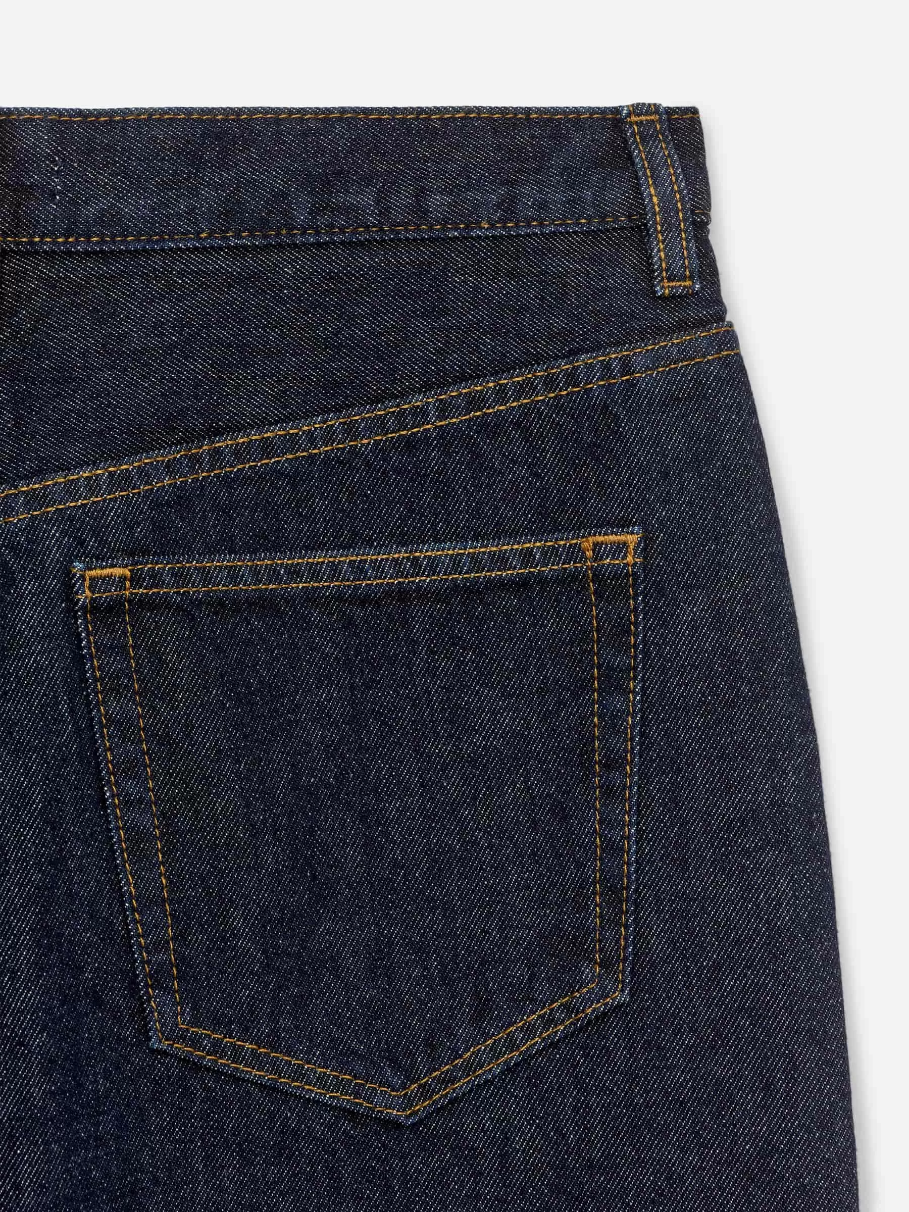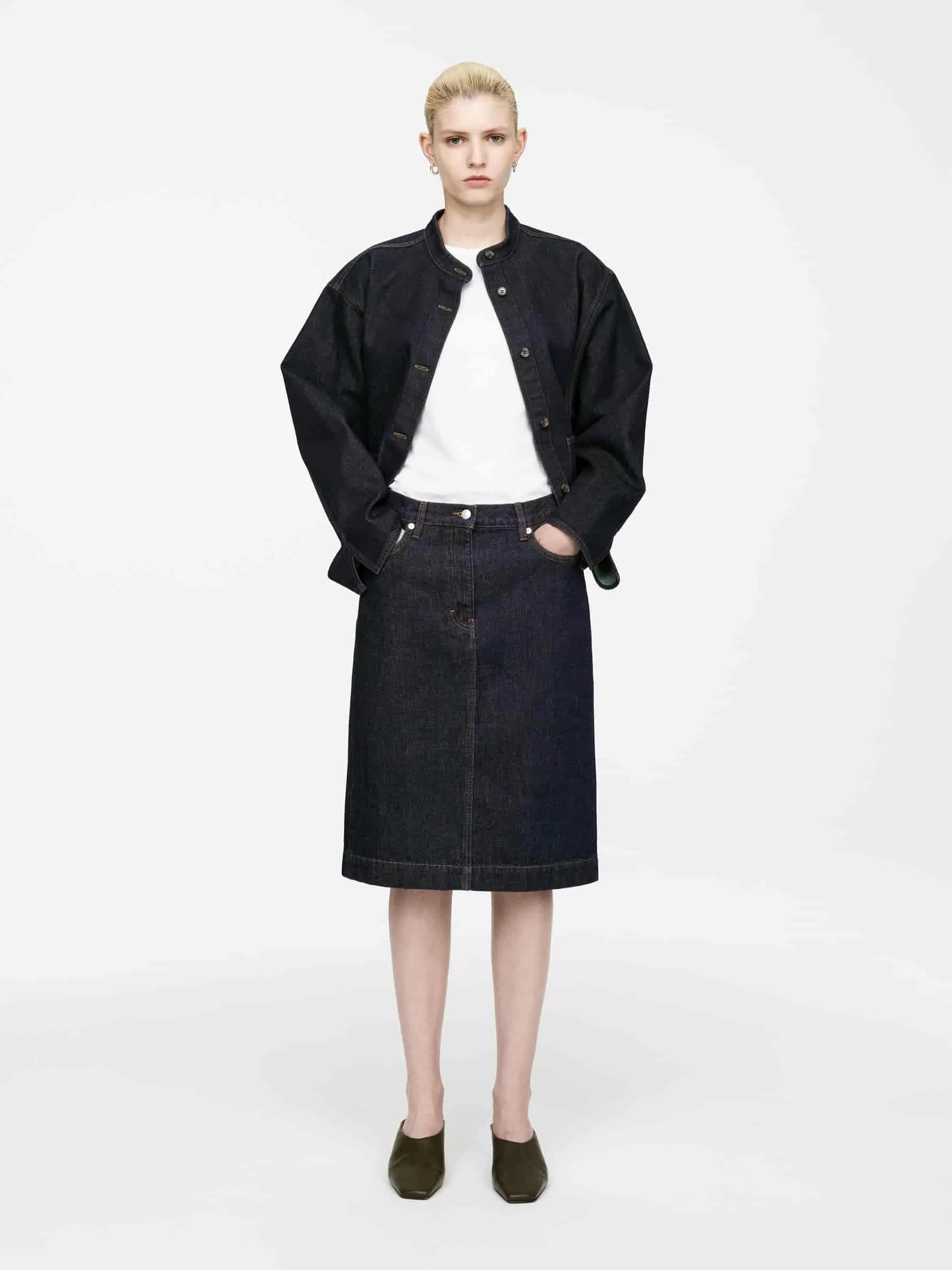 Fünf-Taschen-Jeansrock aus Baumwolle. Ein mittellanger Stil mit normaler Passform.