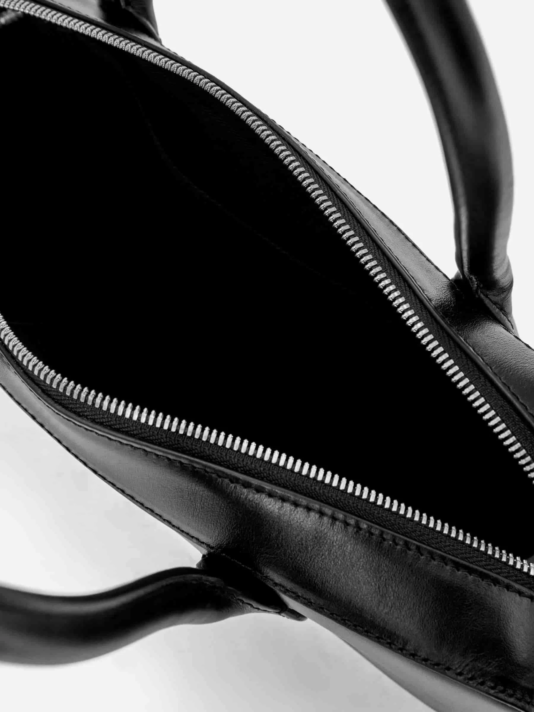 Mini-Bowlingtasche mit Henkeln oben. Entworfen mit einer länglichen Form und sanft abgerundeten Kanten. Doppelter Reißverschluss und Innentasche. Breite 33 cm, Höhe 11 cm, Tiefe 7 cm. 21 cm fallen.