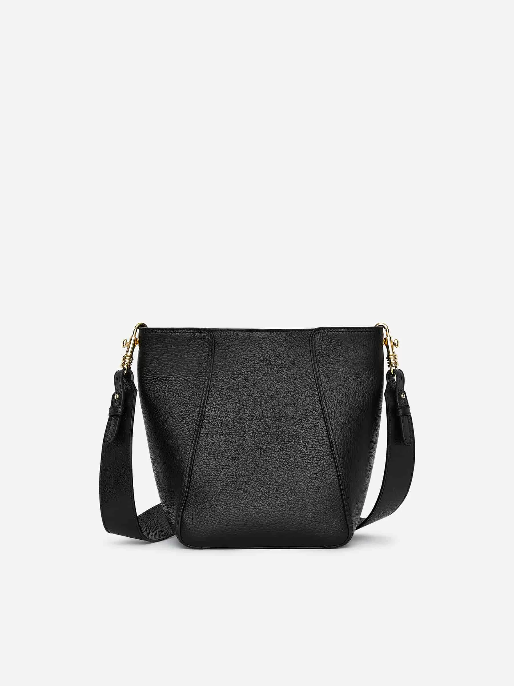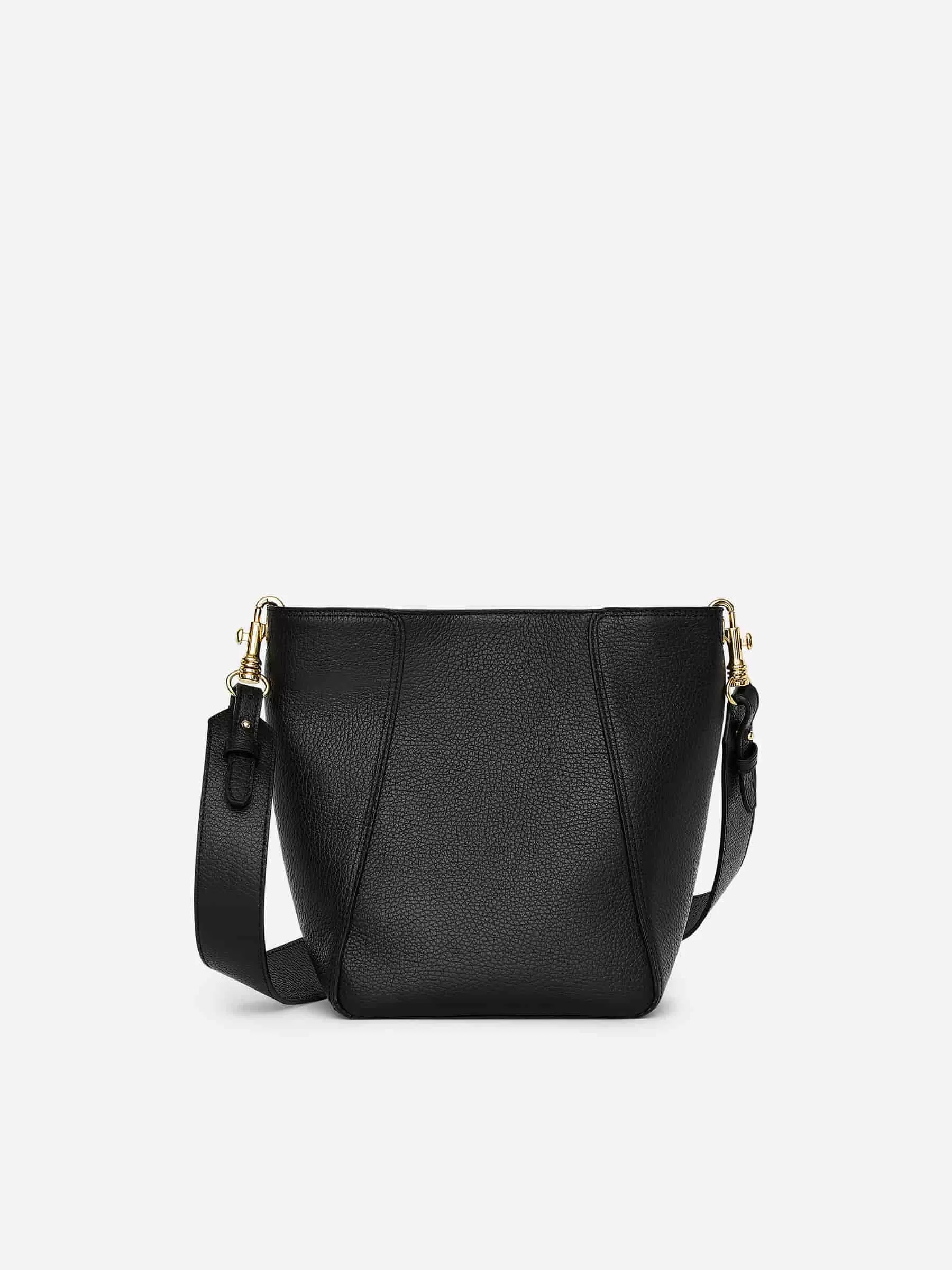 Beuteltasche aus chromfreiem Leder. Verstellbarer Schultergurt mit Haken. Detailliert mit Magnetverschluss, Innentasche mit Reißverschluss und dekorativen Seiteneinsätzen. Breite 18 cm, Höhe 24 cm, Tiefe 11 cm.