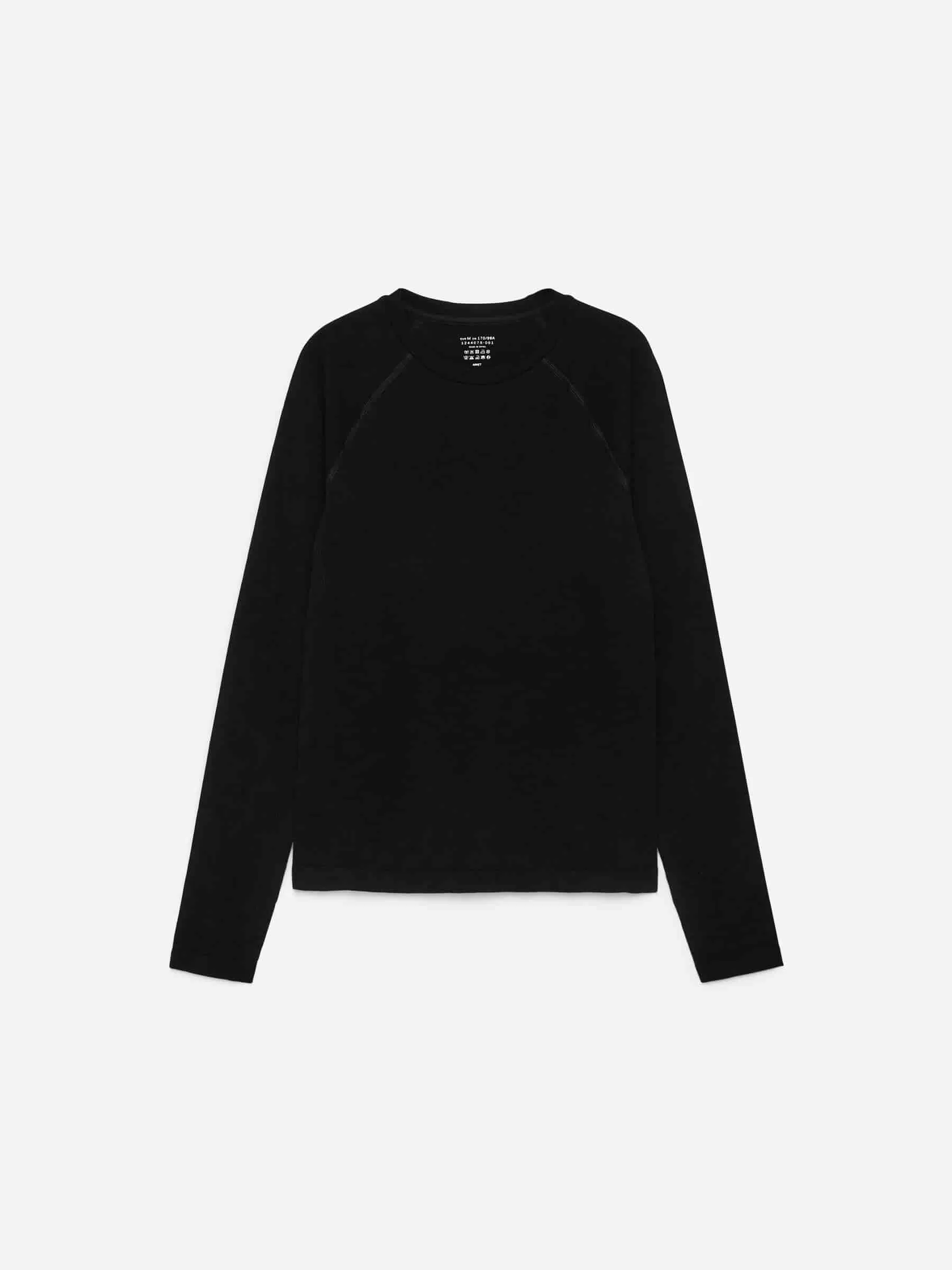 Nahtloses Jersey-Oberteil aus einer elastischen Wollmischung. Ein langärmliges Modell mit Rundhalsausschnitt. Schlanke Passform. Der Stil besteht zu 59 % aus RWS-Wolle (TE-00047206). Produkte, die nach dem Responsible Wool Standard (RWS) zertifiziert sind, enthalten Wollfasern von Farmen, die unabhängig nach Tierschutz- und Landbewirtschaftungsanforderungen zertifiziert sind.