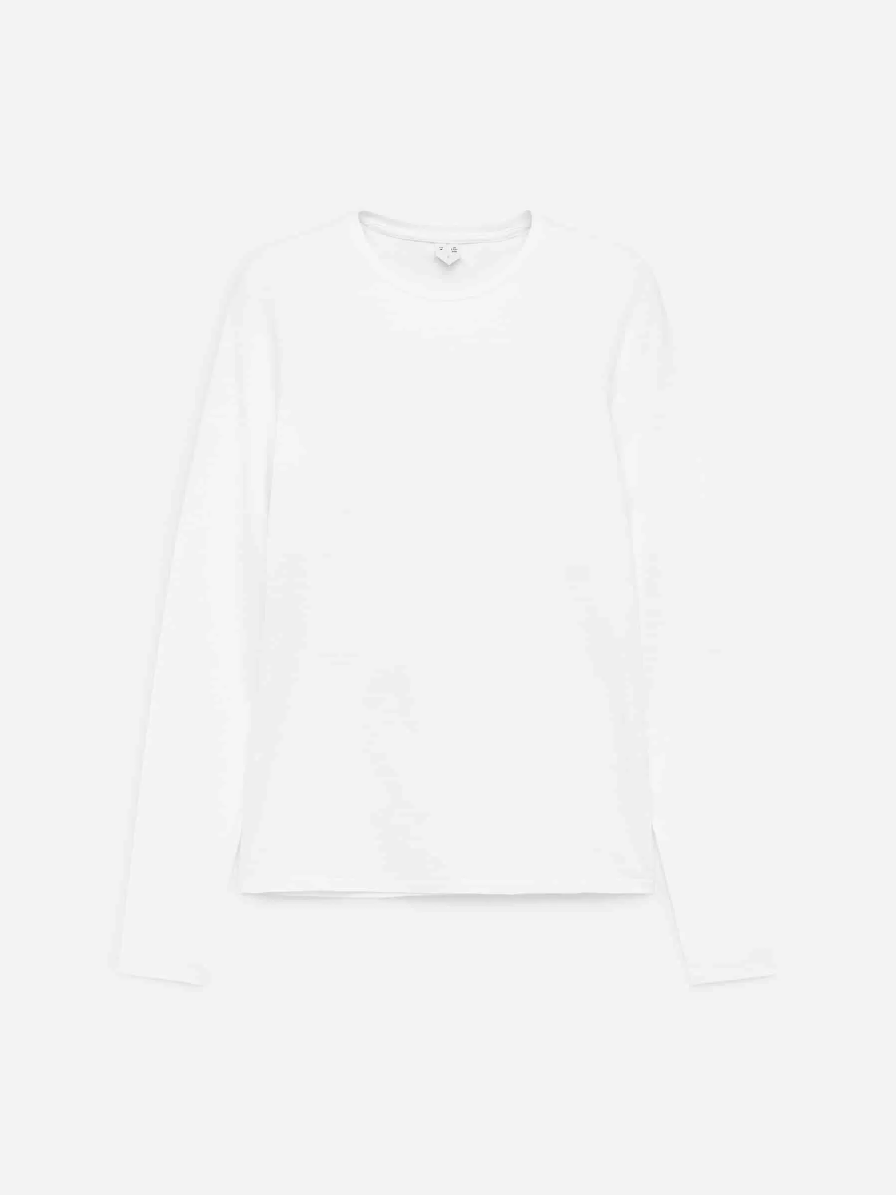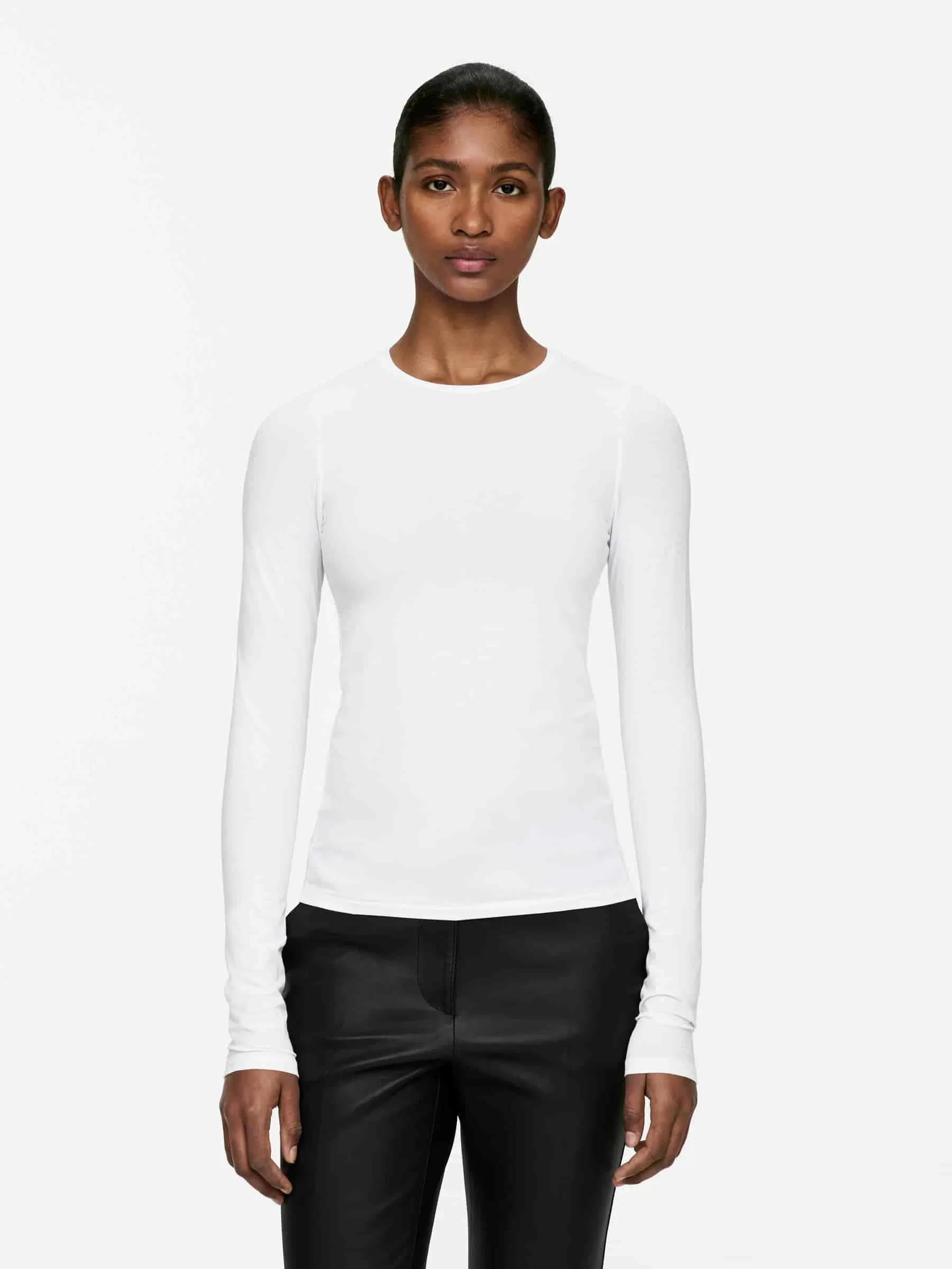 Langärmliges T-Shirt aus Jerseyqualität aus Supima-Baumwolle und einem Hauch Elasthan für Dehnbarkeit. Entwickelt, um eng am Körper getragen zu werden.