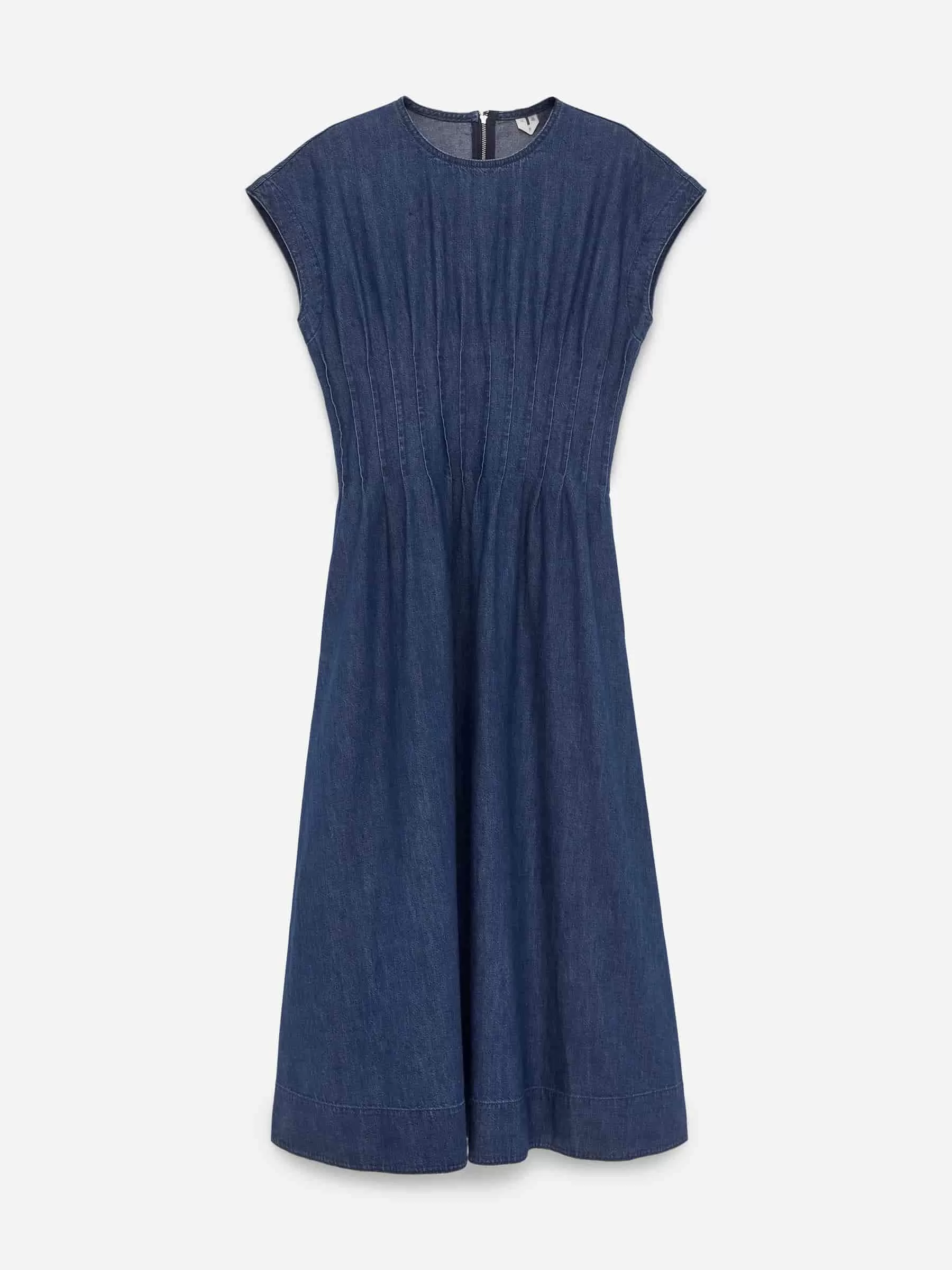 Jeans-Midikleid aus Baumwolle. Ein ärmelloses Modell mit Falten an der Taille, Reißverschluss in der Rückenmitte und Seitentaschen. Normale Passform.