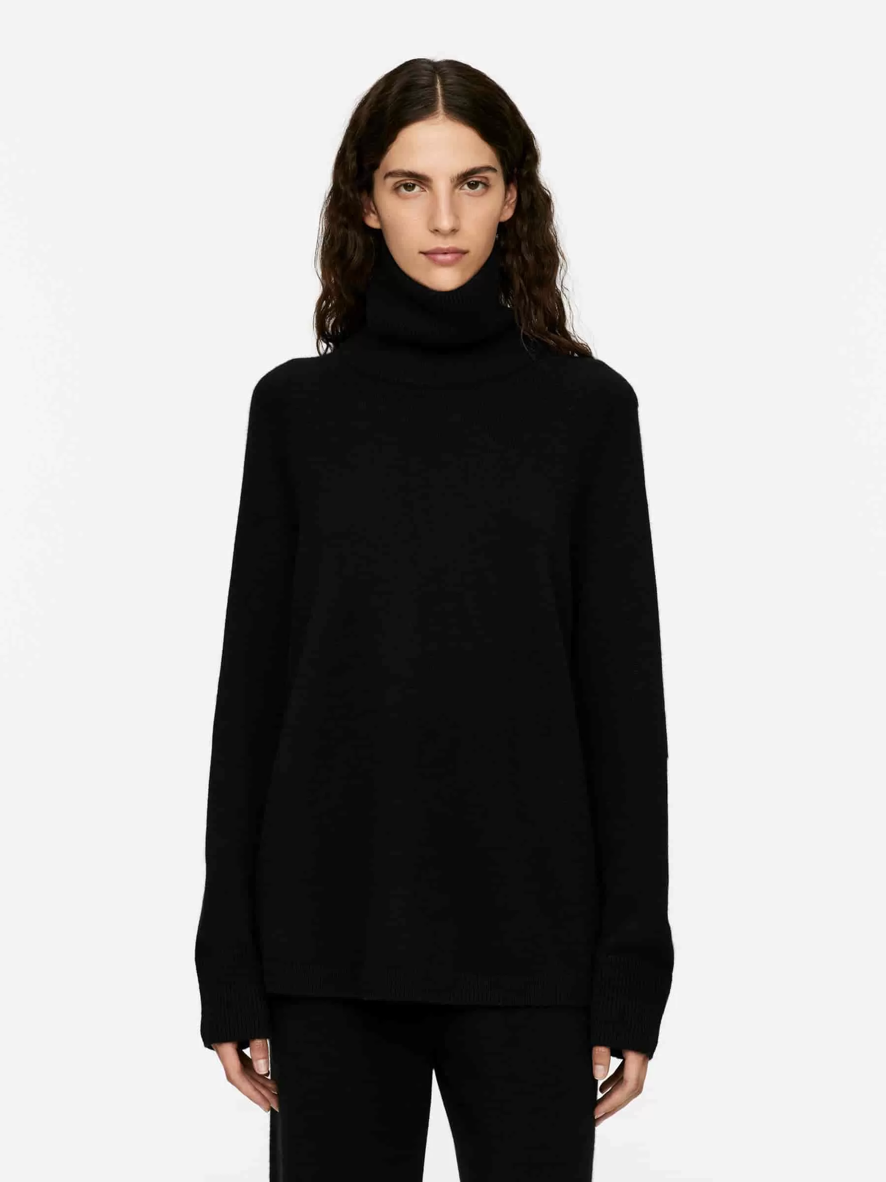 Rollkragenpullover aus Kaschmir und einem Anteil Merinowolle für zusätzliche Festigkeit. Mit Raglanärmeln und gerippten Abschlüssen.