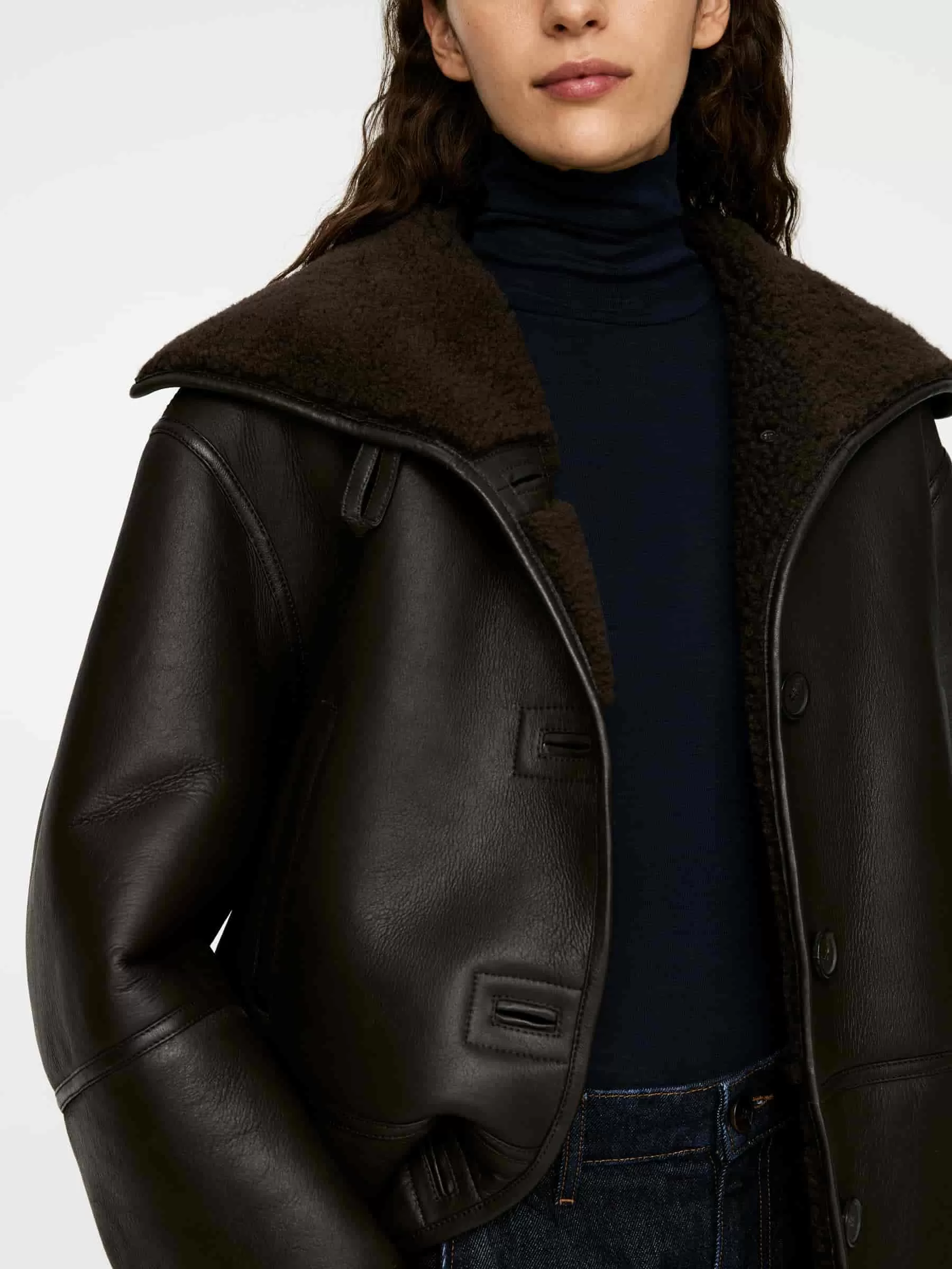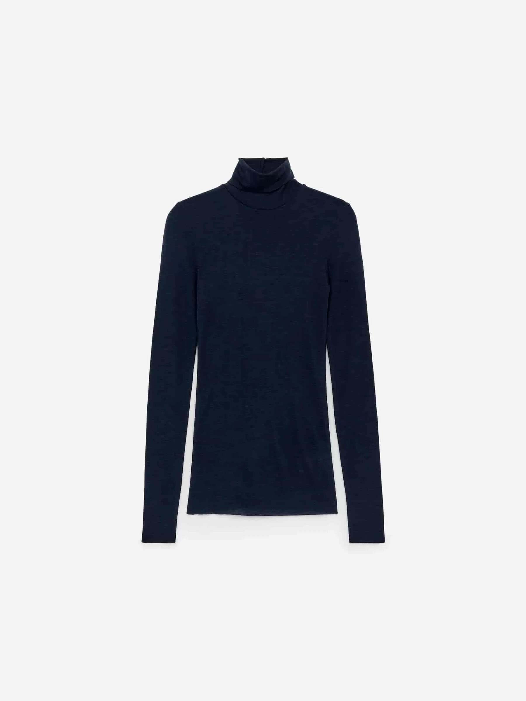 Durchsichtiges Jersey-Top mit Rollkragen, gestrickt aus reiner Merinowolle. Mit unversäuberten Kanten an Bündchen, Hals und Saum. Dieses Oberteil enthält 100 % RWS-Wolle, zertifiziert durch die Kontrollunion 893290. Produkte, die nach dem Responsible Wool Standard (RWS) zertifiziert sind, enthalten Wollfasern von Farmen, die unabhängig die Tierschutz- und Landbewirtschaftungsanforderungen erfüllen.