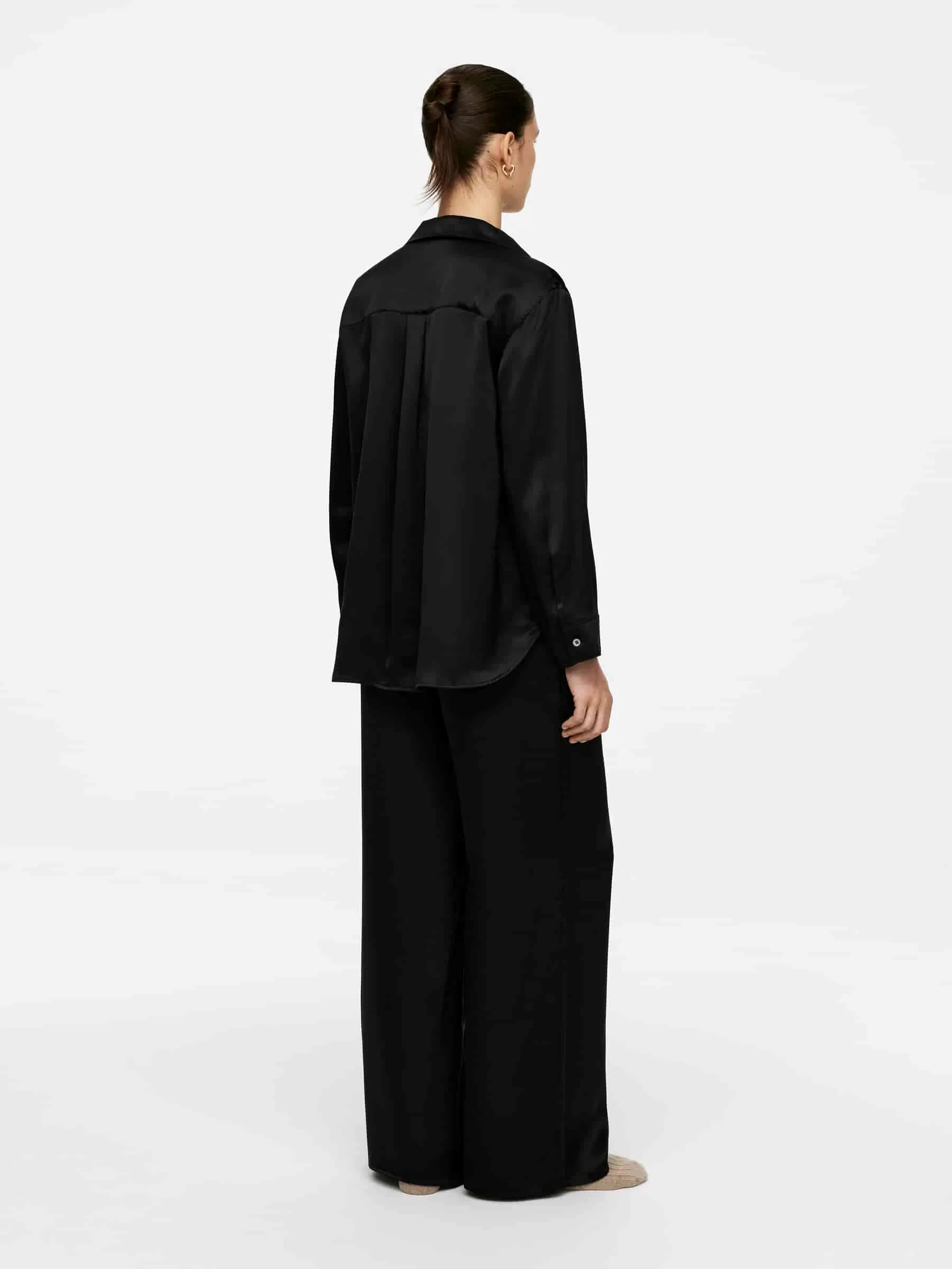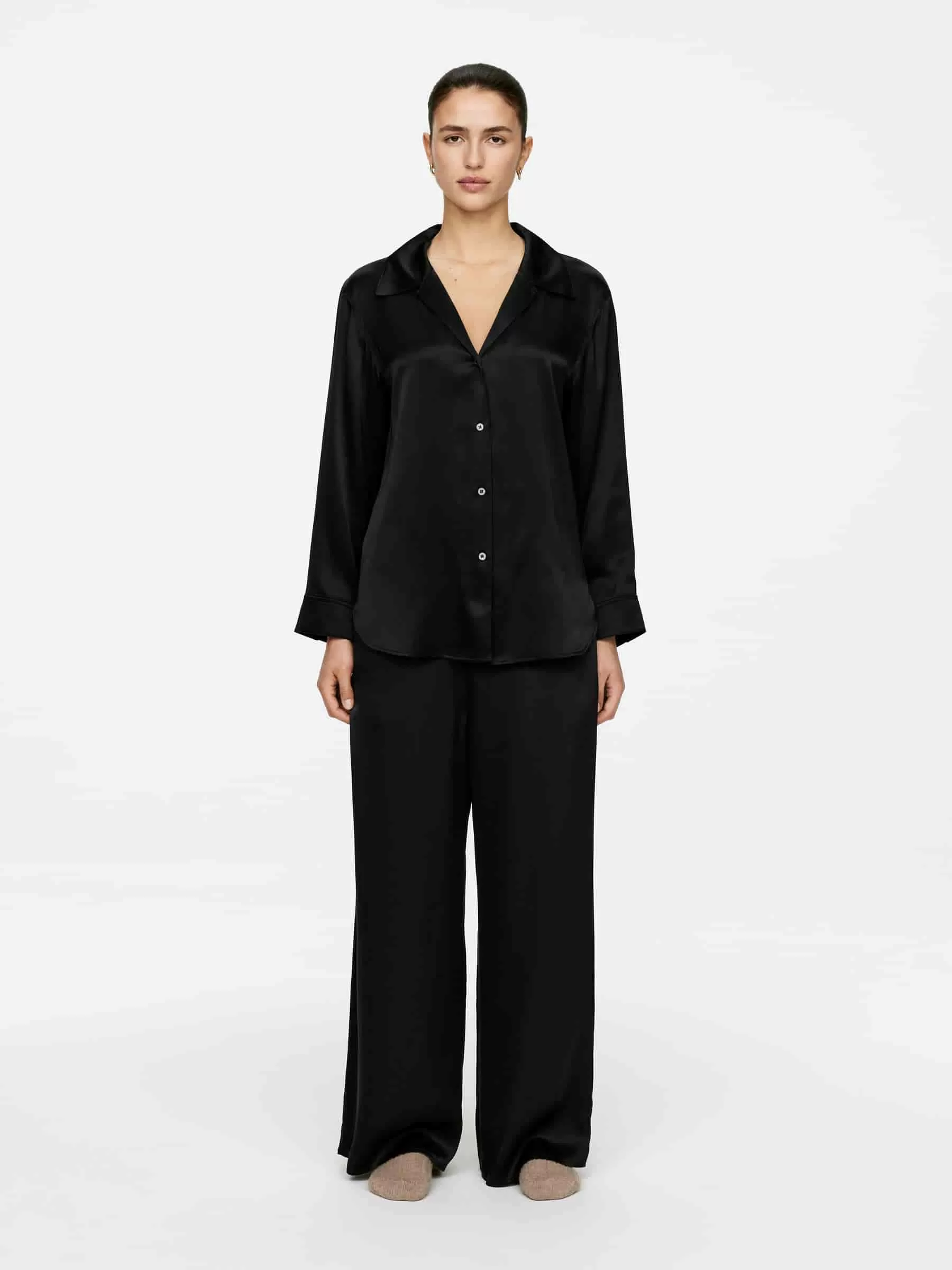 Ein glattes Satingewebe aus Maulbeerseide verleiht dieser Pyjamahose ein luxuriöses Gefühl. Ein Modell mit hoher Taille und weitem Bein für eine entspannte, bequeme Passform. Elastischer Bund und Taschen an den Seitennähten.