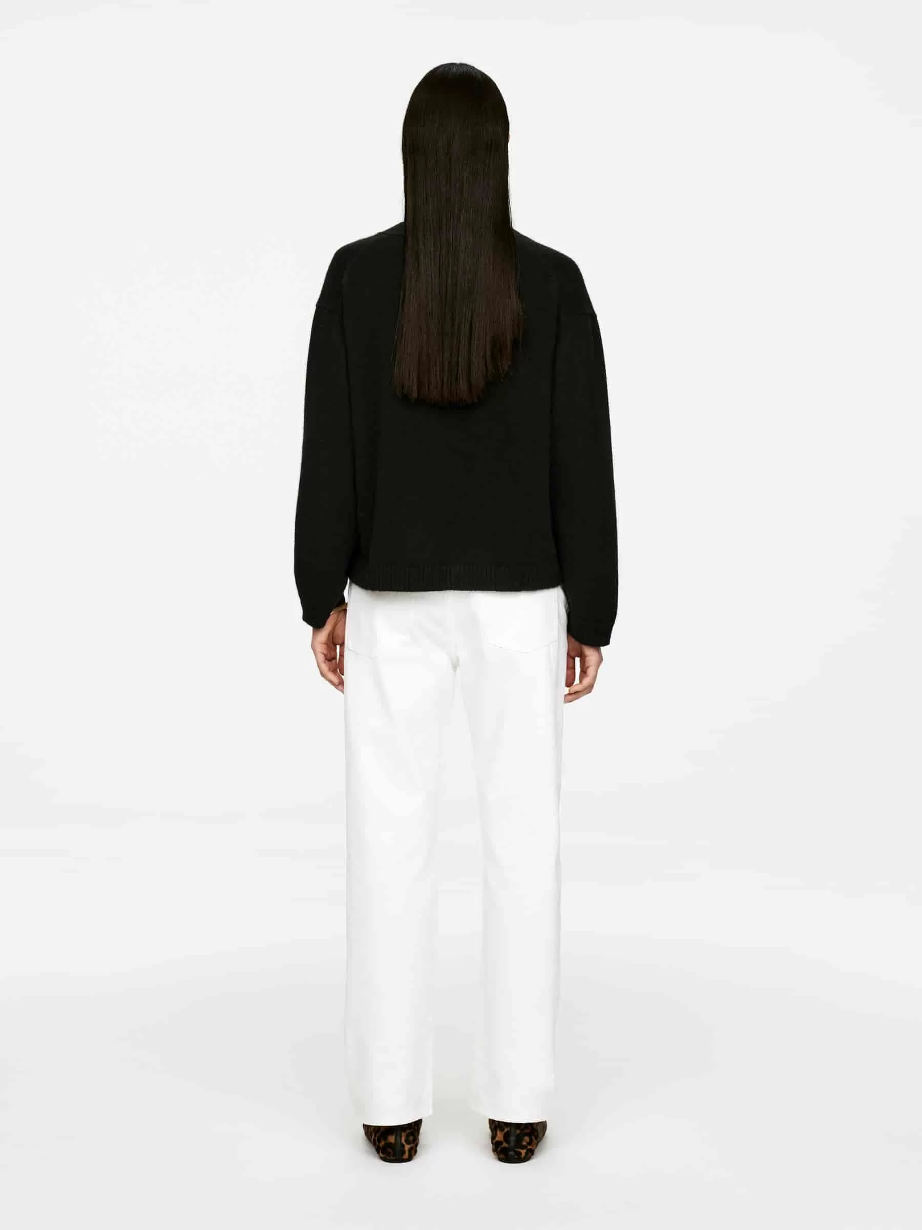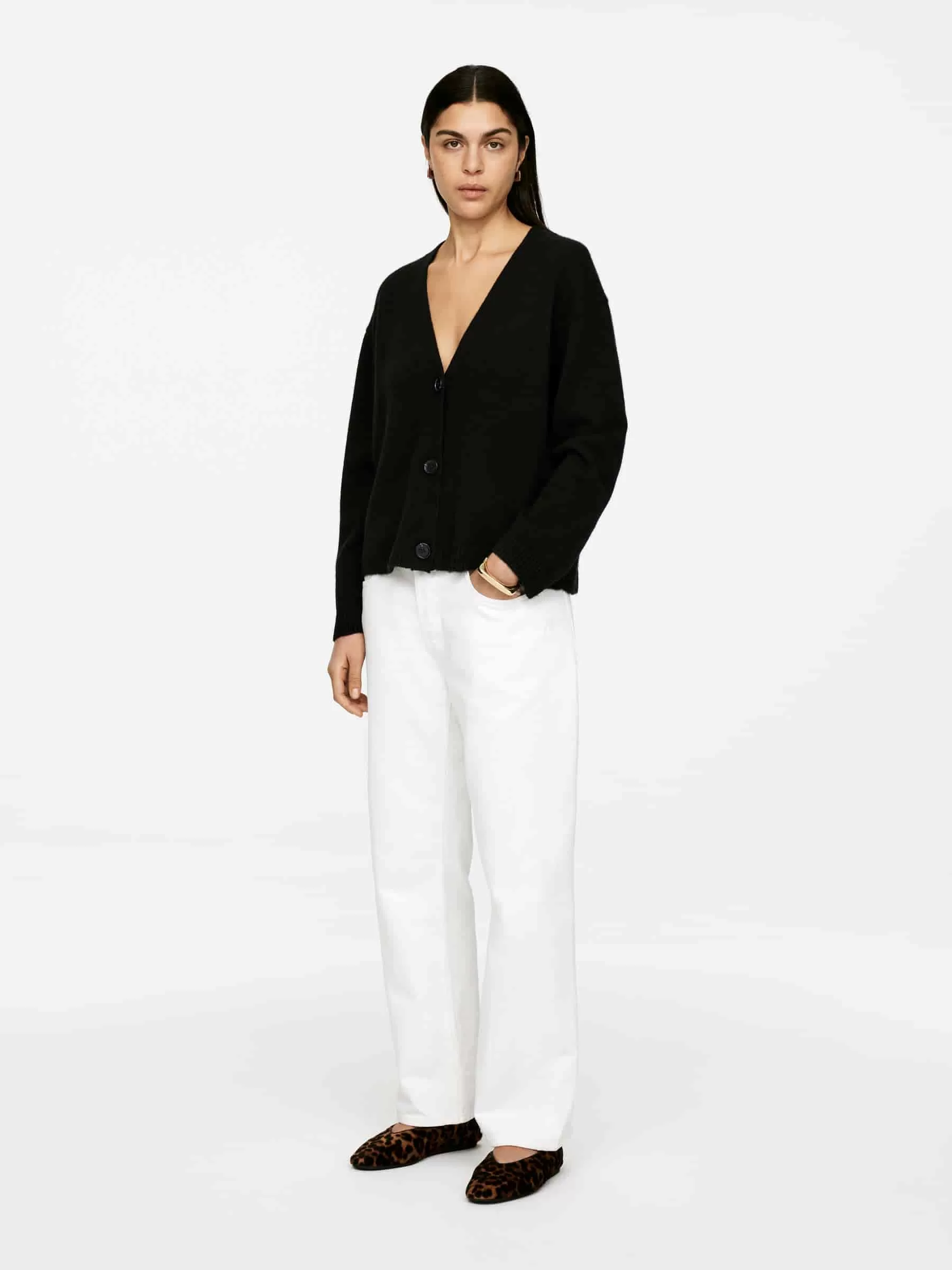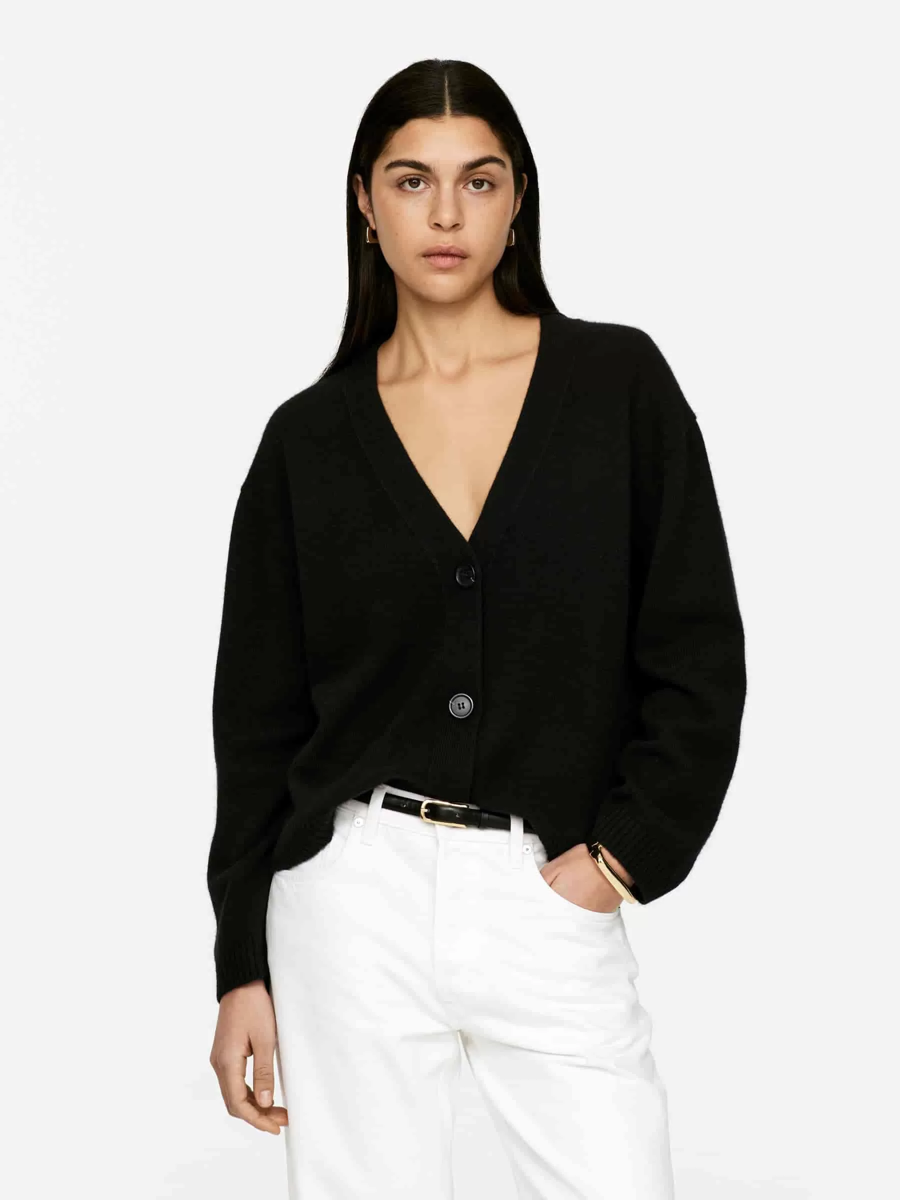 Langärmliger Cardigan aus Kaschmir und einem Wollanteil für zusätzliche Festigkeit. Knopfverschluss und Rippstrickbündchen.