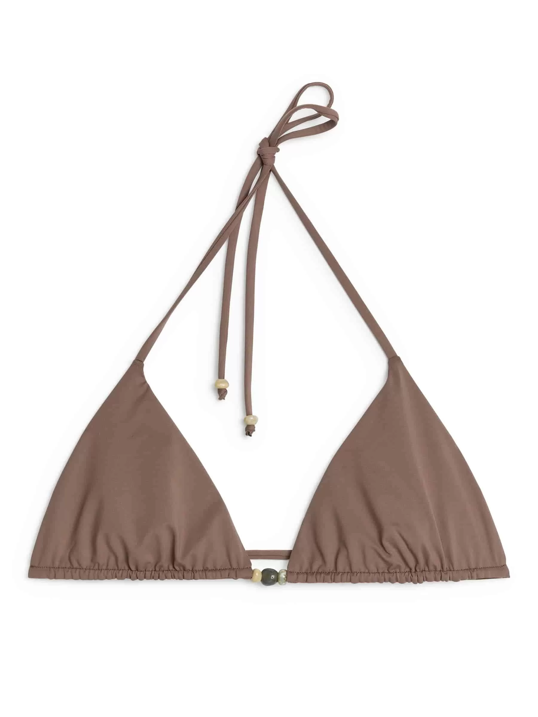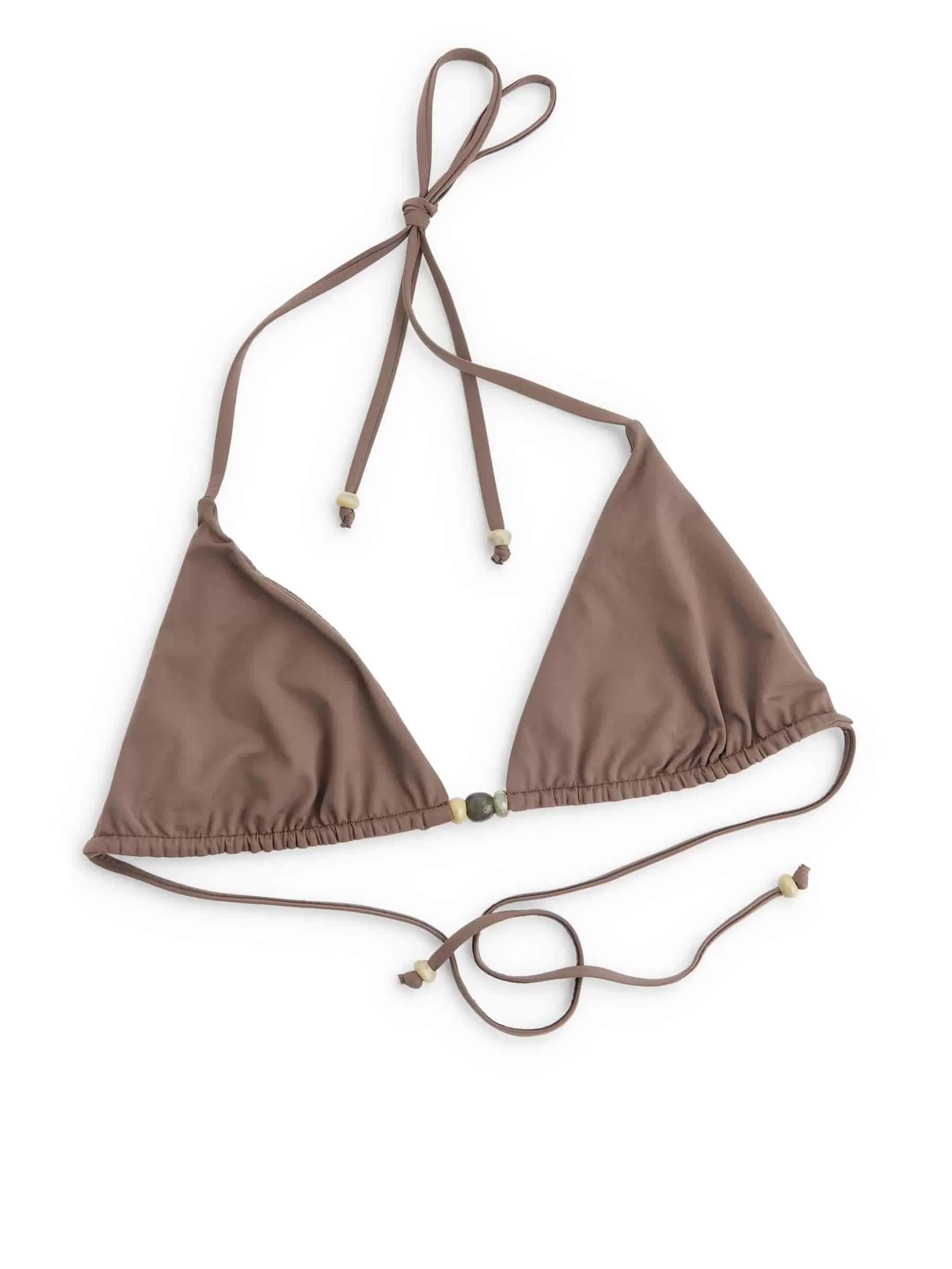Triangel-Bikinioberteil mit dekorativen Perlen vorne und dünnen Bindebändern. Geringe Unterstützung. Bindeverschluss hinten.