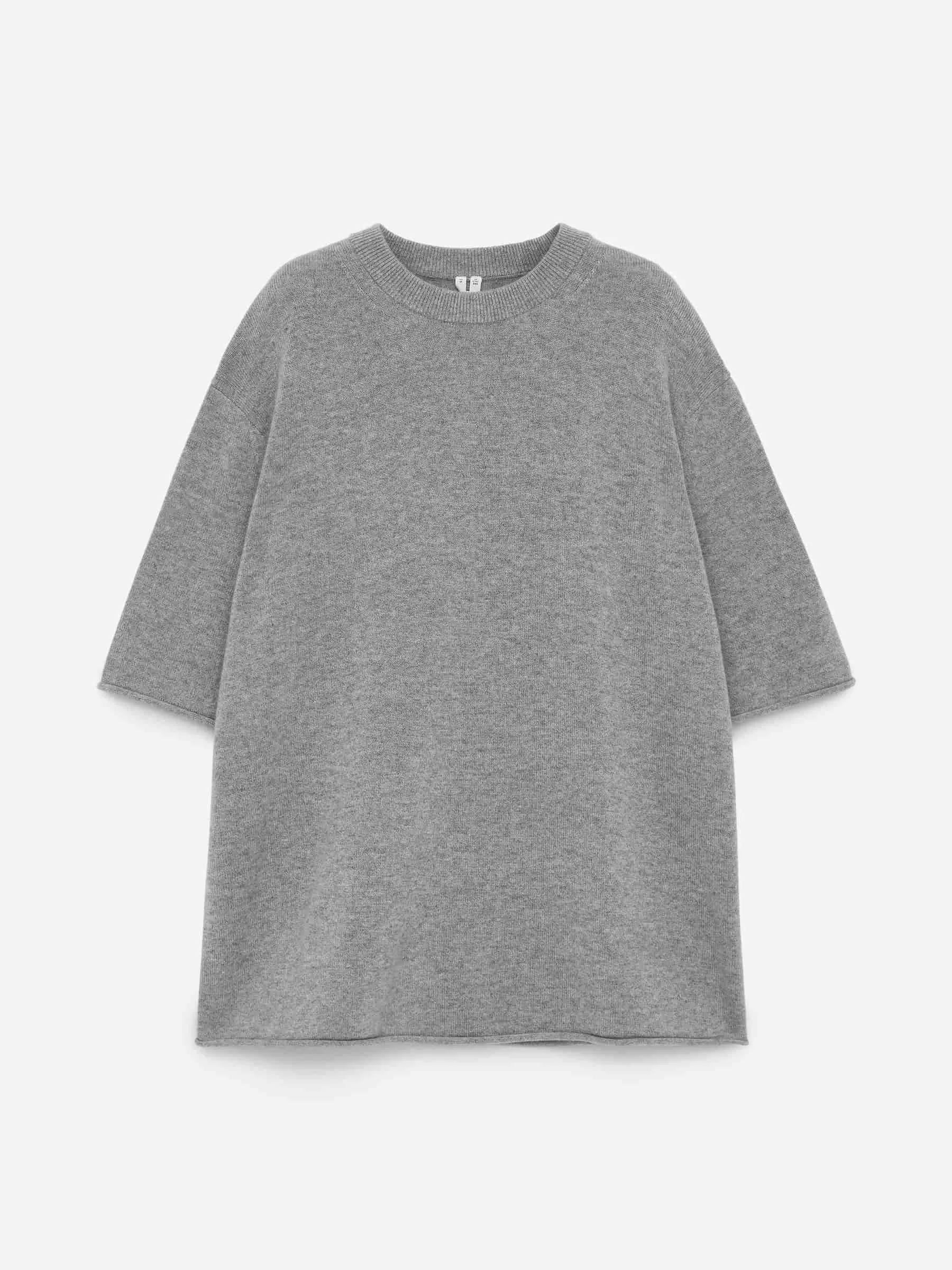Übergroßes T-Shirt aus Kaschmir. Mit Rippstrick am Halsausschnitt und Rollkanten an den Ärmeln und am unteren Saum.