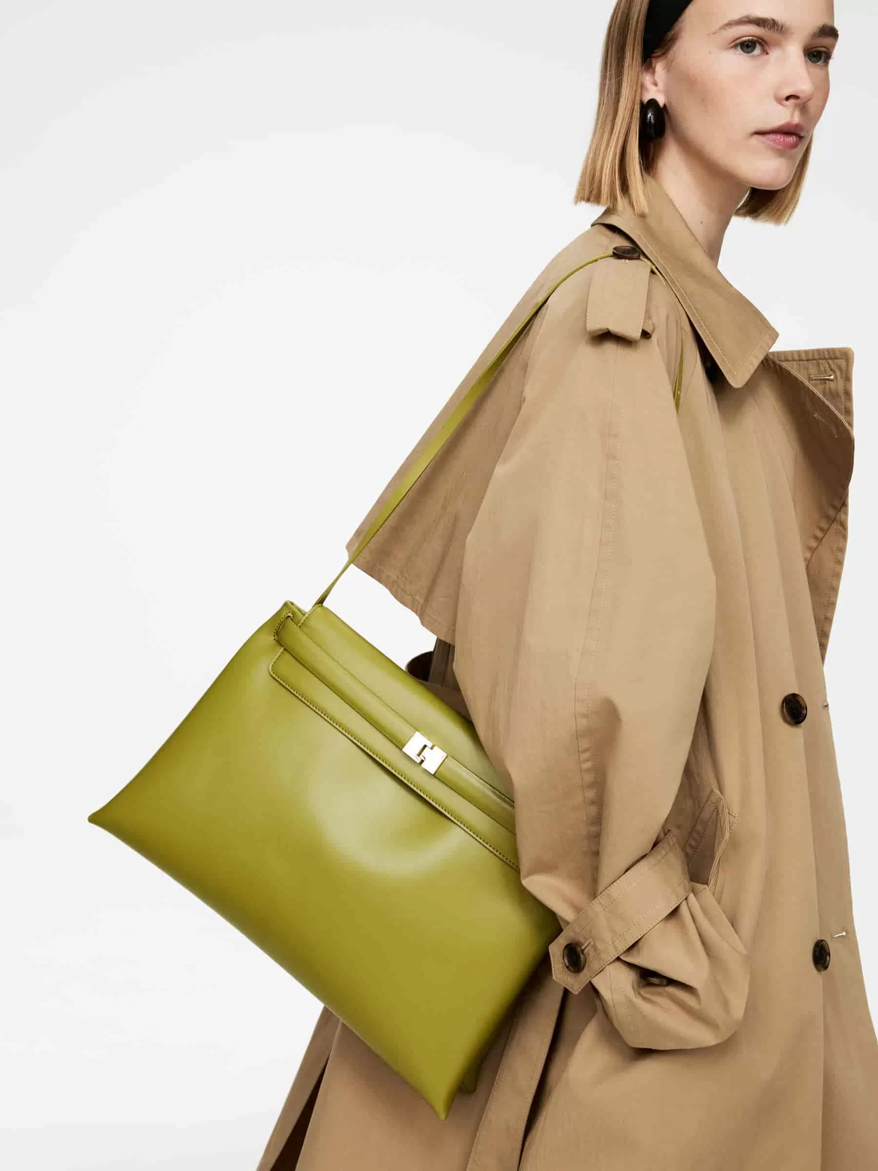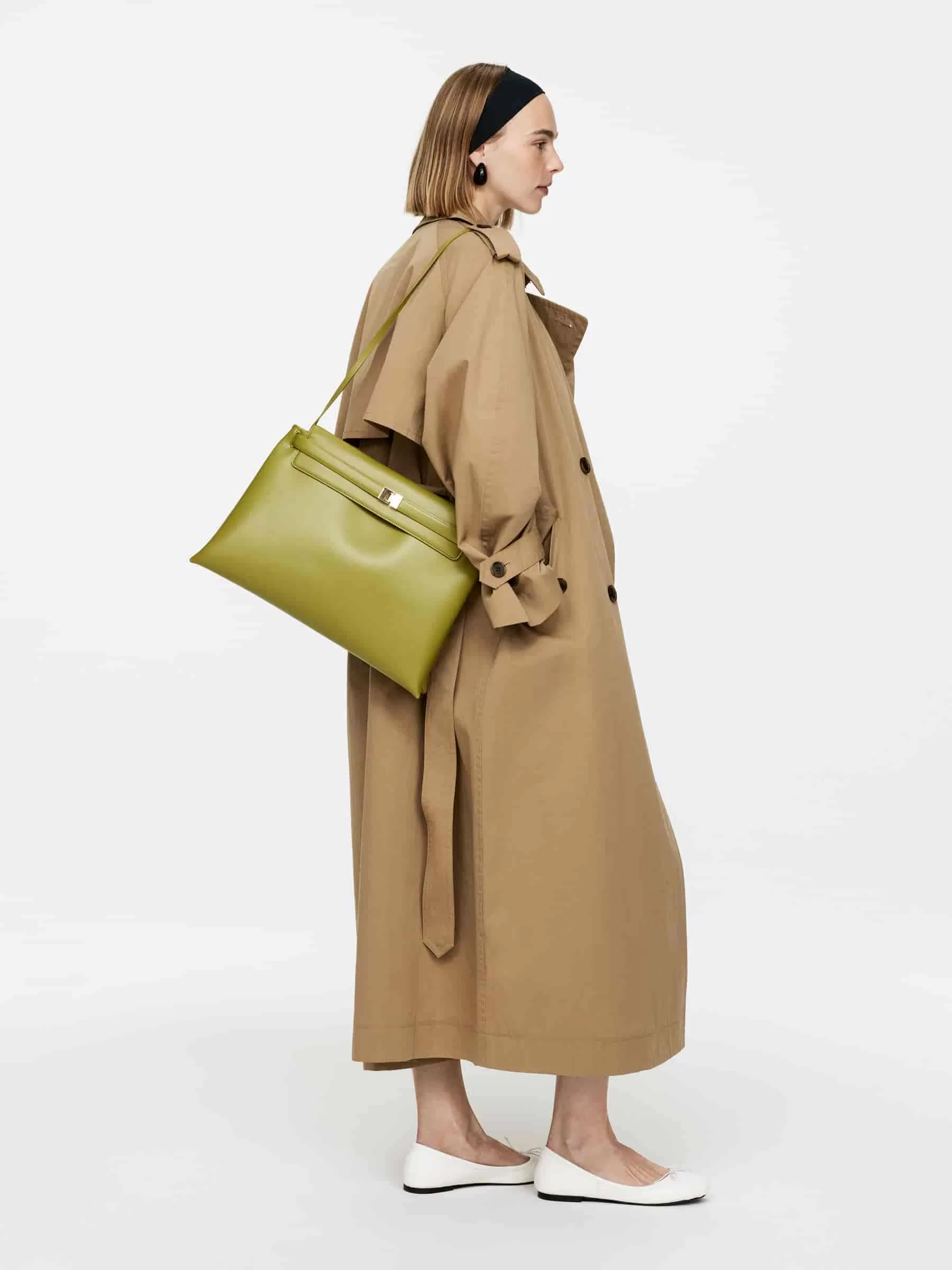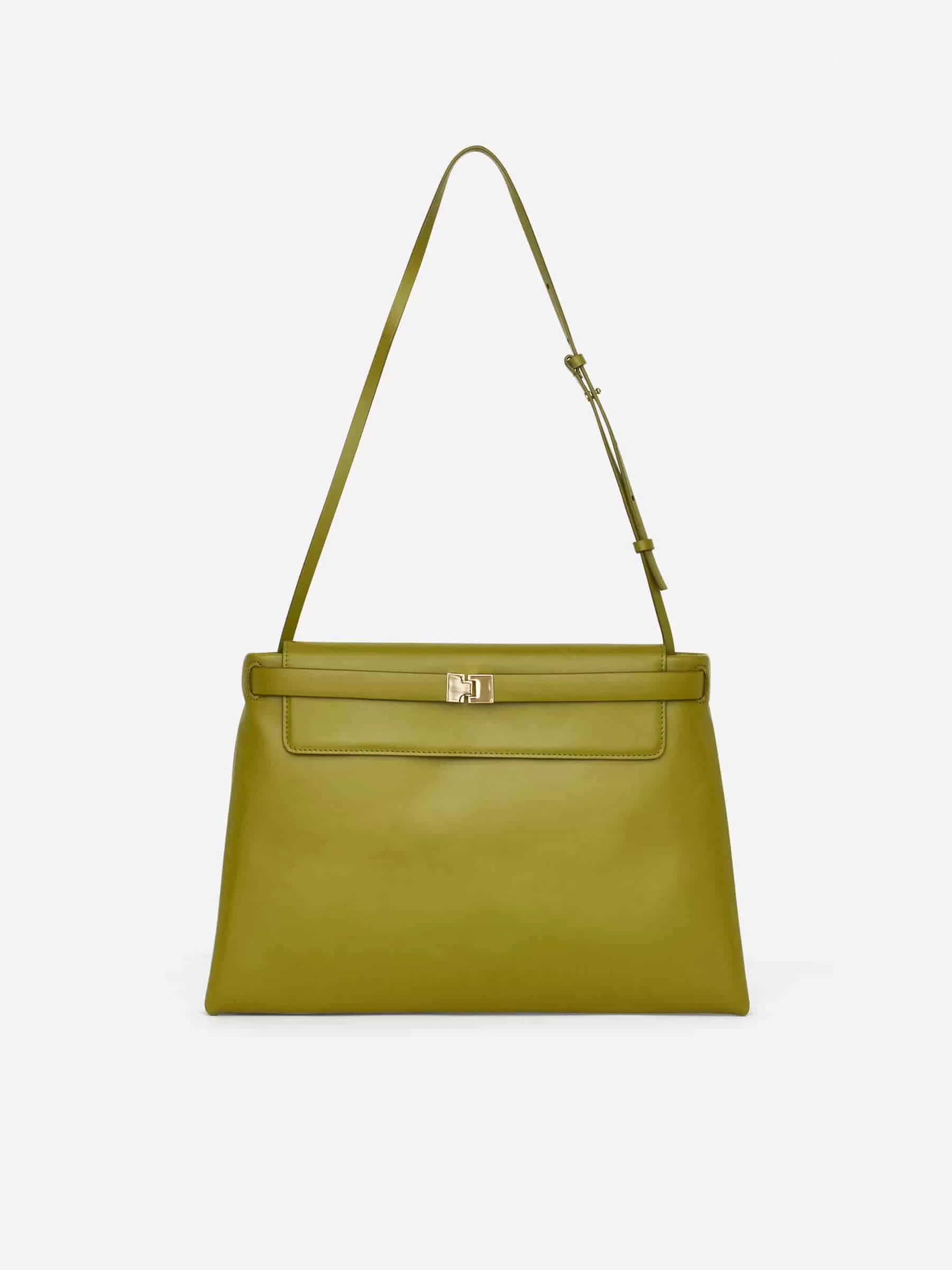 Tasche aus chromfreiem Leder. Ausgestattet mit einem abnehmbaren Gürtel mit vergoldeter Schnalle um die obere Klappe. Abnehmbarer Schultergurt und Reißverschluss. Die Tasche kann als Clutch oder über der Schulter getragen werden. Maße 39 x 25,5 cm.