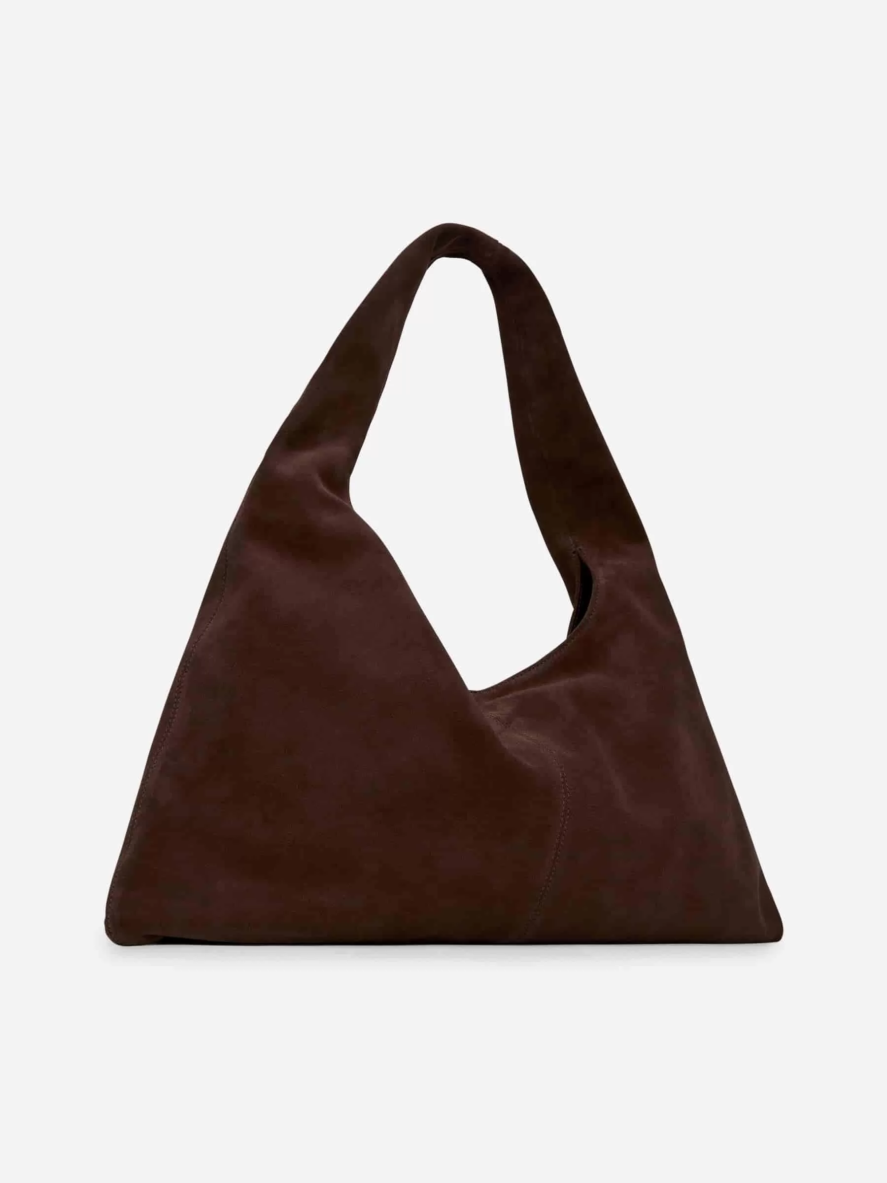 Tasche aus chromfreiem Wildleder. Ein flacher Stil mit einem lässigen Look, wenn er über der Schulter getragen wird. Ziernaht in der Mitte. Magnetverschluss und Innentasche ohne Reißverschluss. Breite 54 cm, Höhe 31 cm, Tiefe 17 cm.