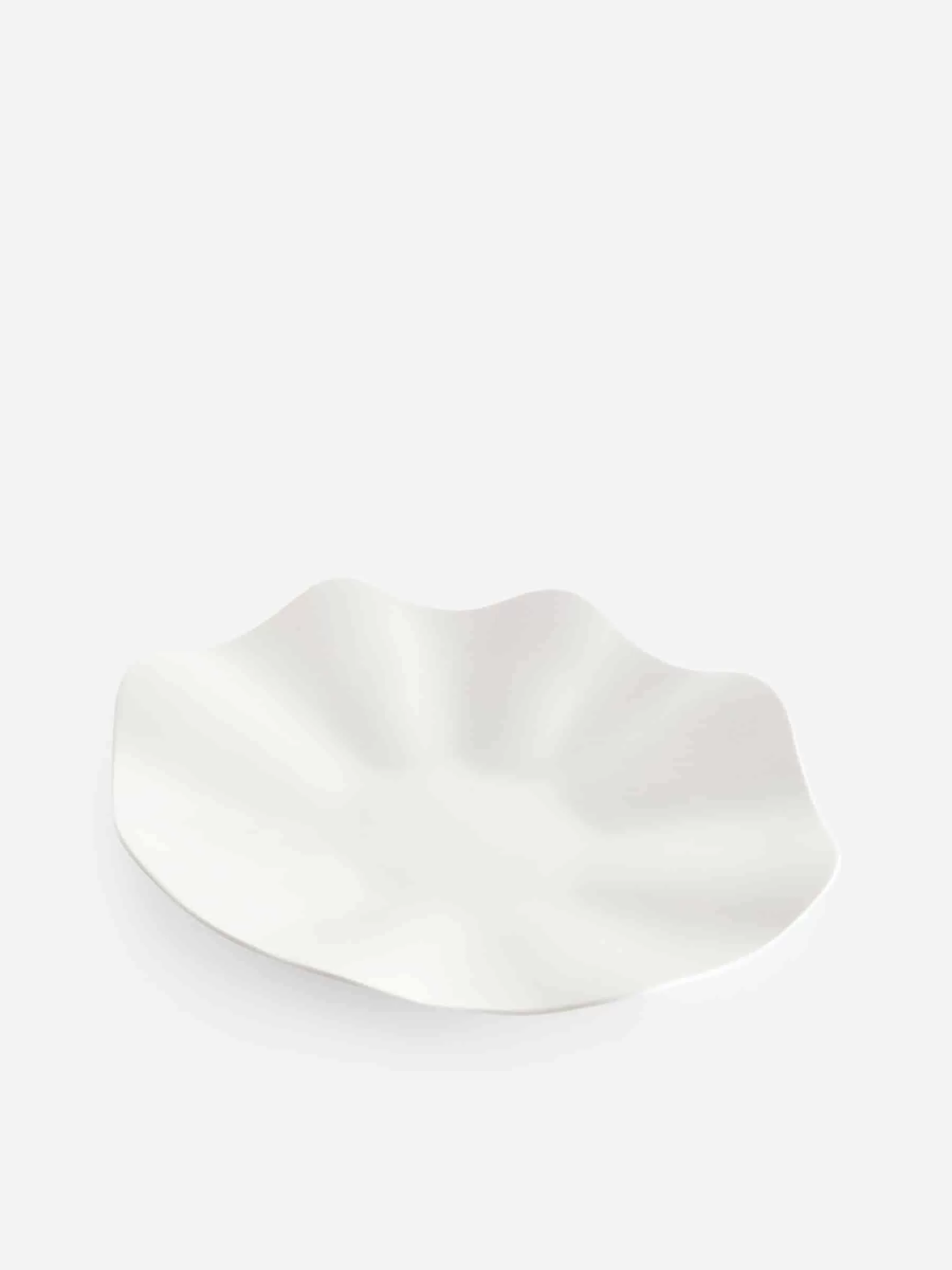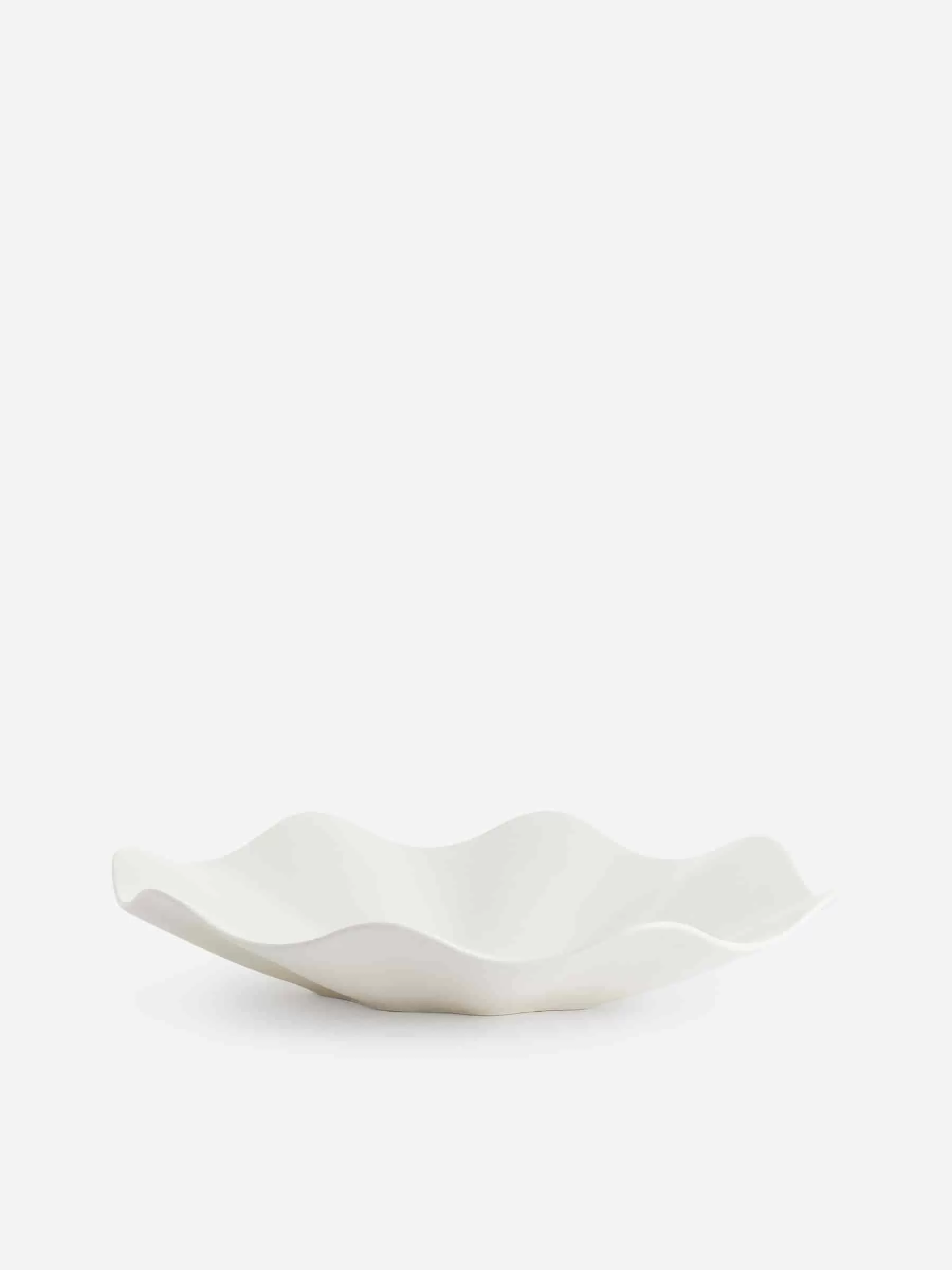 Servierschale mit eleganter Wellenform. Hergestellt aus glasiertem Steinzeug. Maße 26 cm x 34,5 cm. Höhe 5,3 cm/7,8 cm