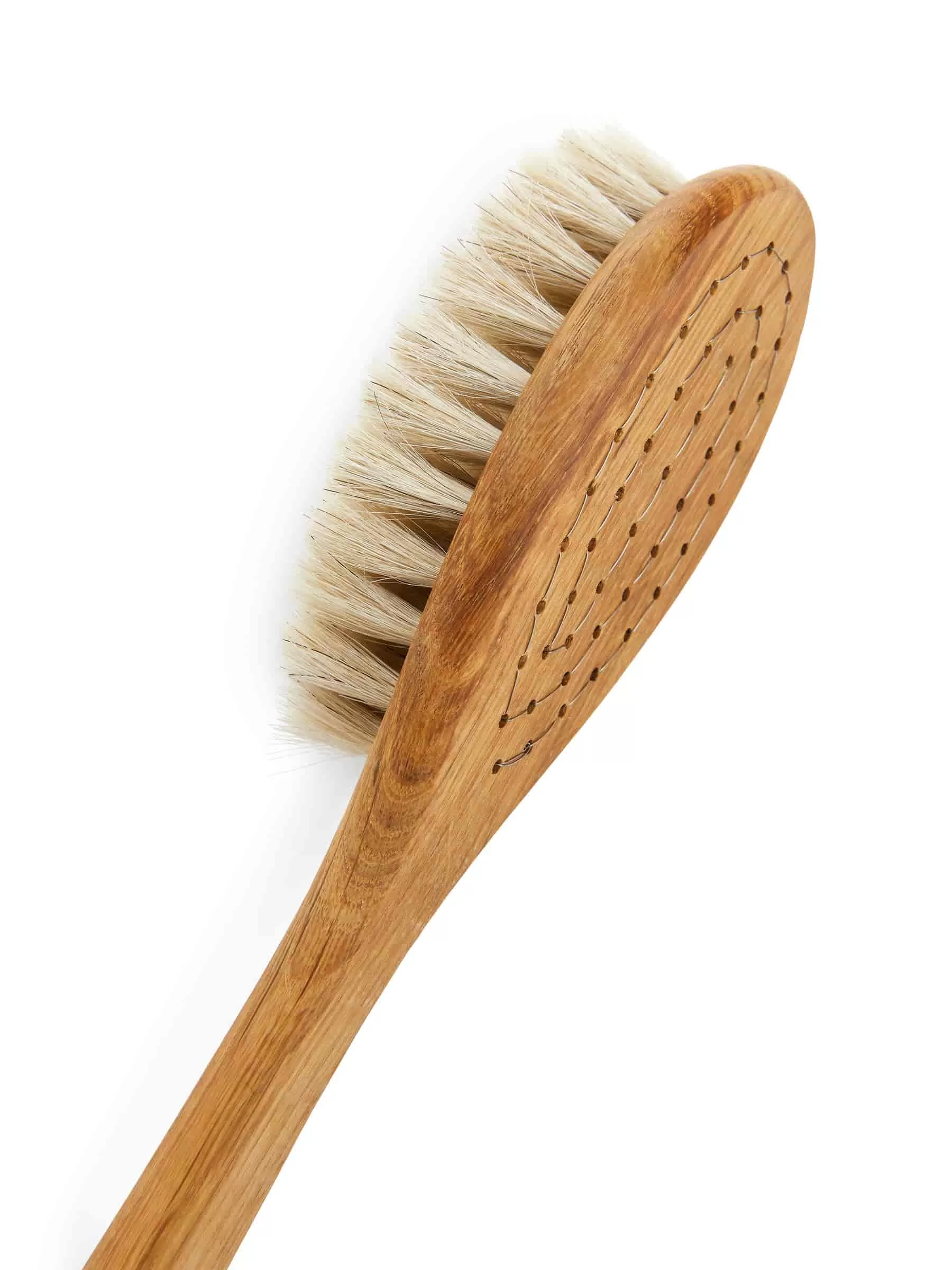 Badebürste mit Griff aus Eiche. Die biegsamen Borsten helfen dabei, einen angenehmen Schaum Ihrer Seife zu erzeugen. Lassen Sie die Bürste nach dem Gebrauch hängend trocknen, um das Wasser vom Holz abzuleiten. Grifflänge 39 cm. Der Borstenteil ist 4 cm x 7 cm groß. Von der schwedischen Marke Iris Hantverk.