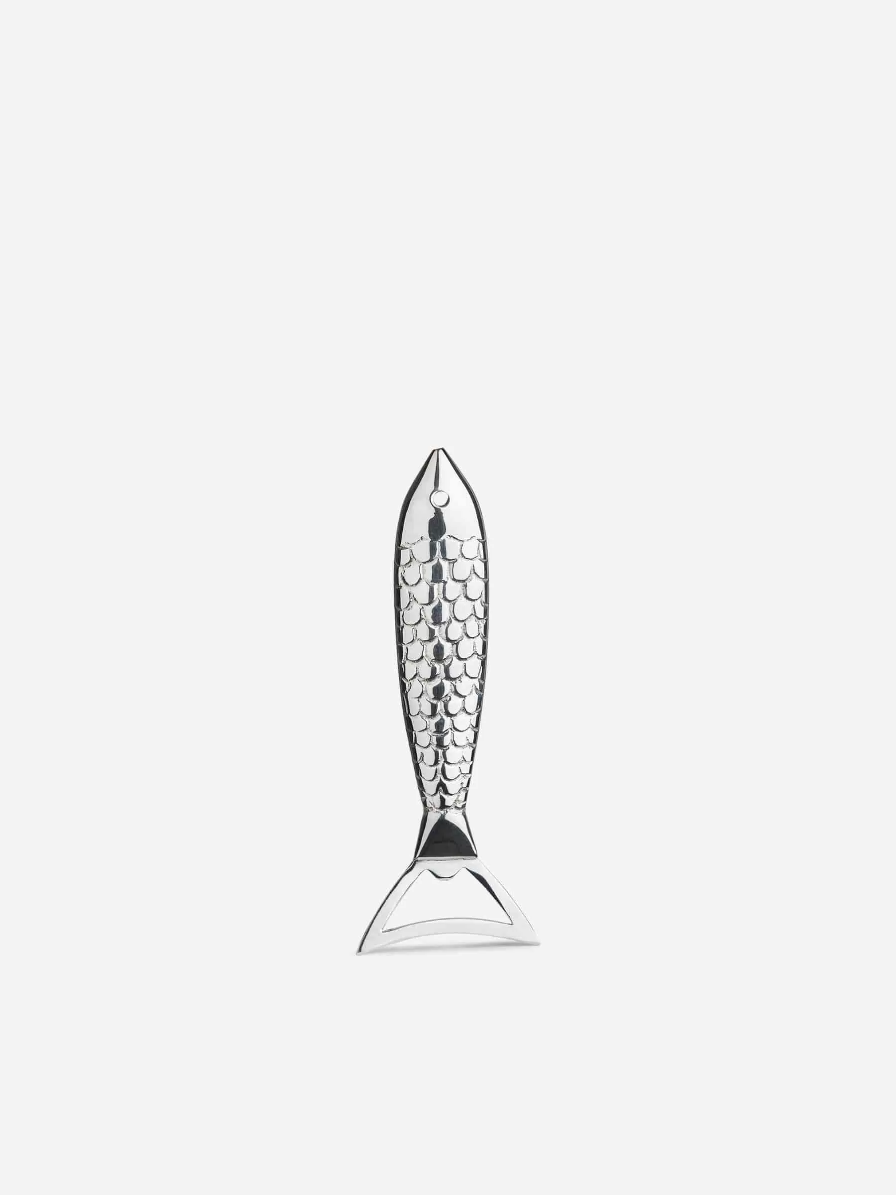 Fischförmiger Flaschenöffner, handgefertigt aus Messing mit versilberter Oberfläche. Länge 14,5 cm.