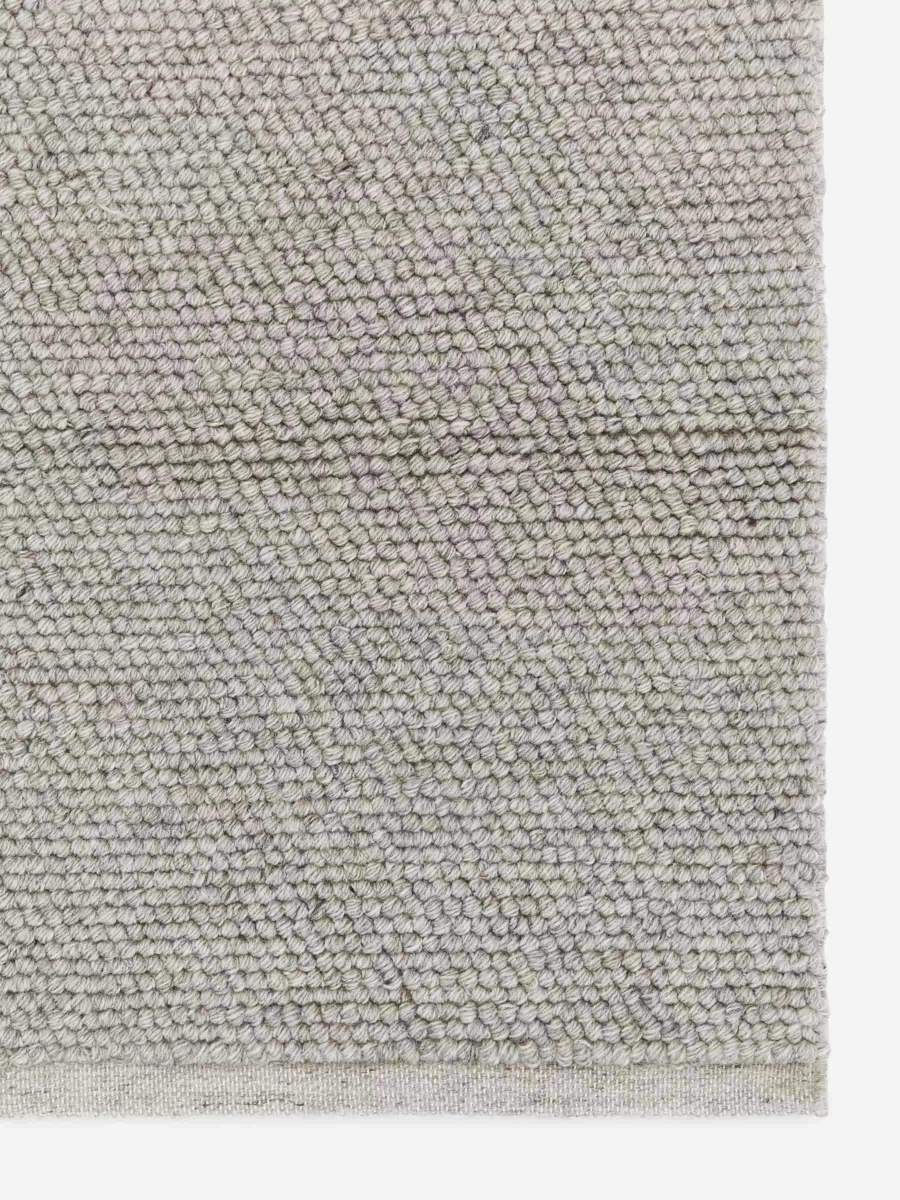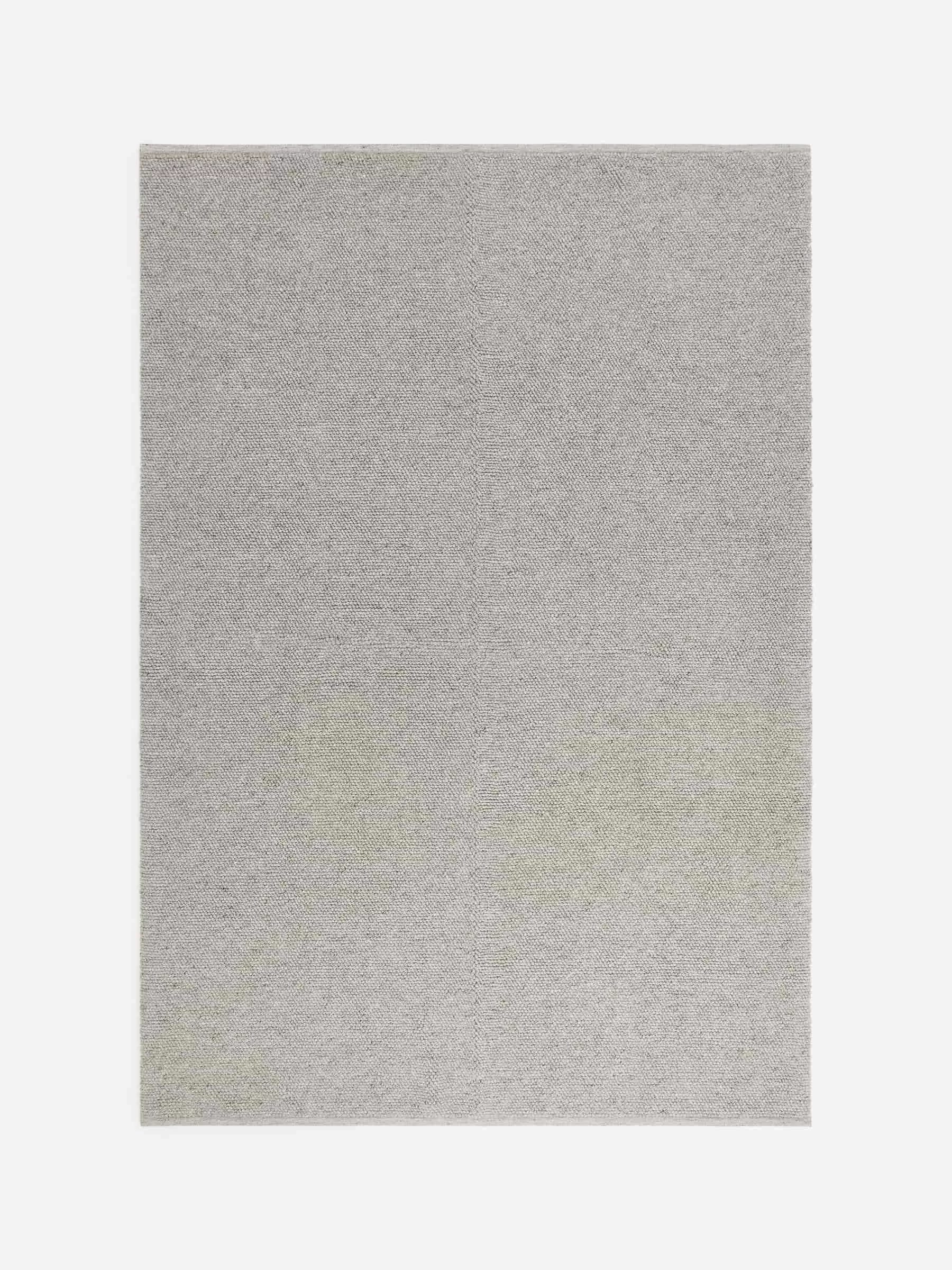 Dieser Teppich hat eine sanfte Melange-Farbe und eine sprudelnde Textur und ist aus Wollgarn gewebt.