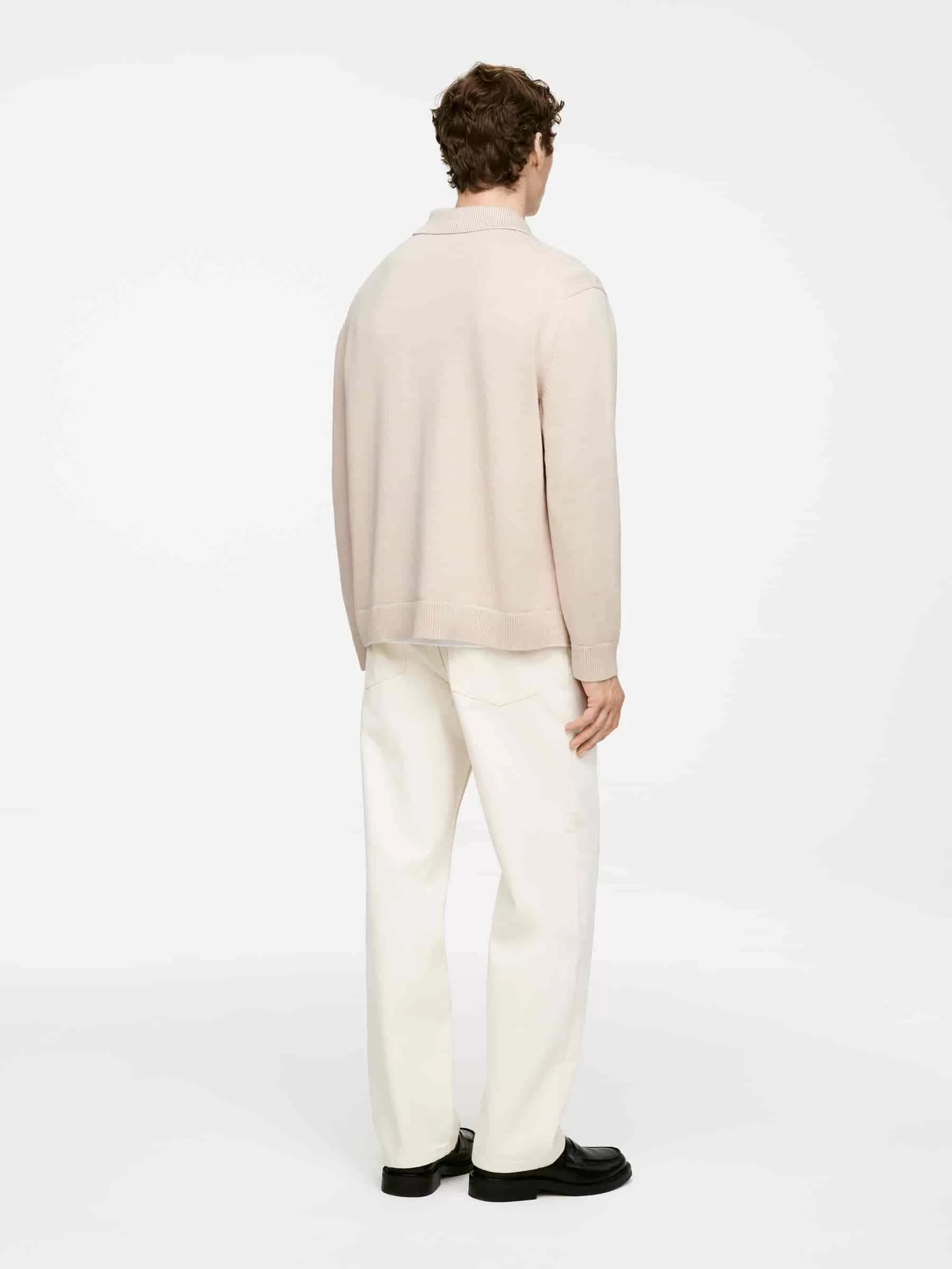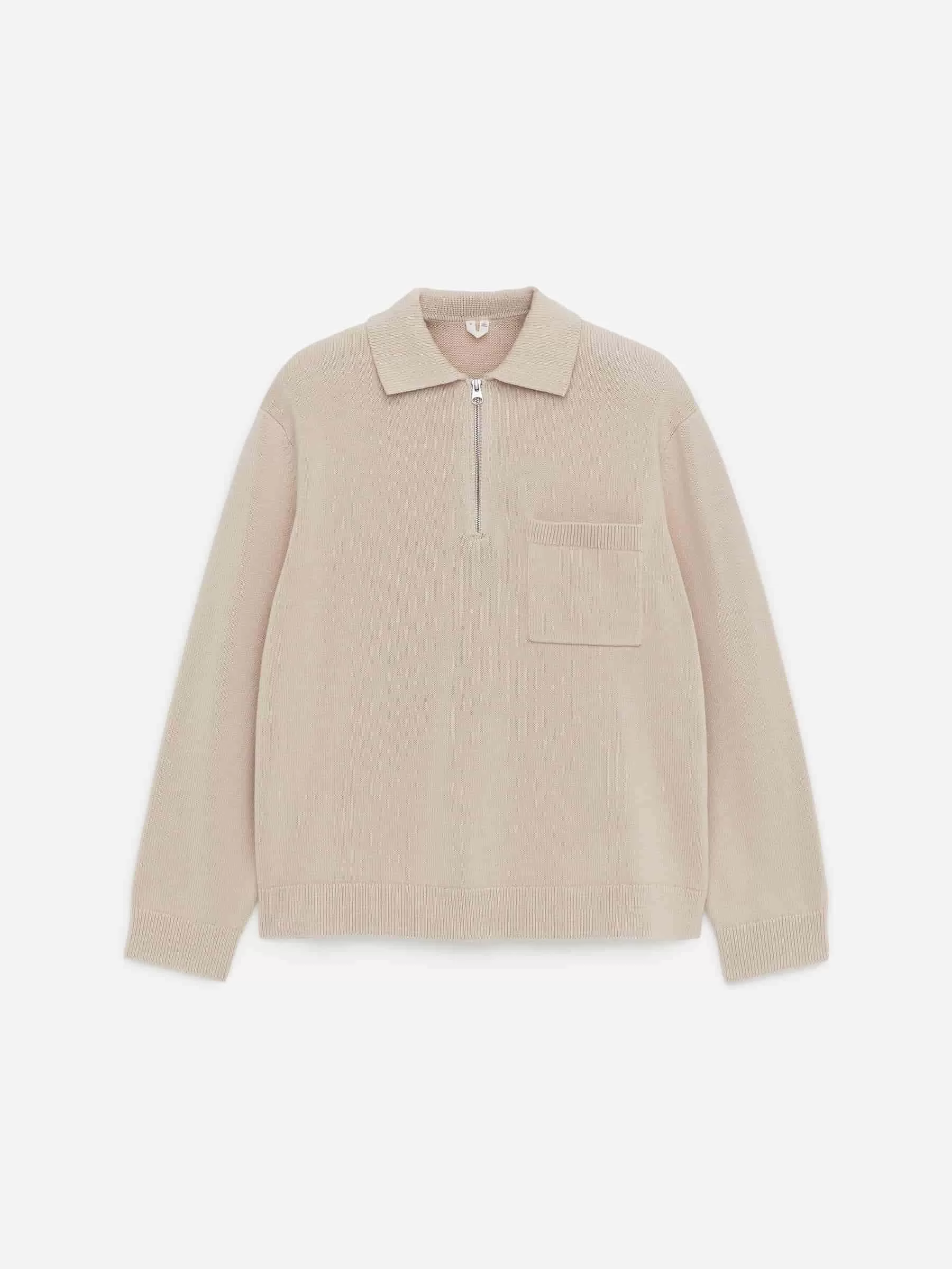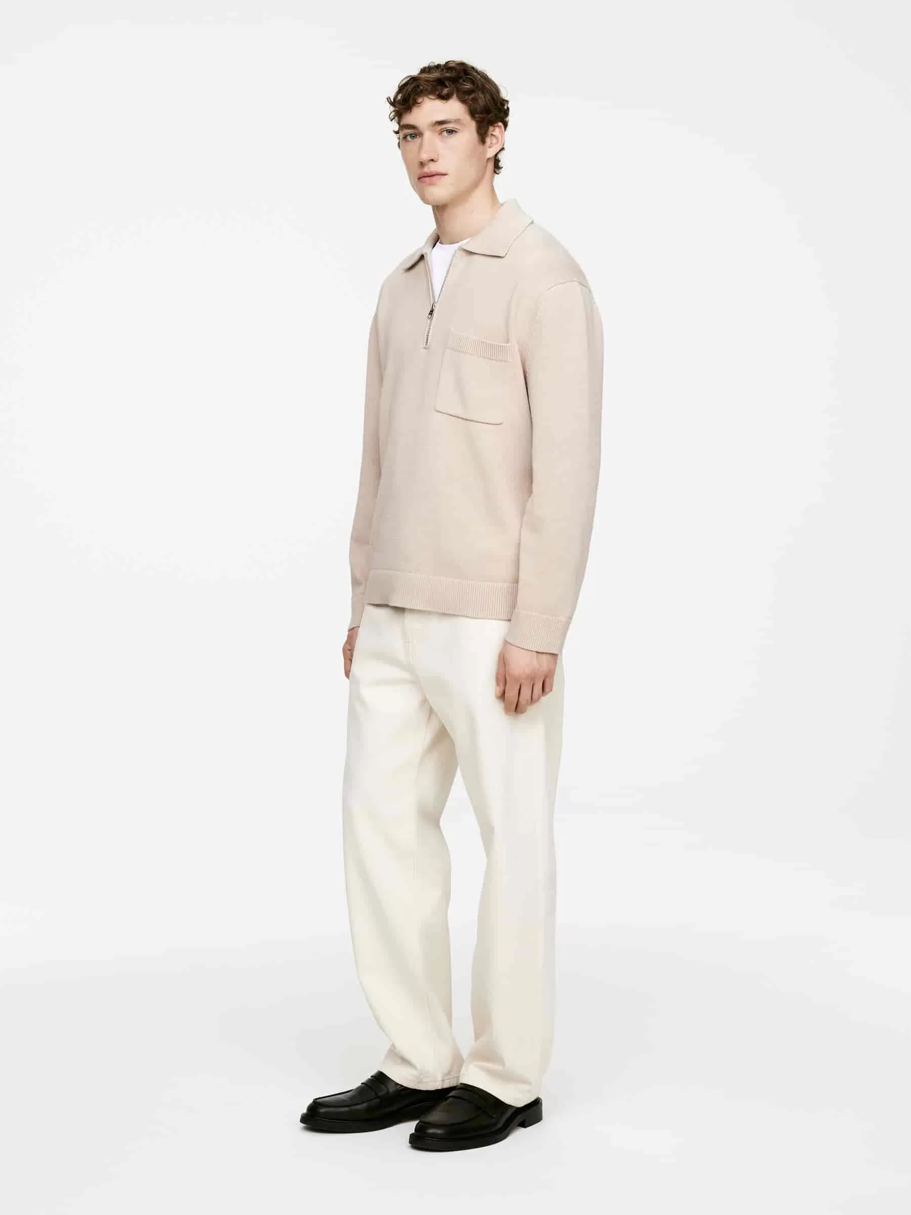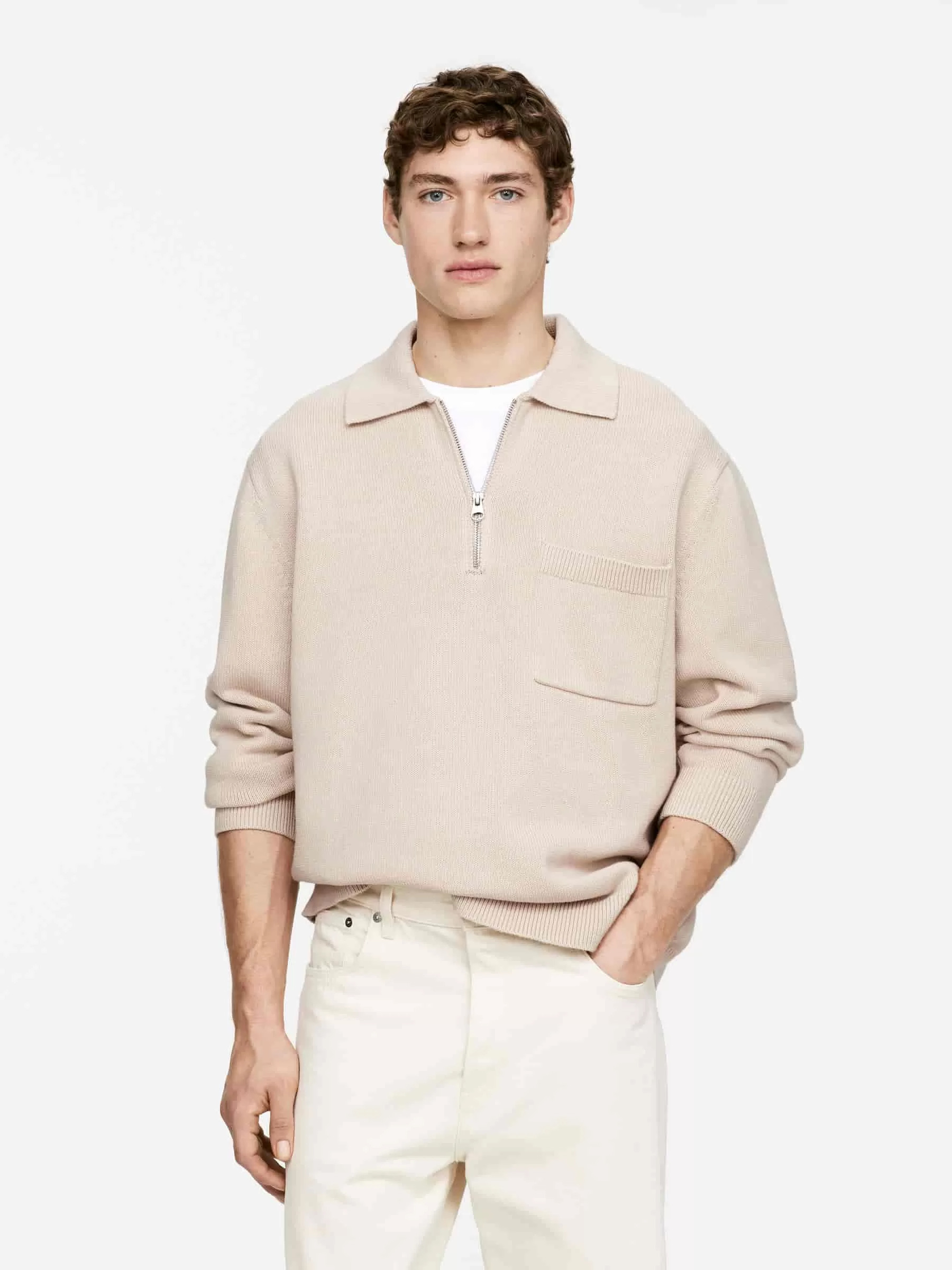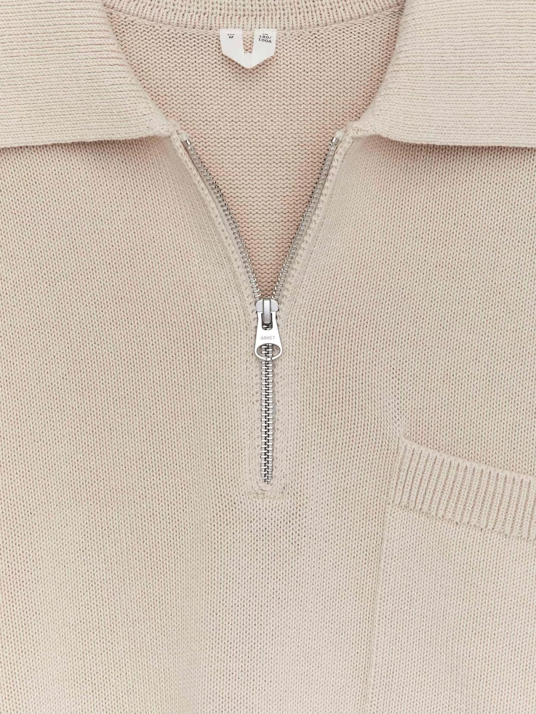 Flachgestrickter Baumwollpullover mit halbem Reißverschluss. Rippstrickkragen und eine einzelne Brusttasche. Gerippte Besätze.
