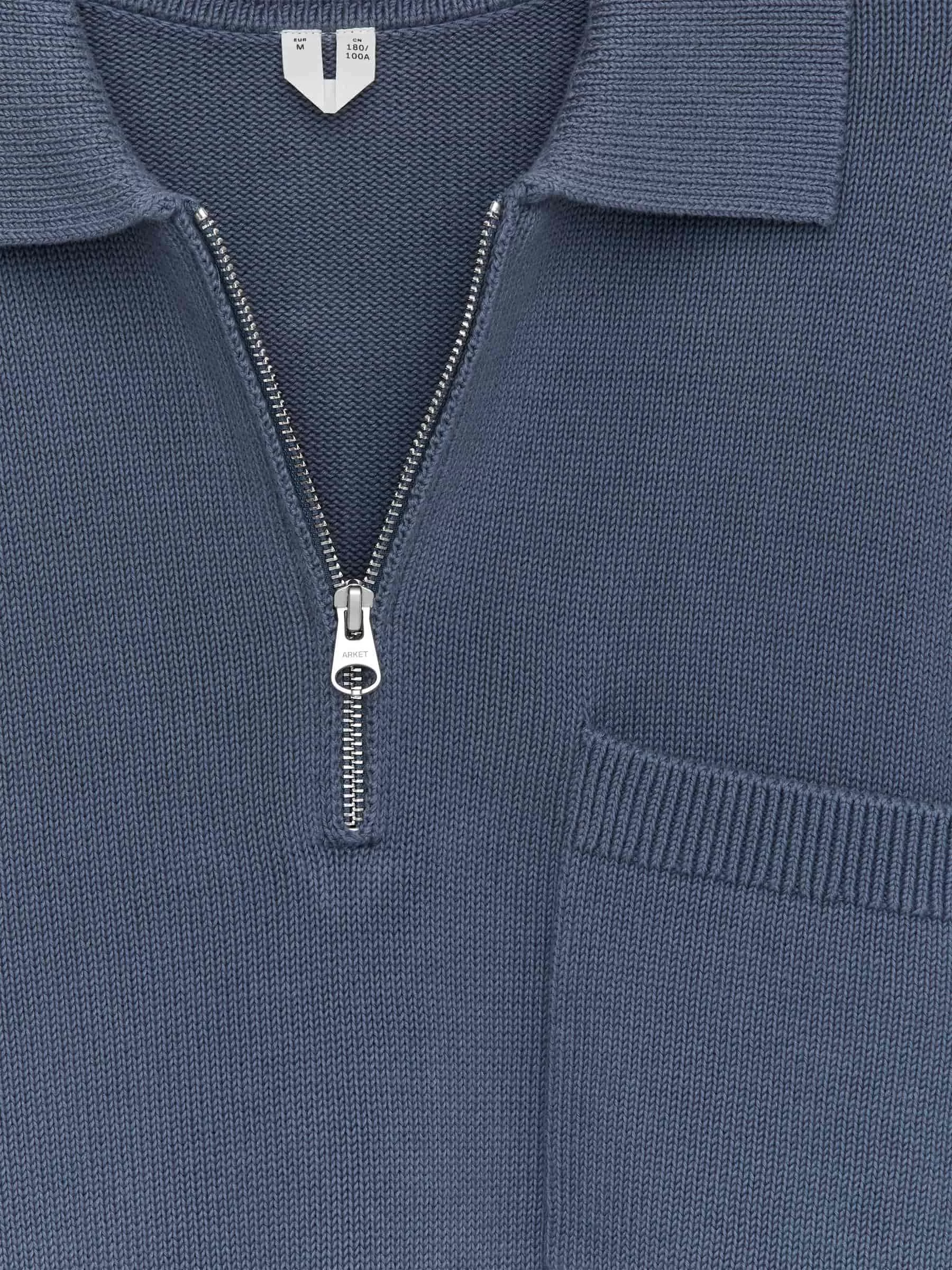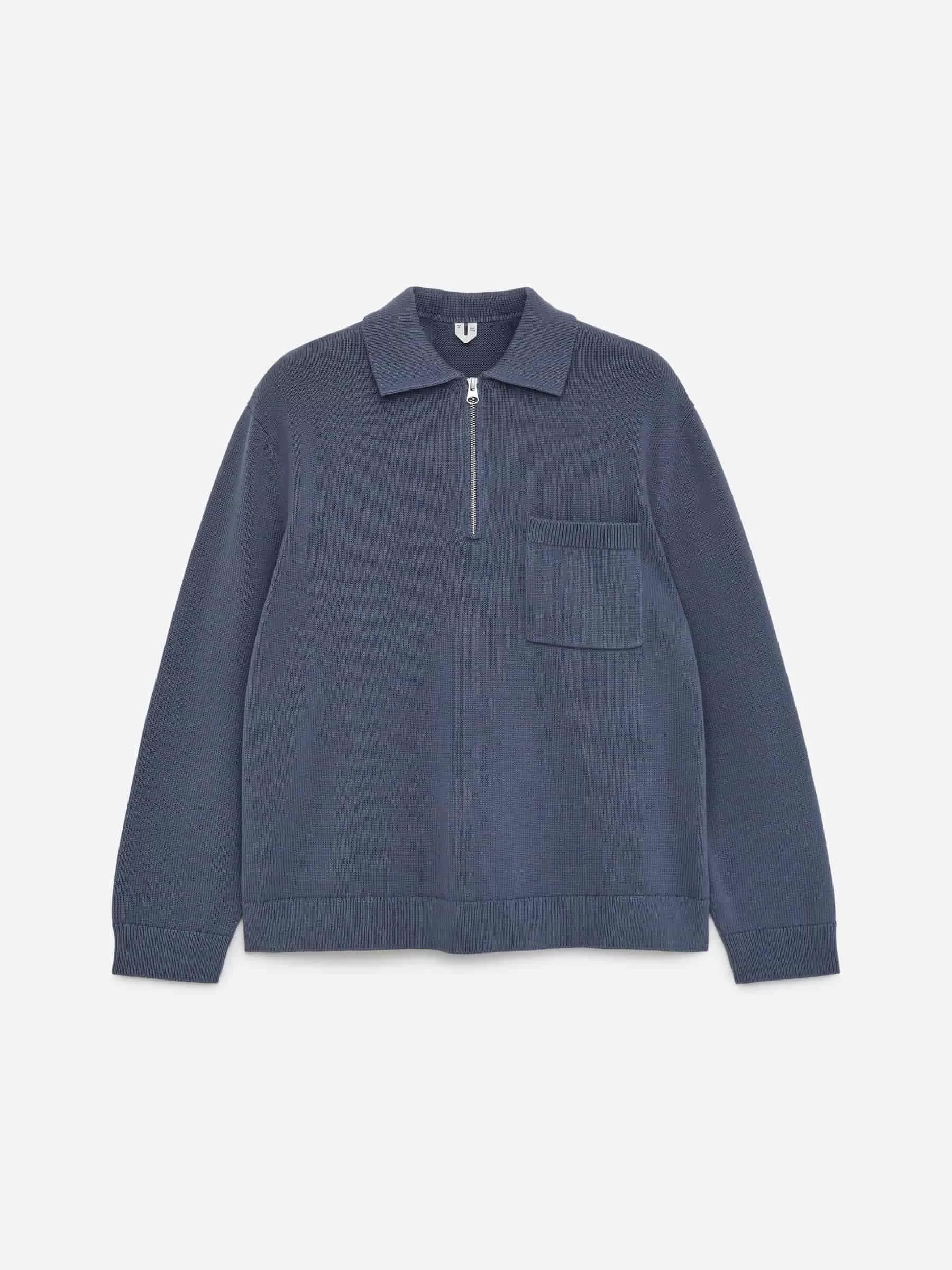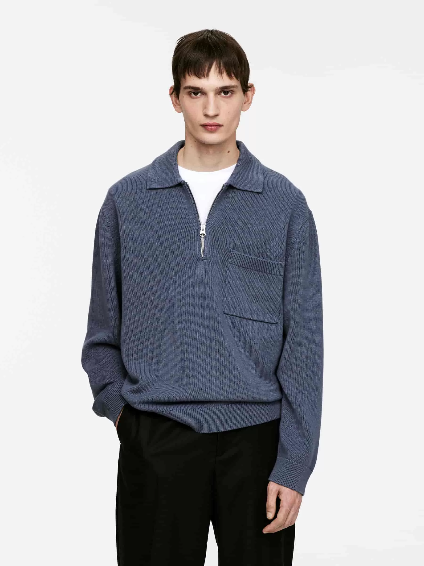 Flachgestrickter Baumwollpullover mit halbem Reißverschluss. Rippstrickkragen und eine einzelne Brusttasche. Gerippte Besätze.