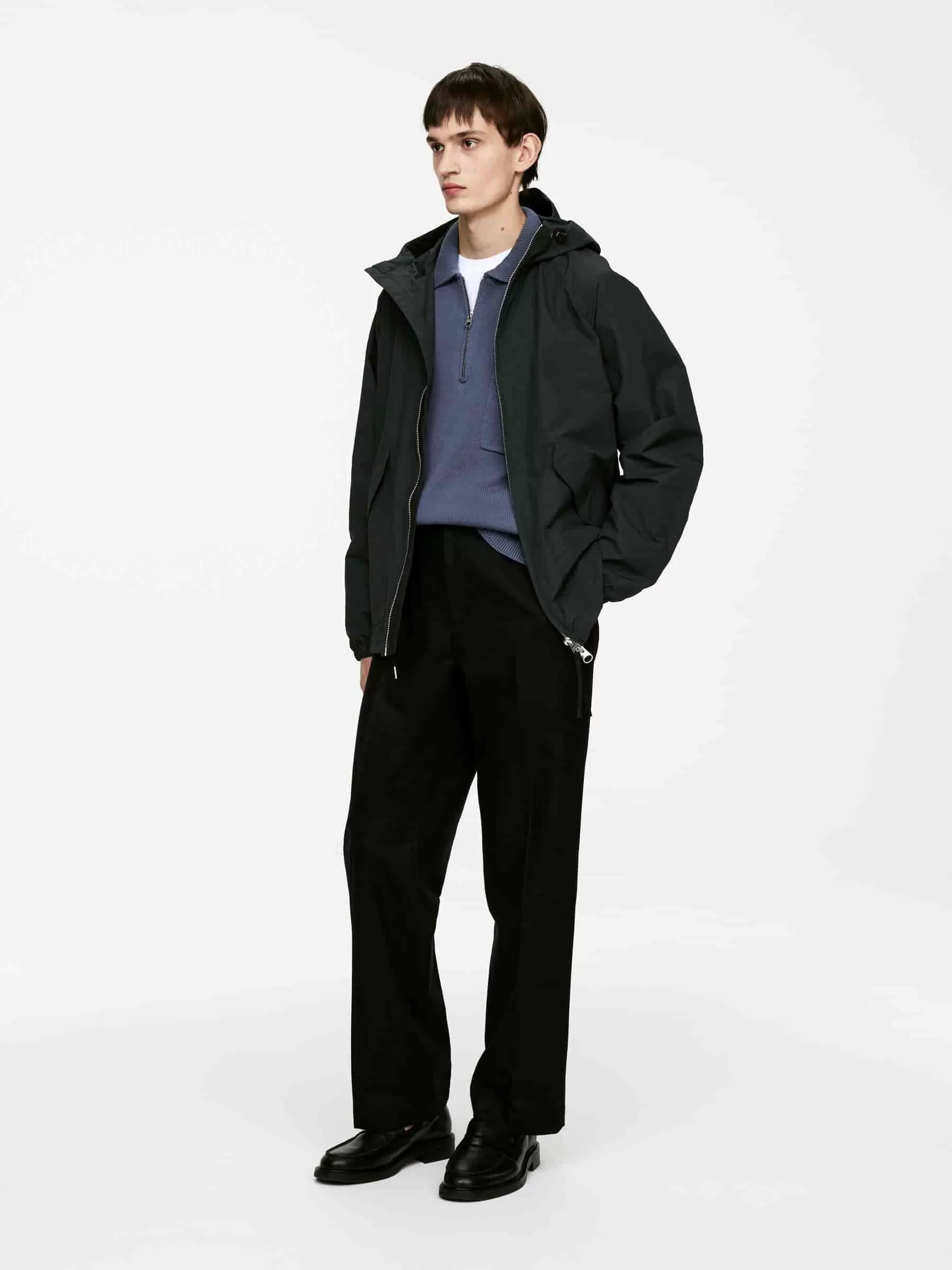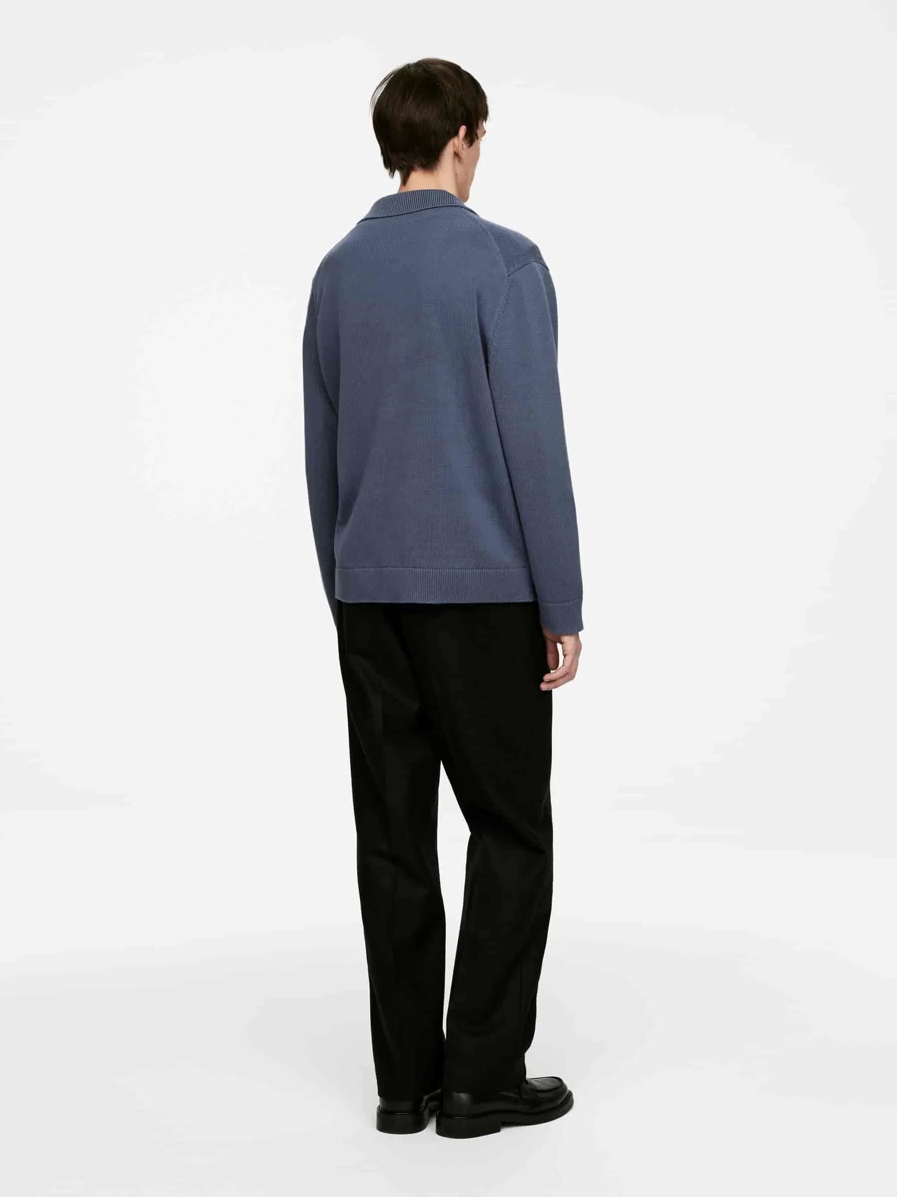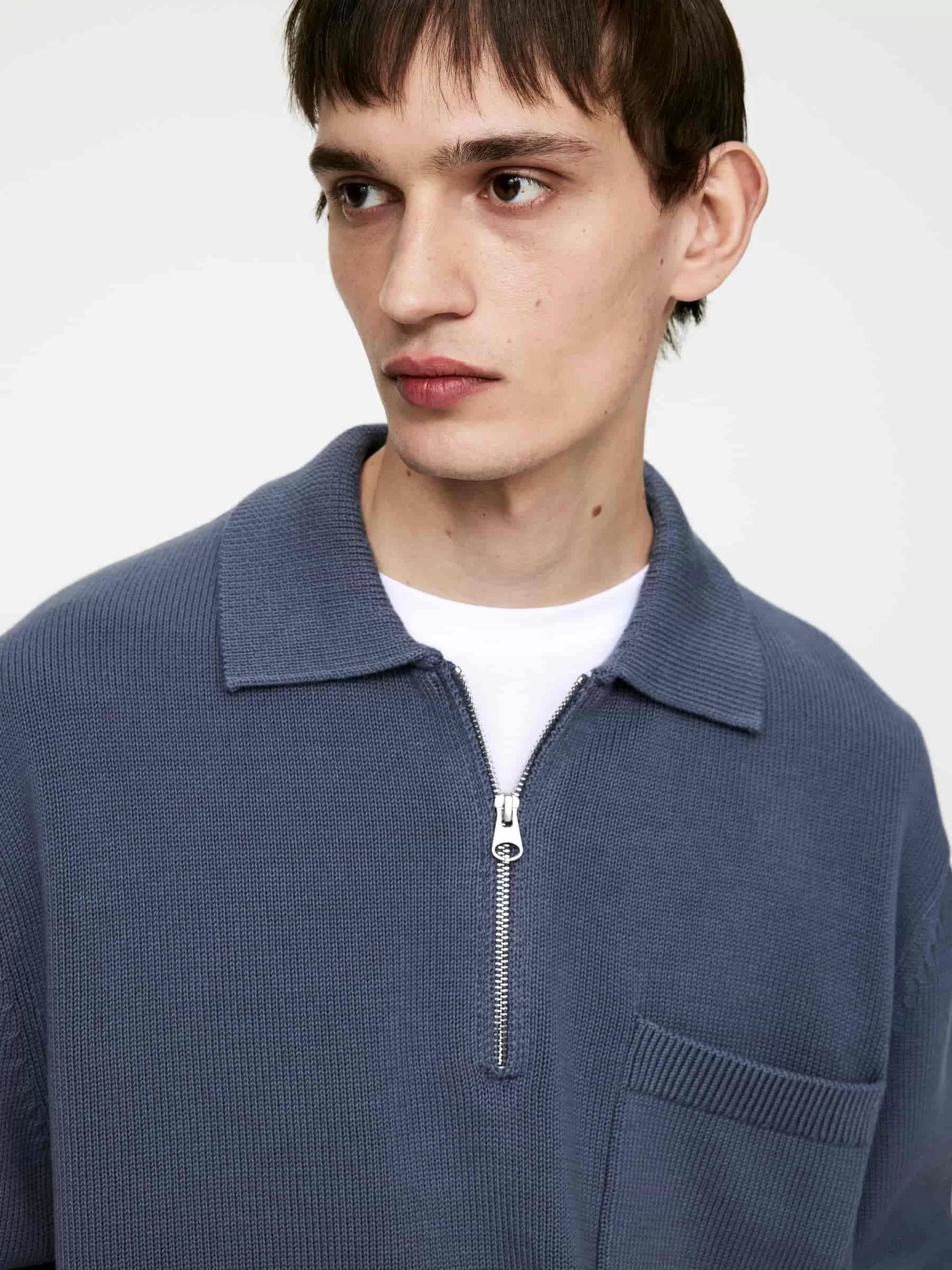 Flachgestrickter Baumwollpullover mit halbem Reißverschluss. Rippstrickkragen und eine einzelne Brusttasche. Gerippte Besätze.