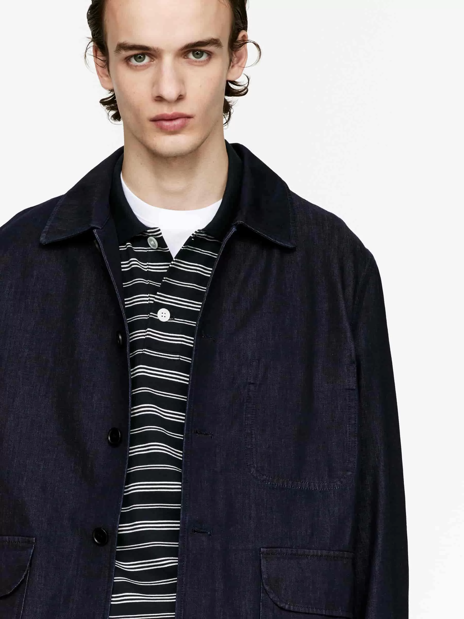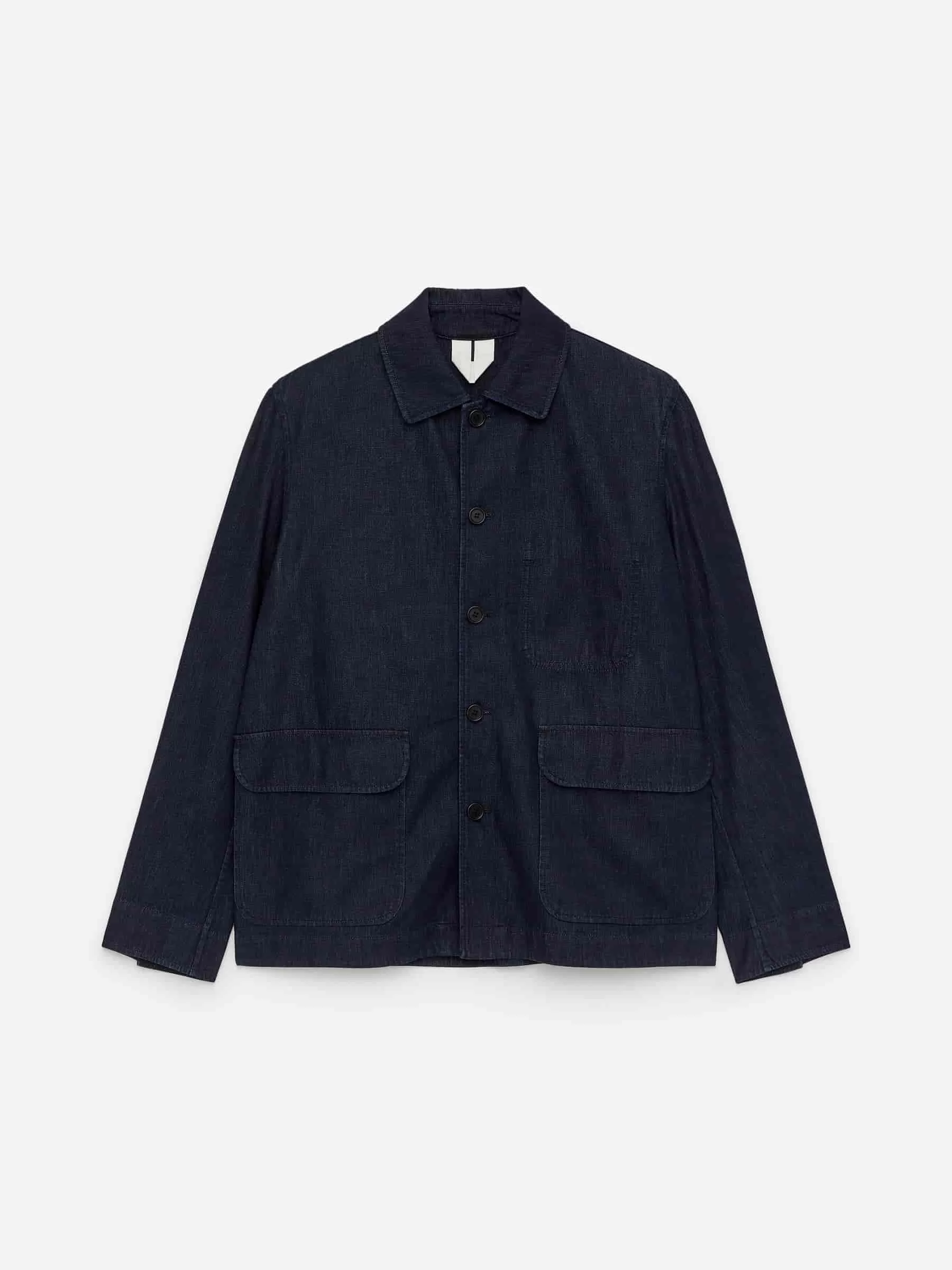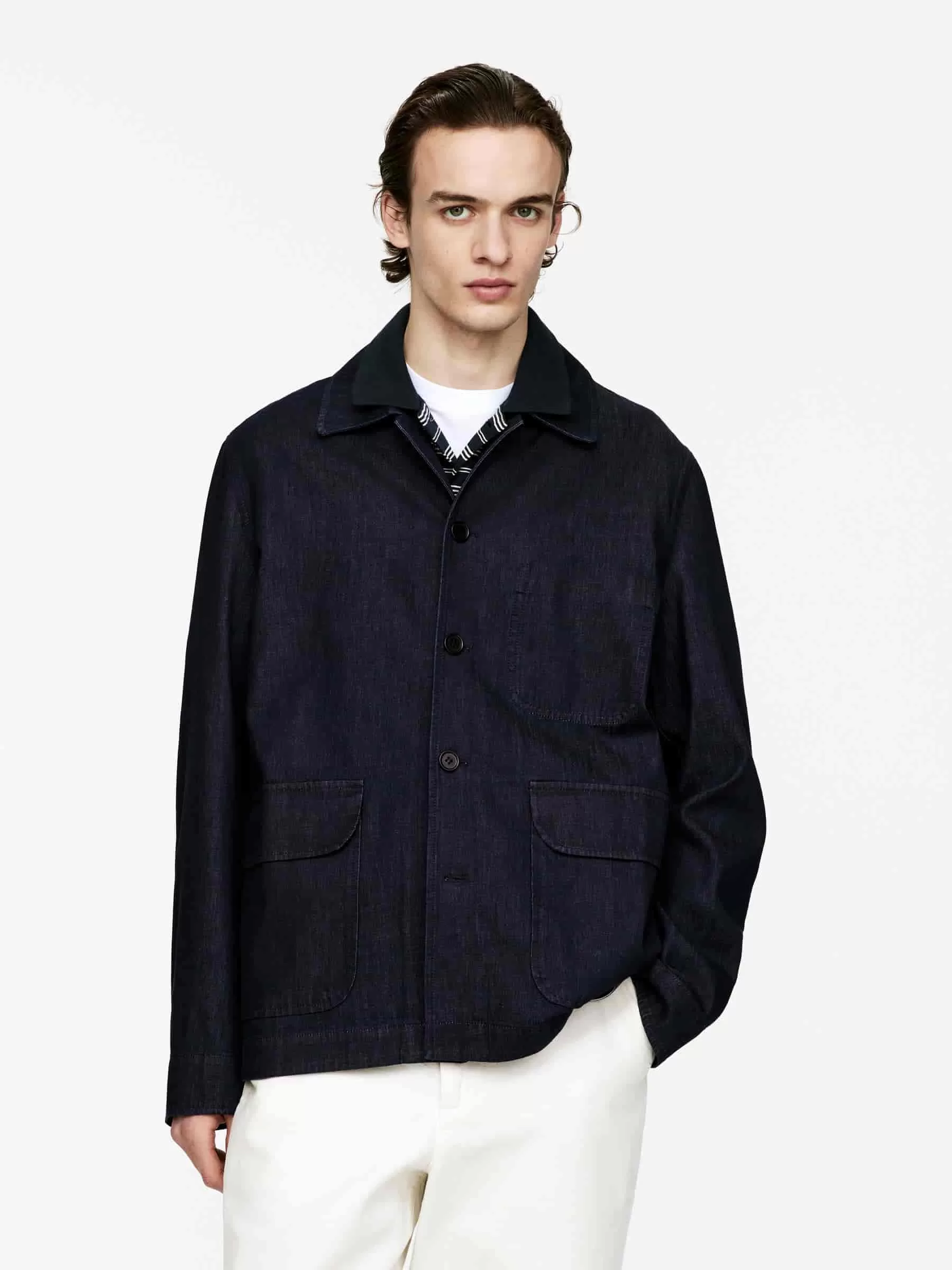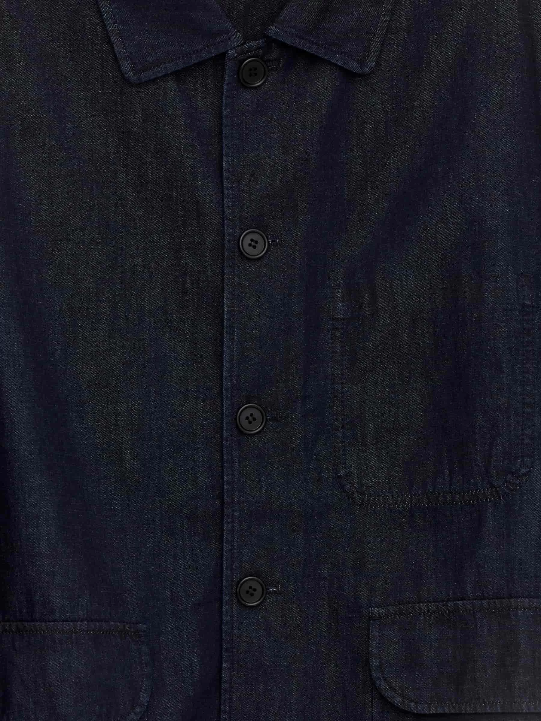 Jeansjackenschnitt für eine entspannte Passform. Mit normalem Kragen und Knopfleiste vorne. Zwei aufgesetzte Taschen mit Klappen und eine einzelne Brusttasche. Verstellbare Manschetten mit Knöpfen. Innentasche.