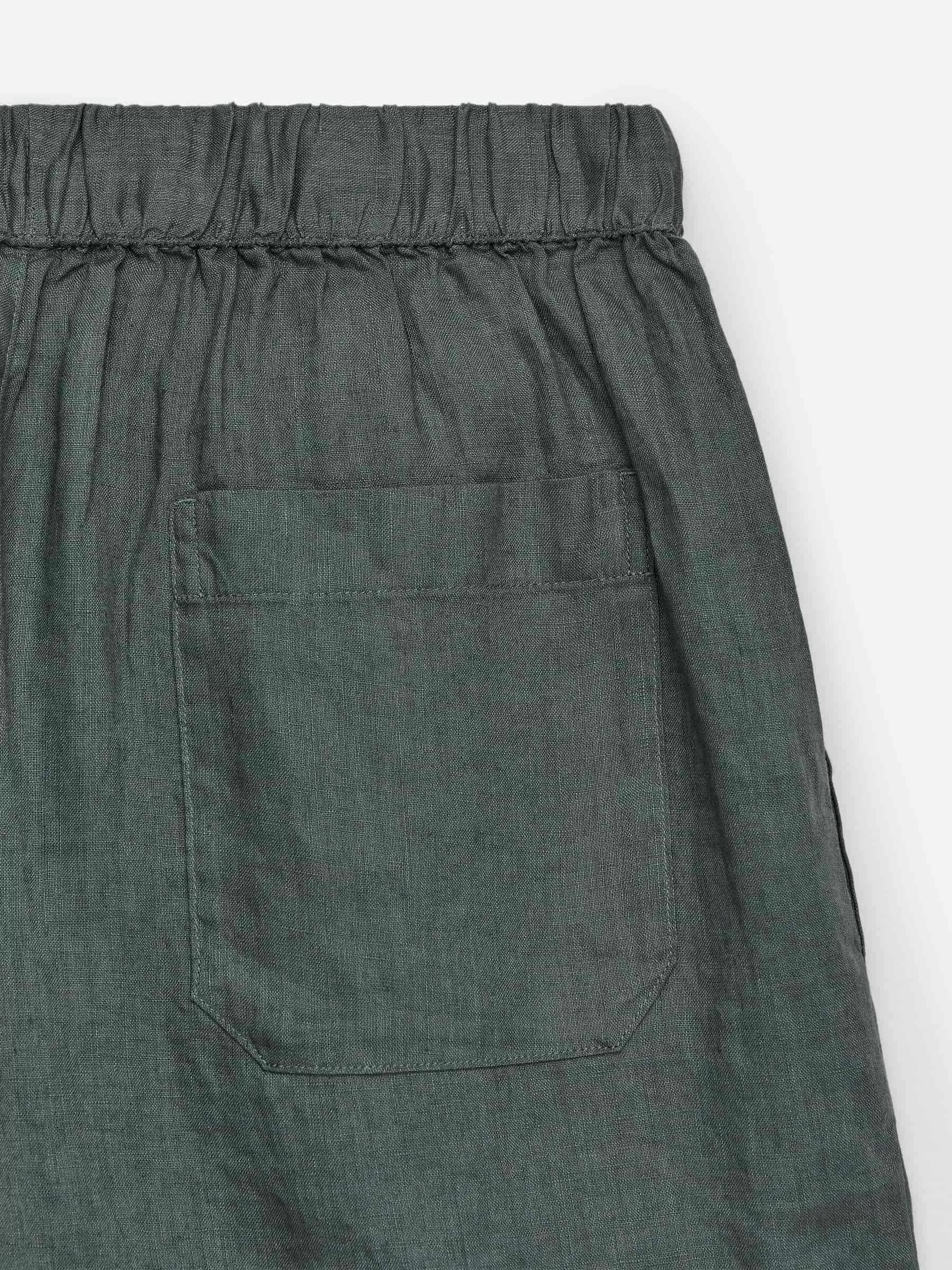 Leinenshorts mit normaler Passform. Ein Pull-on-Stil mit Gummizügen und Kordelzug in der Taille, Taschen an den Seitennähten und einer einzelnen aufgesetzten Tasche hinten. Knopfleiste.