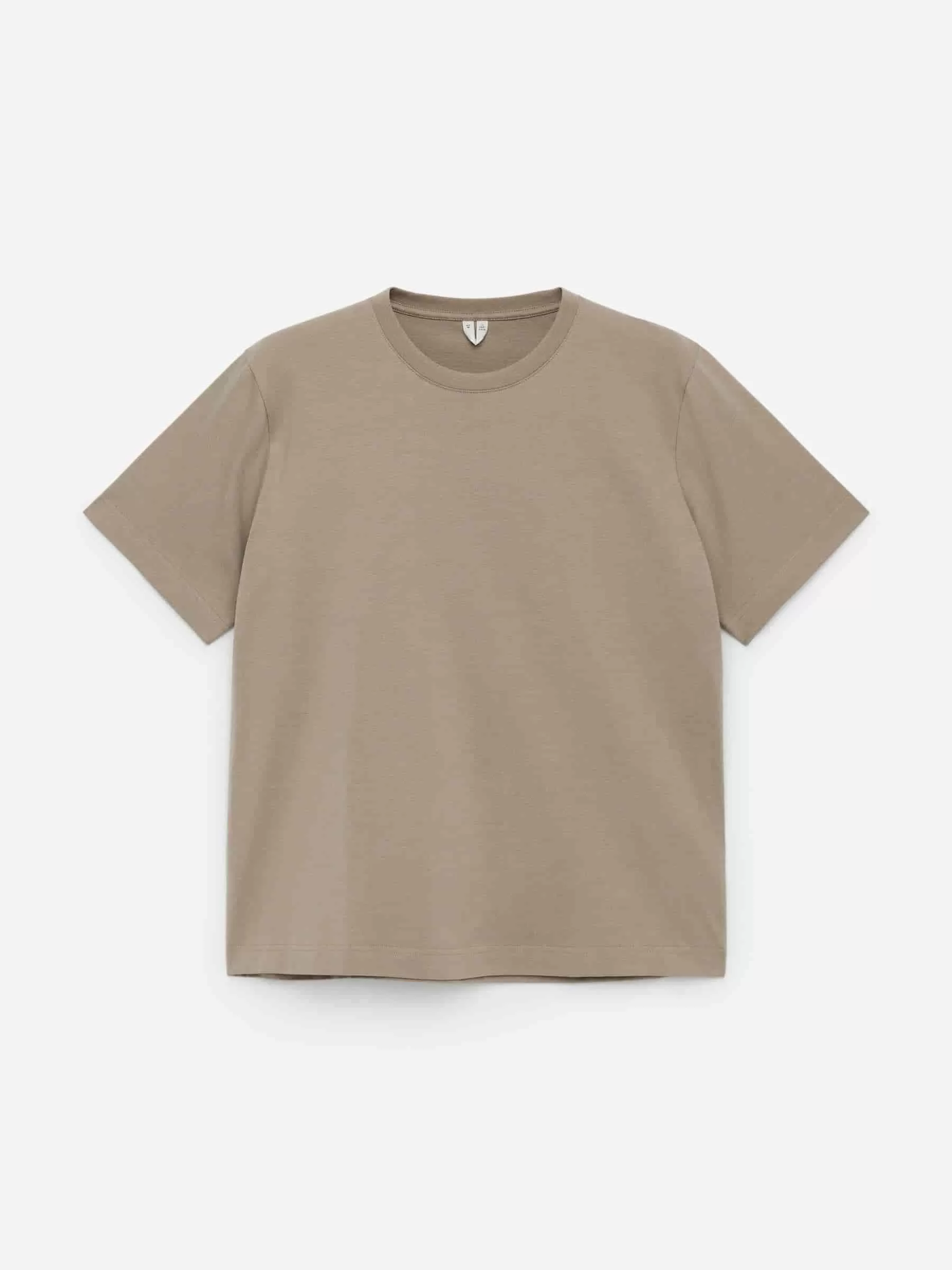 Klassischer T-Shirt-Schnitt mit Rundhalsausschnitt für eine normale Passform. Es besteht aus 220 GSM Single Jersey, was darauf hinweist, dass es sich um die mittelschwere Version der Standard-T-Shirts von ARKET handelt.