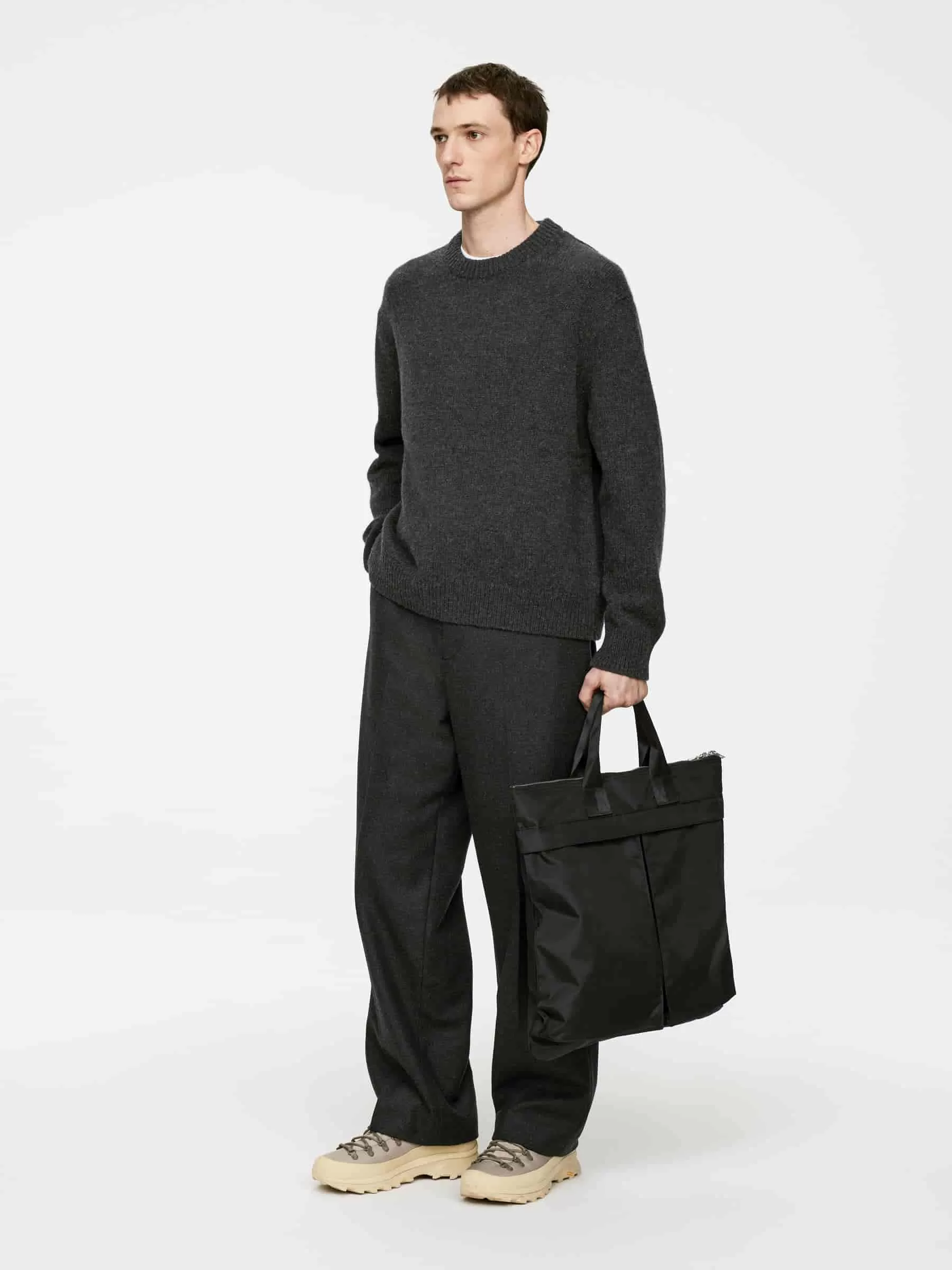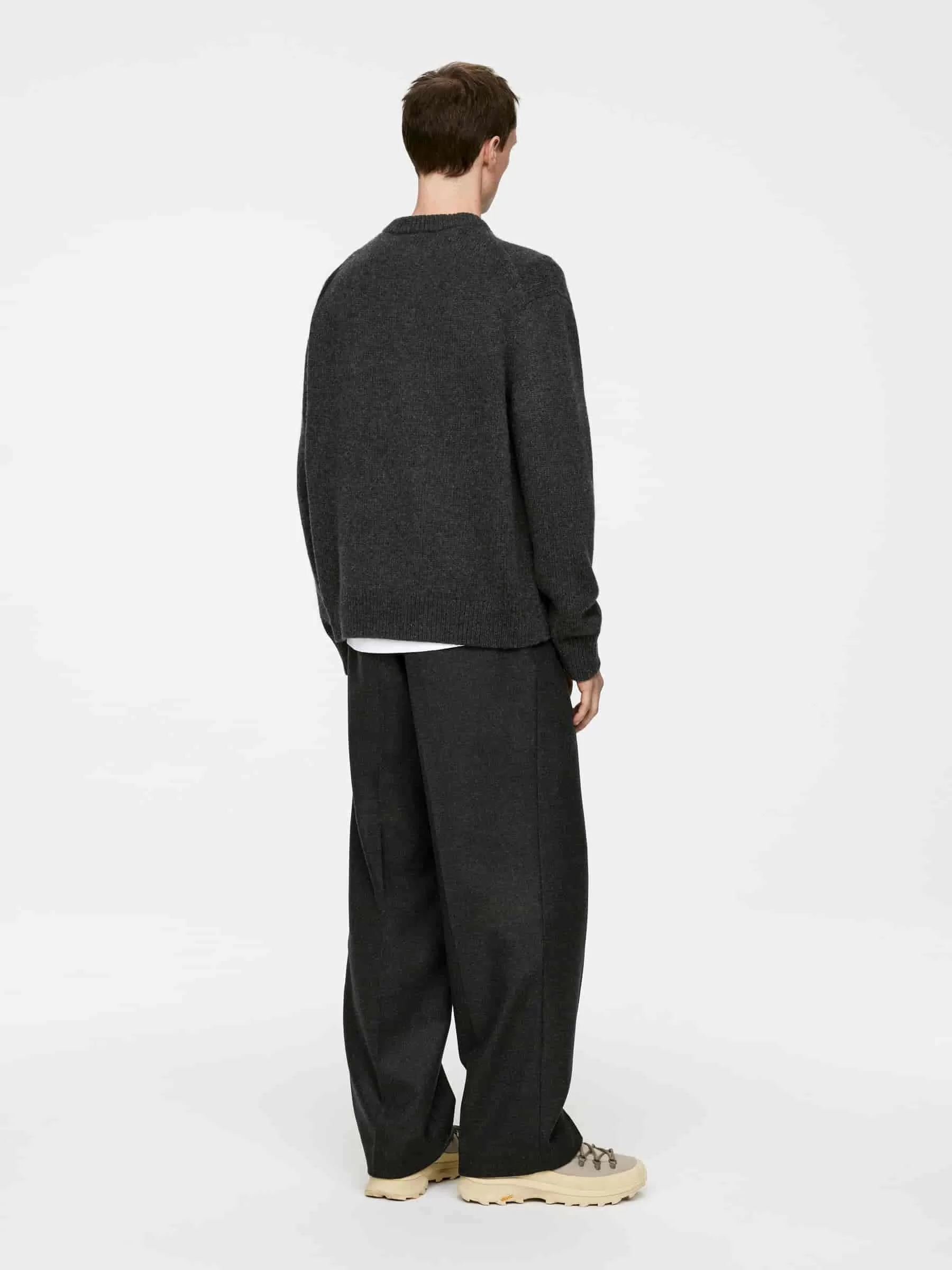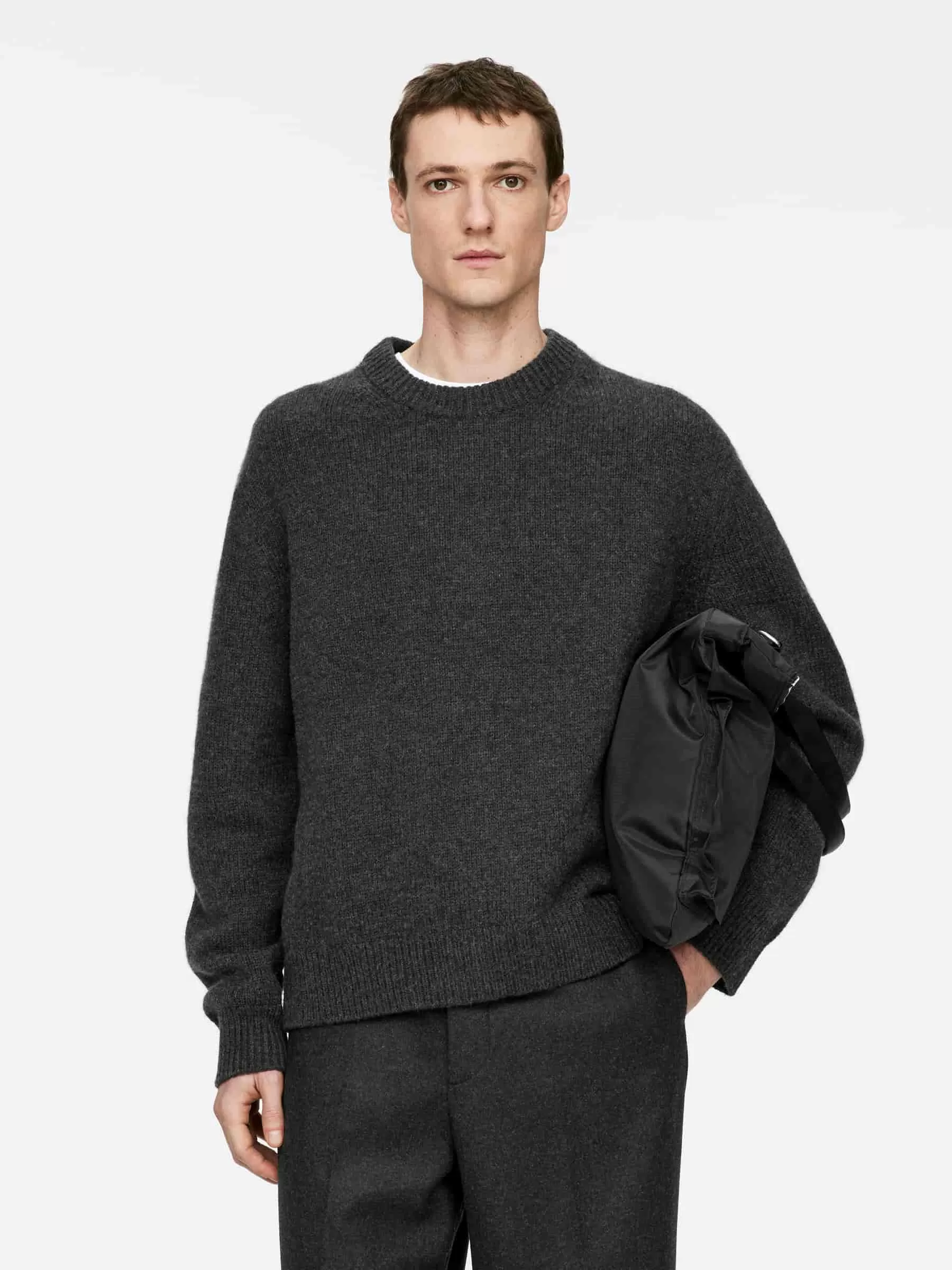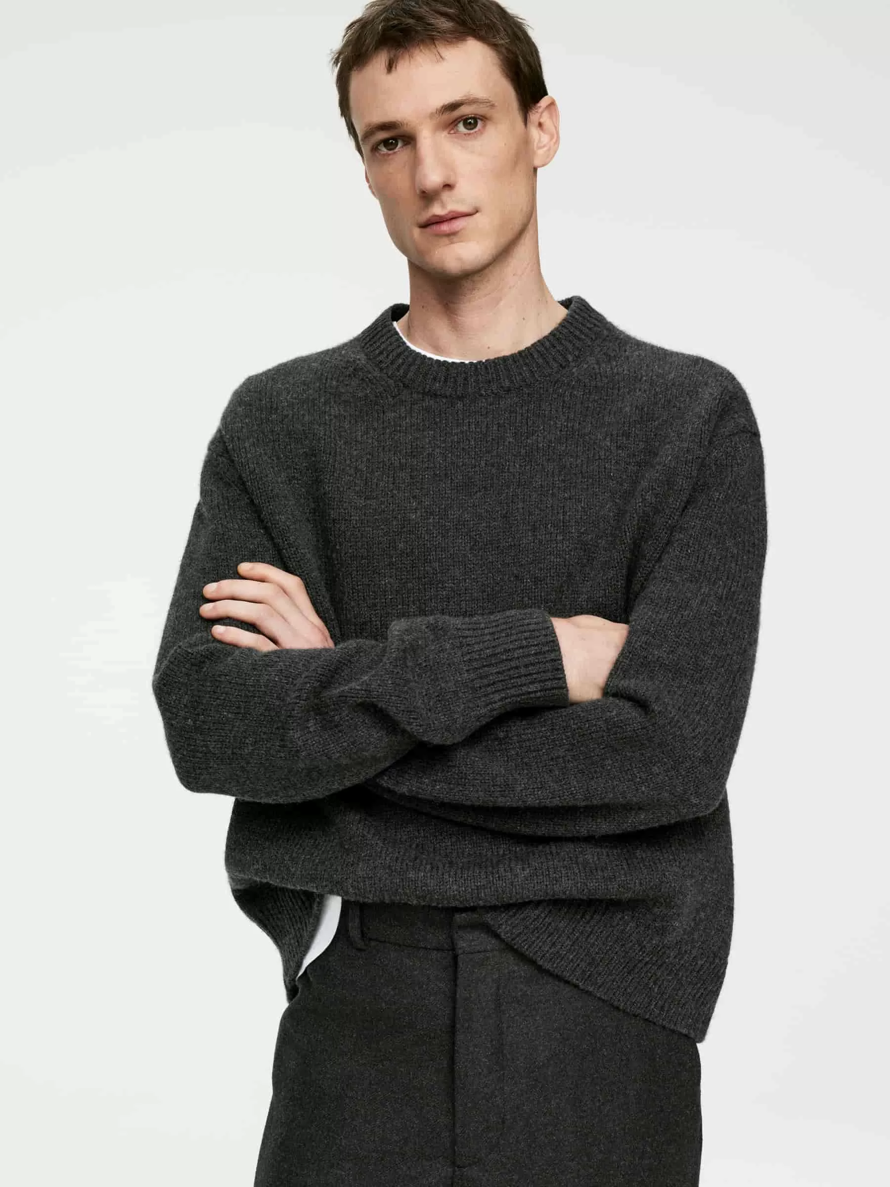 Klobiger Pullover aus Glattstrick mit übergroßer Passform und kastenförmiger Silhouette. Hergestellt aus weicher Wolle mit Nylonzusatz für ein leichtes Tragegefühl. Ein Rundhalsausschnitt mit Rippstrickbesätzen.