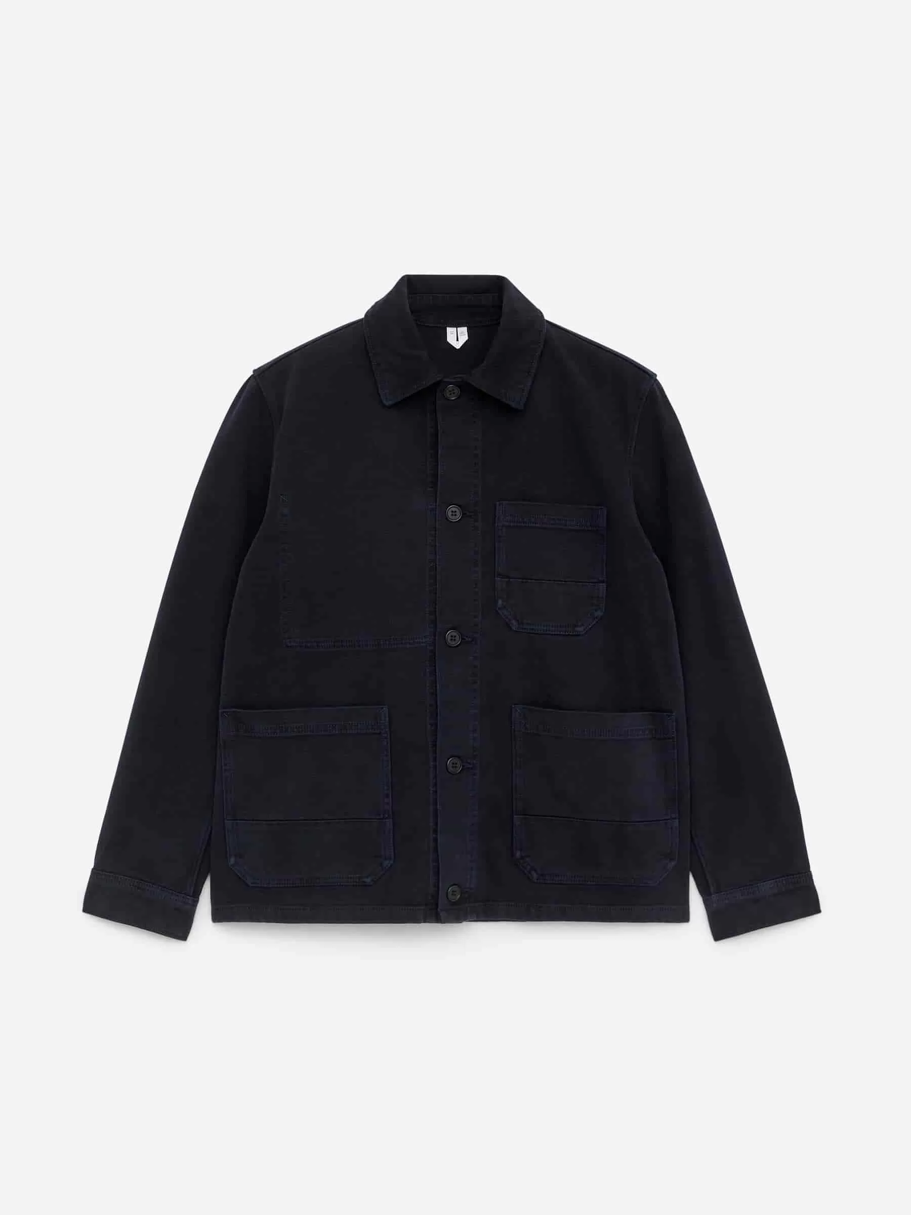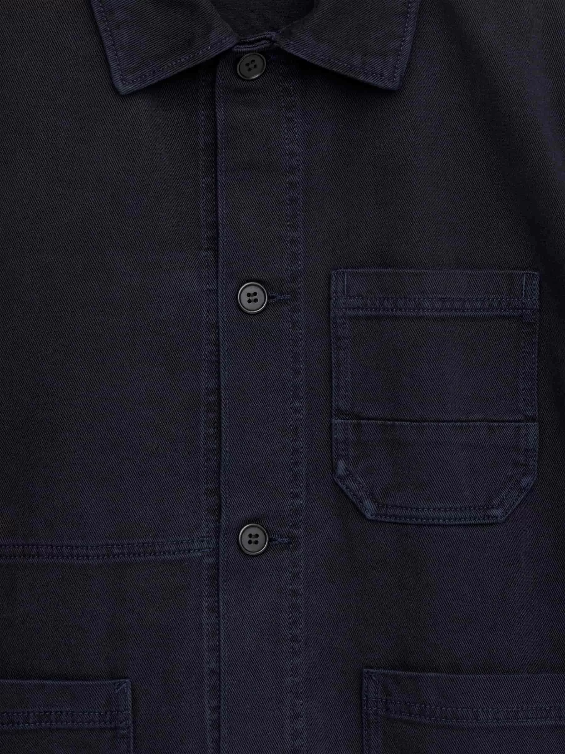 Dieses Überhemd aus gebürstetem Baumwolltwill ist vom französischen Arbeitskleidungsstil inspiriert. Mit einer leicht kastenförmigen Passform und einer Knopfleiste vorne wirkt diese Version überfärbt.