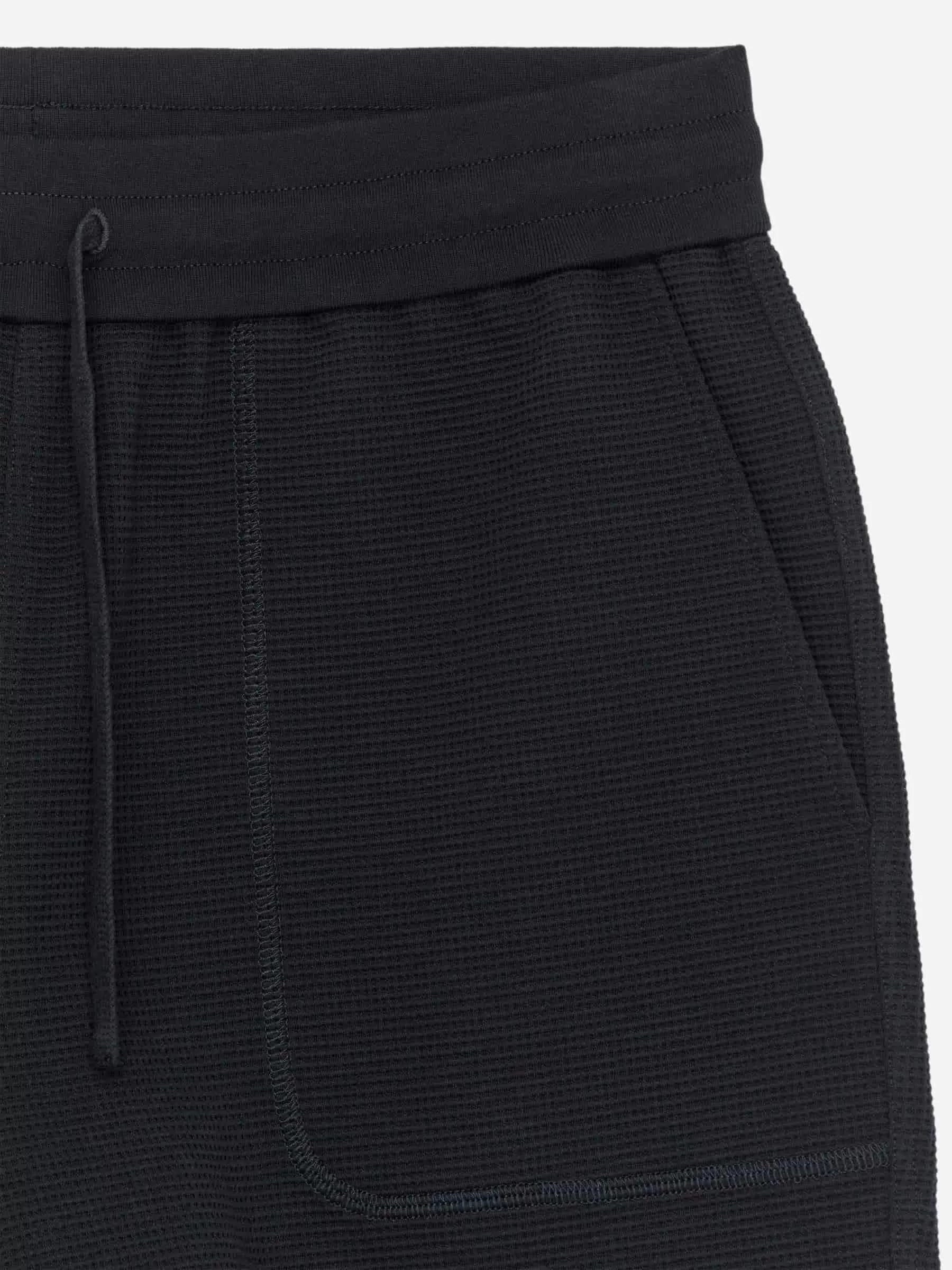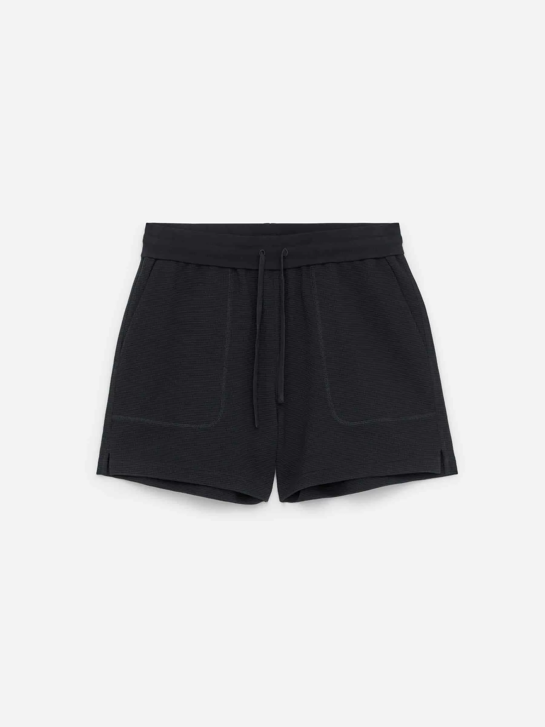 Shorts aus dehnbarem Waffelstrick-Jersey. Elastischer Bund mit Kordelzug. Schräge Taschen. Kurze Schlitze an den Seitennähten.