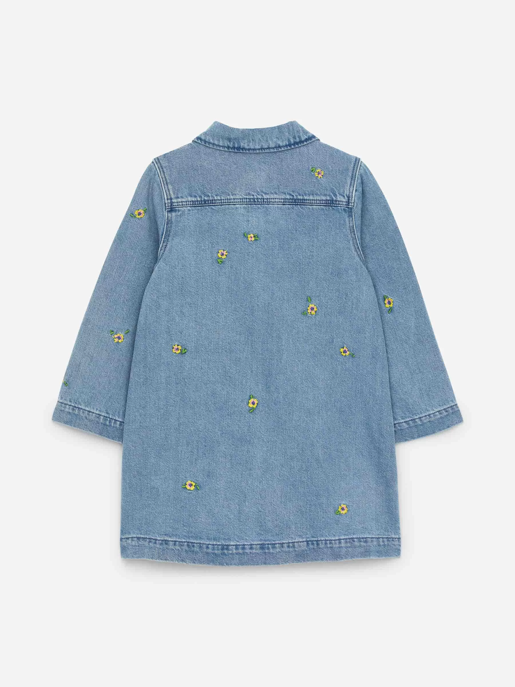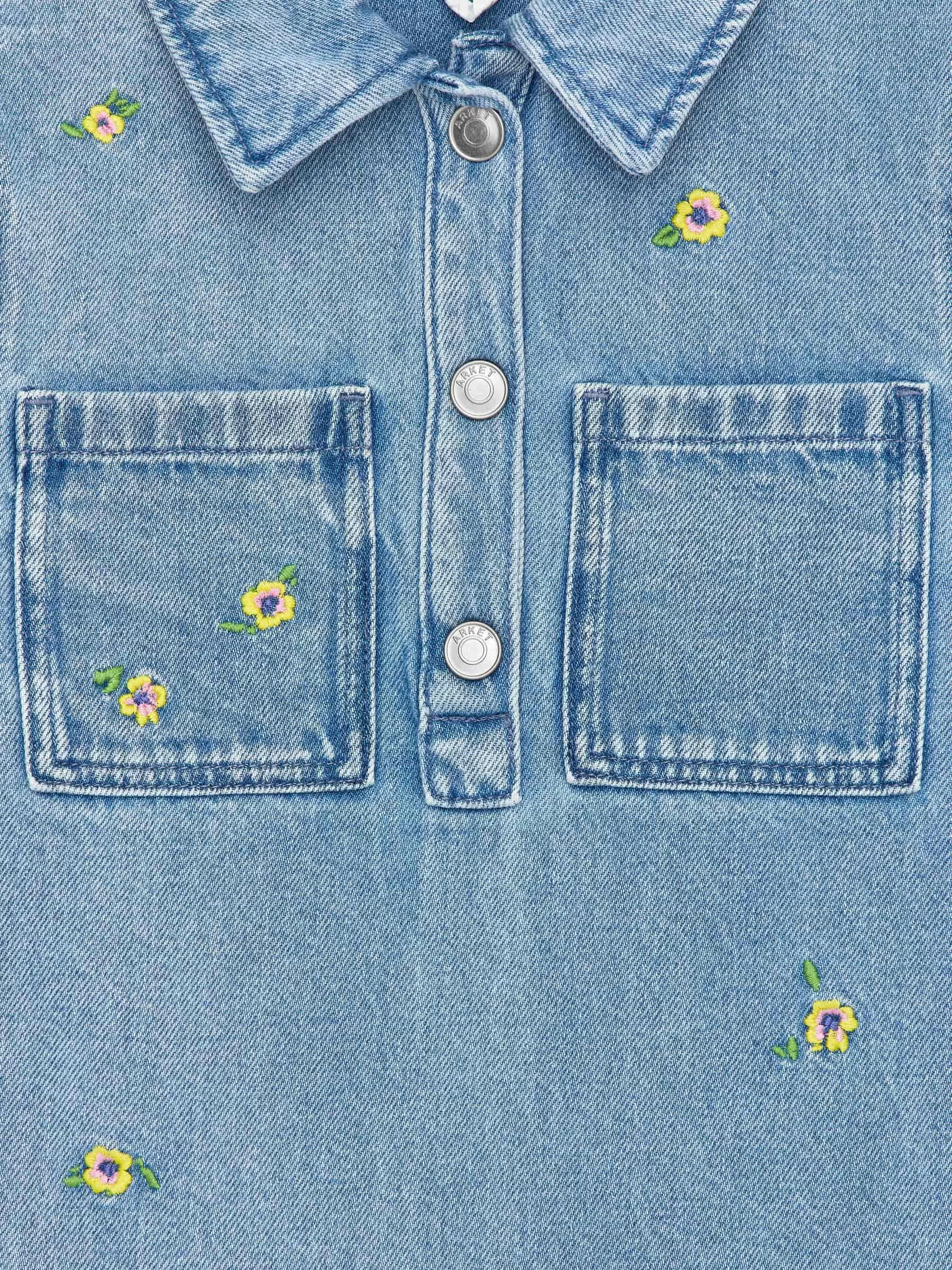 Langärmliges Jeanskleid aus Baumwolle. Aufgesetzte Taschen auf der Brust und Knopfleiste vorne mit Druckknöpfen.