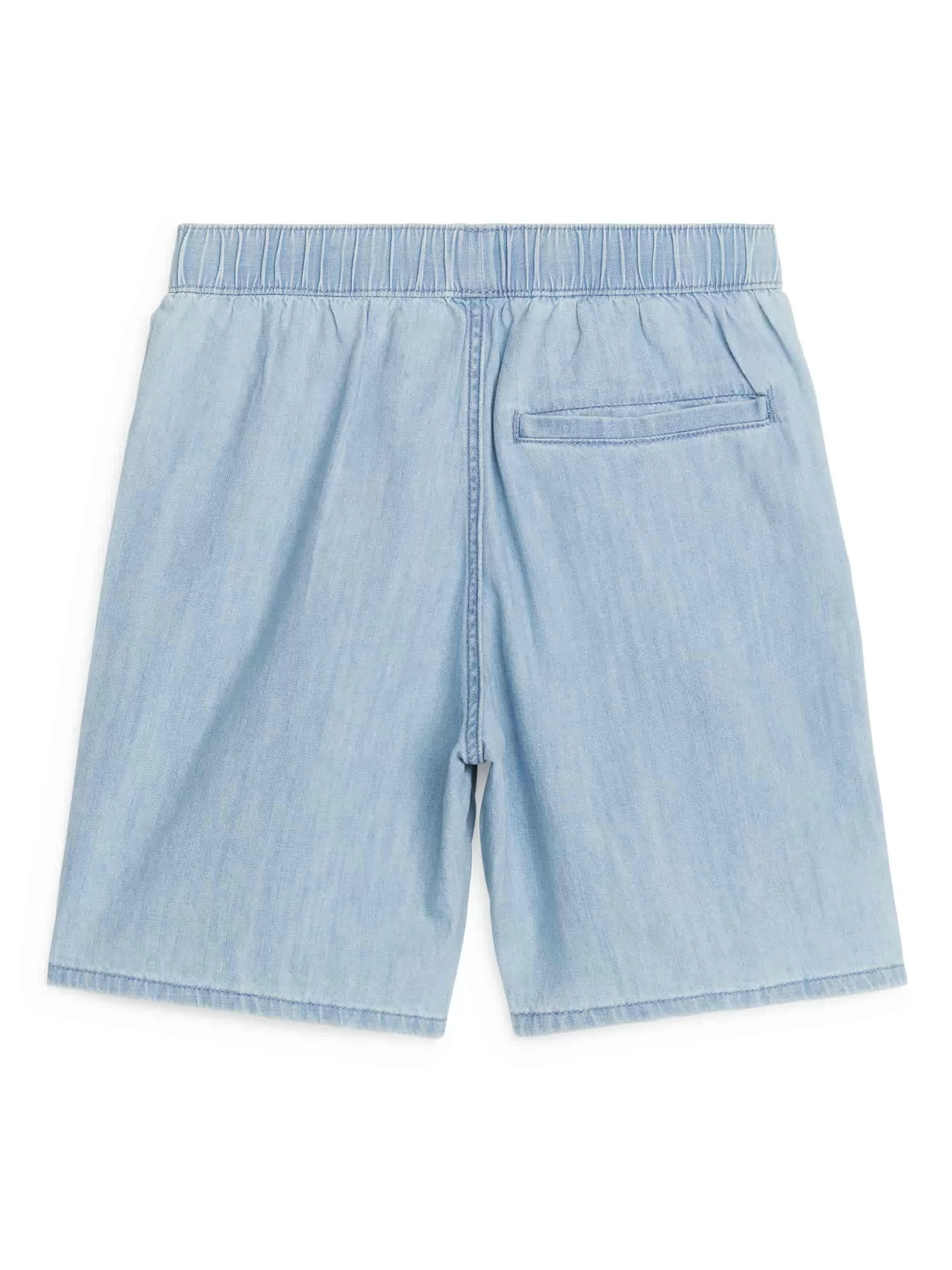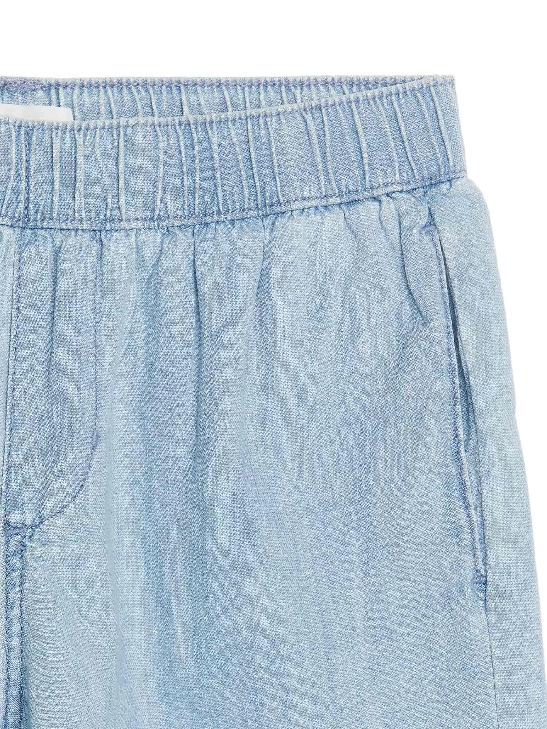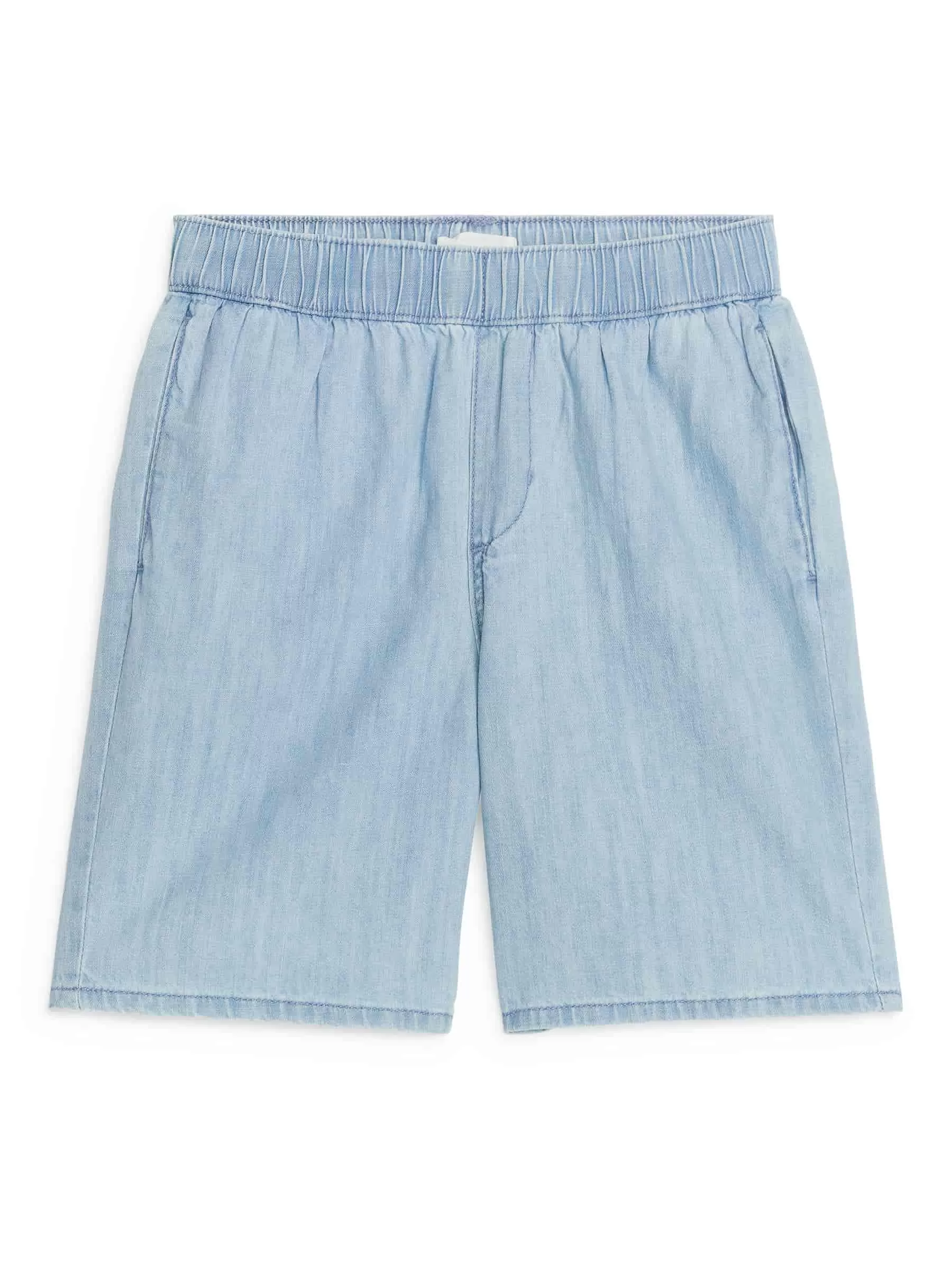 Jeansshorts mit entspannter Passform aus leichtem Baumwoll-Denim-Webstoff. Ein Pull-on-Stil mit verstellbarem Gummizug in der Taille, seitlichen Nahttaschen und einer einzelnen Leistentasche hinten. Der Schnitt reicht bis über das Knie. Falsche Fliege. Teil des Sets.